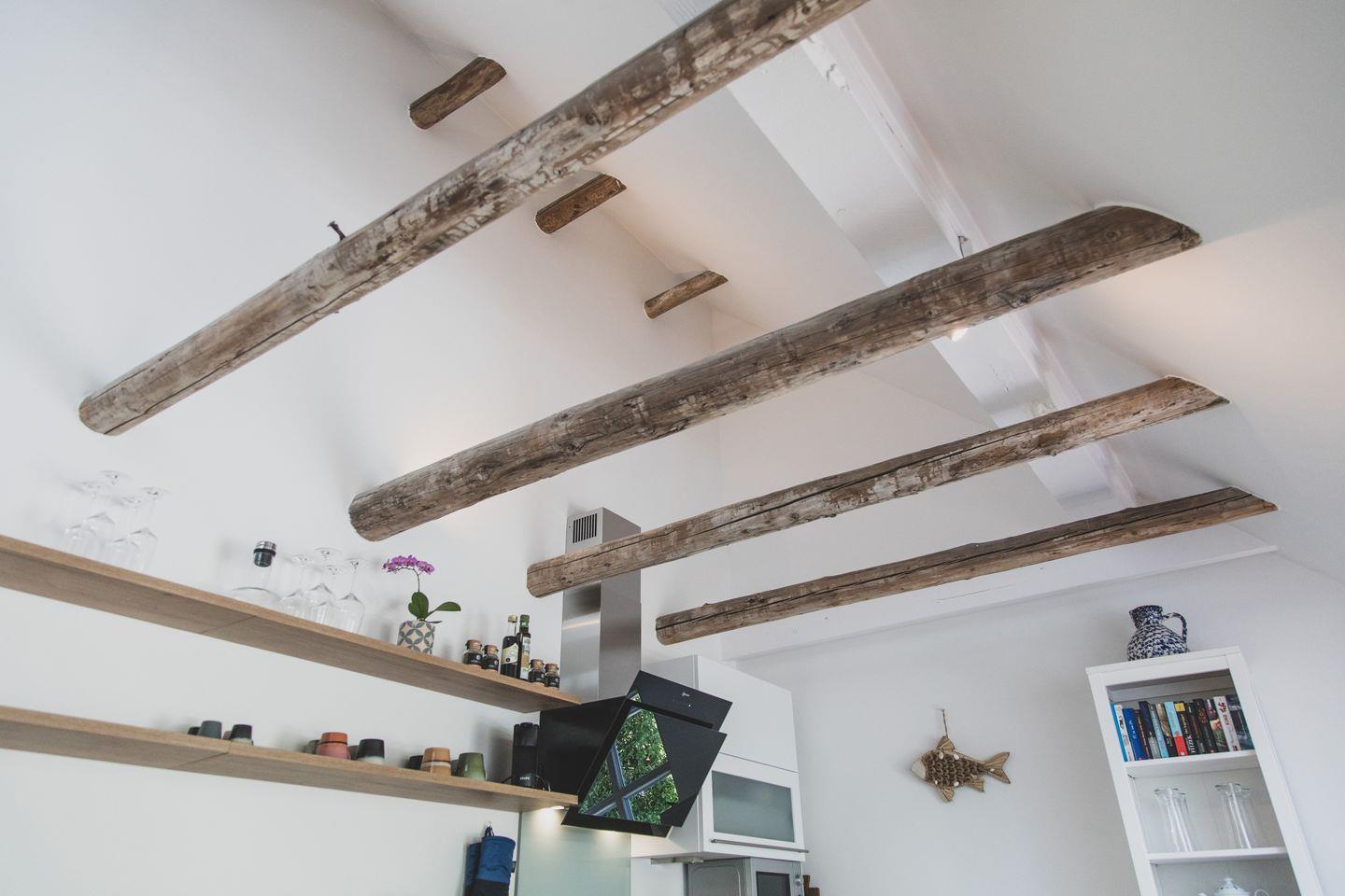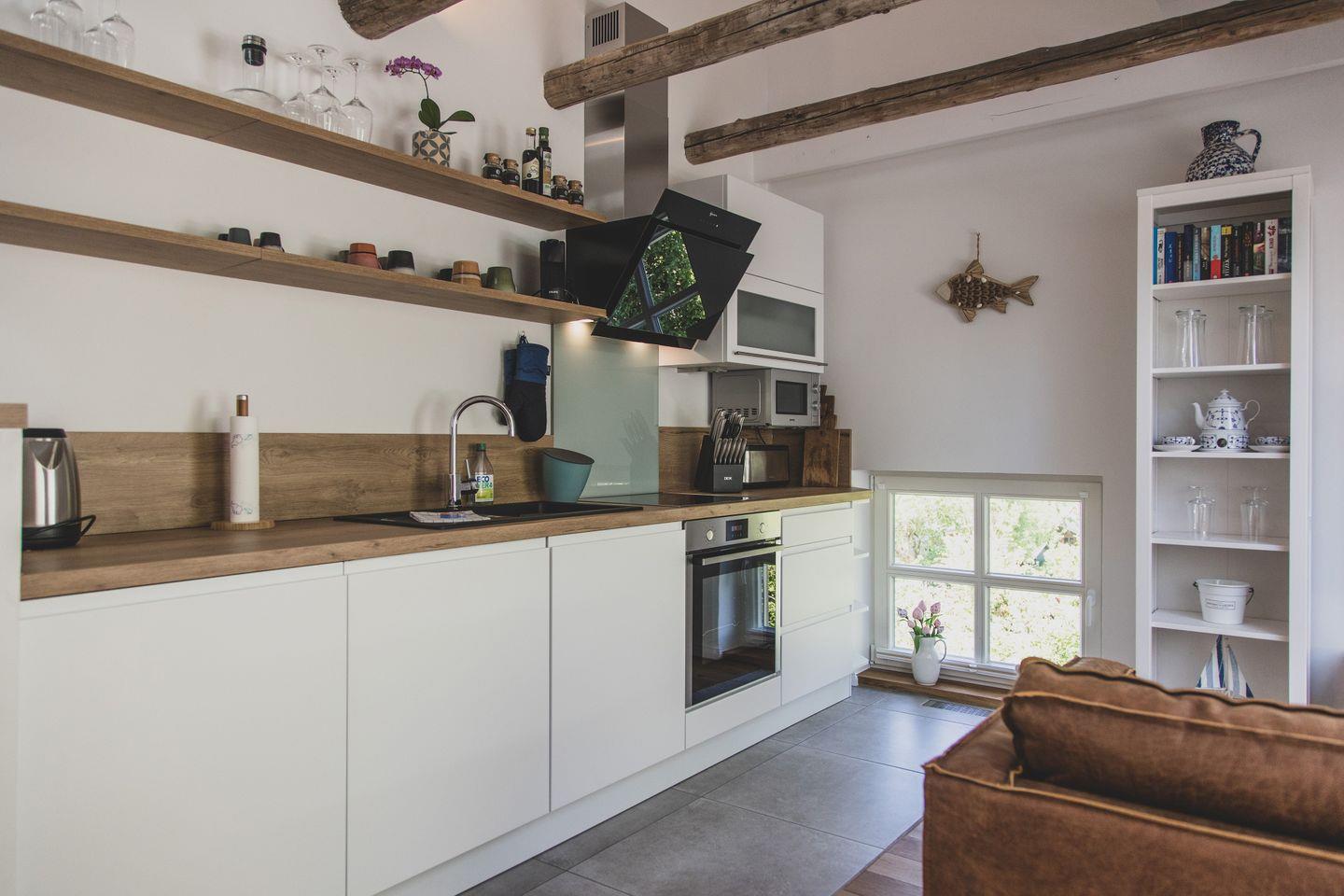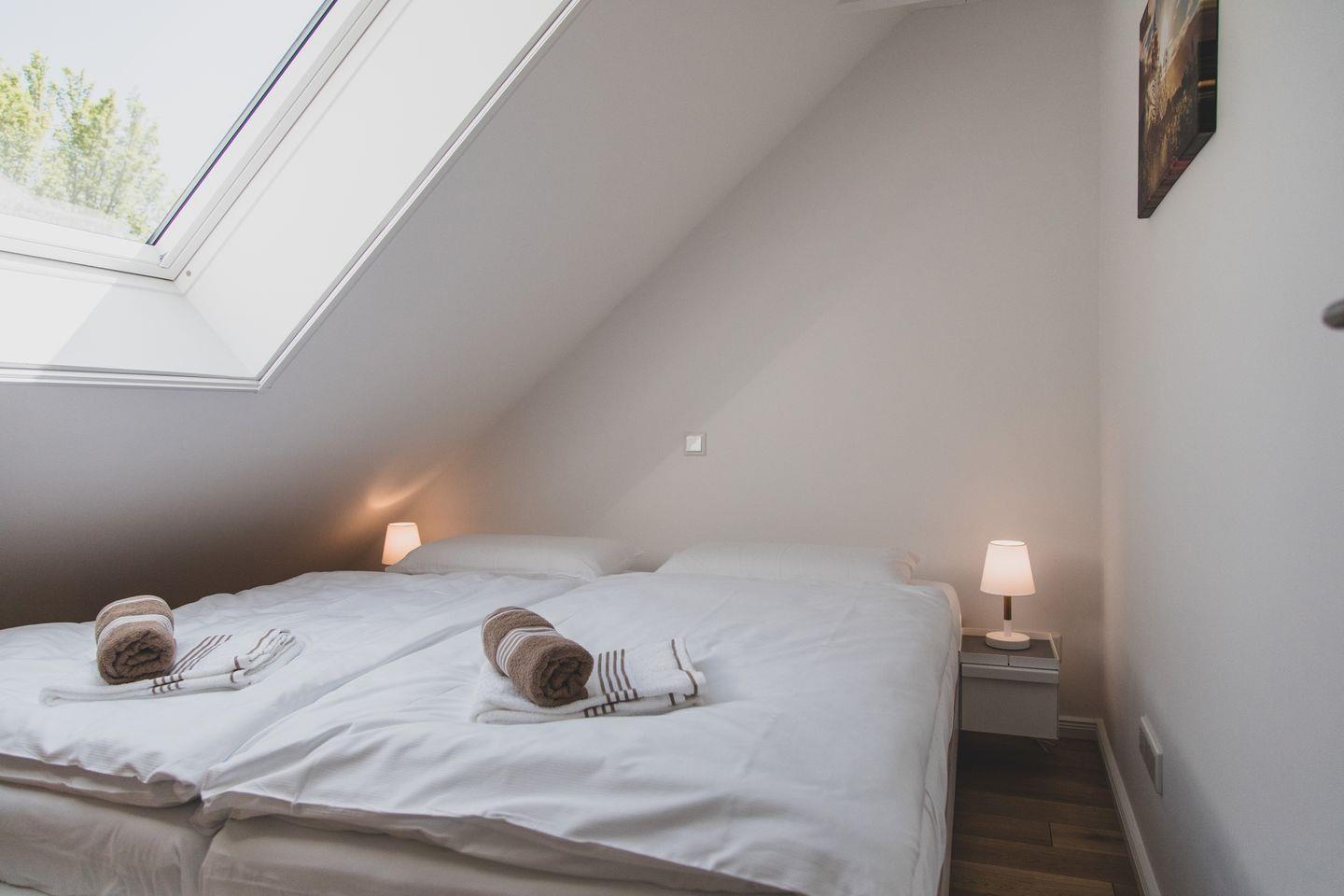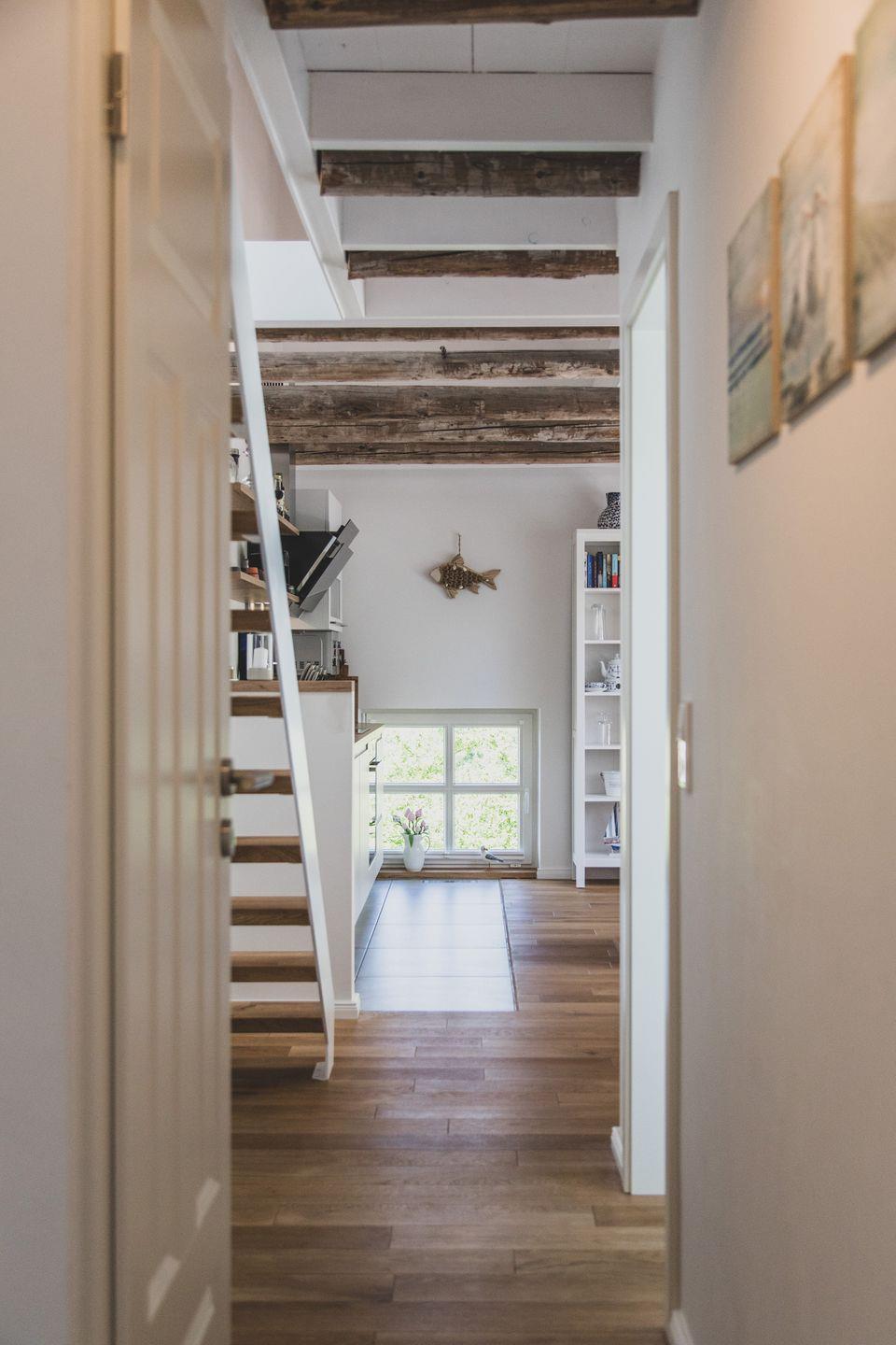 Mit einer Größe von 56 m² findet hier bequem Platz für bis zu vier Personen. Die Ferienwohnung im zweiten OG verfügt über zwei geschmackvoll eingerichtete Schlafzimmer mit hochwertige Parkettböden, die für eine warme Atmosphäre sorgen. In dem lichtdurchfluteten Wohnzimmer lädt eine gemütliche Sofaecke zum Entspannen ein, während ein Essbereich, der ausreichend Platz für gesellige Mahlzeiten bietet, dazu einlädt, die Zeit gemeinsam zu genießen. Die moderne Küche ist voll ausgestattet mit allen Annehmlichkeiten, die Sie benötigen: Ein Kühlschrank, Herd, Backofen und sogar eine Spülmaschine stehen Ihnen zur Verfügung. Genießen Sie Ihren Kaffee aus der bereitgestellten Kaffeemaschine auf dem "Balkon" oder der Terrasse im Garten.