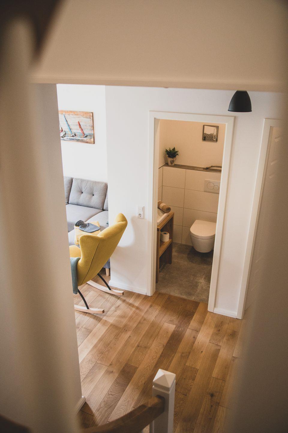 Mit einer Größe von 71 m² bietet die Ferienwohnung alles, was Sie für einen erholsamen Aufenthalt benötigen. Die beiden geschmackvoll eingerichteten Schlafzimmer, beide mit Parkettboden ausgestattet, sorgen für einen geruhsamen Schlaf. Das Badezimmer mit einer bodengleichen Dusche und einem zusätzlichen Gäste-WC ist modern und komfortabel gestaltet, während das großzügige Wohnzimmer mit Sofaecke und einem großen TV zum Entspannen einlädt. Hier können Sie gemeinsame Abende mit einem Film oder guten Gesprächen verbringen.