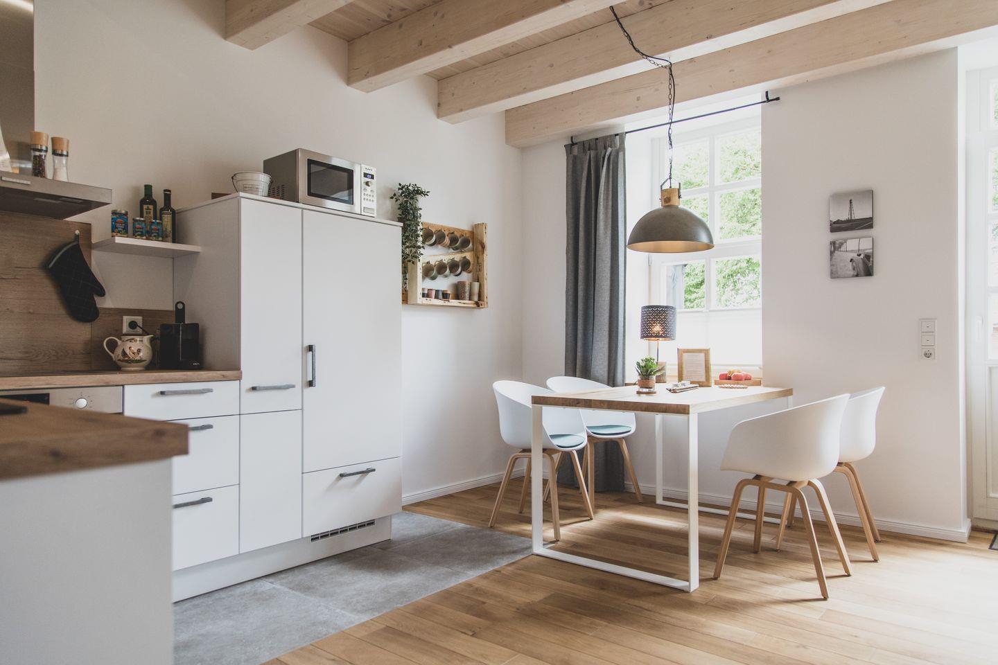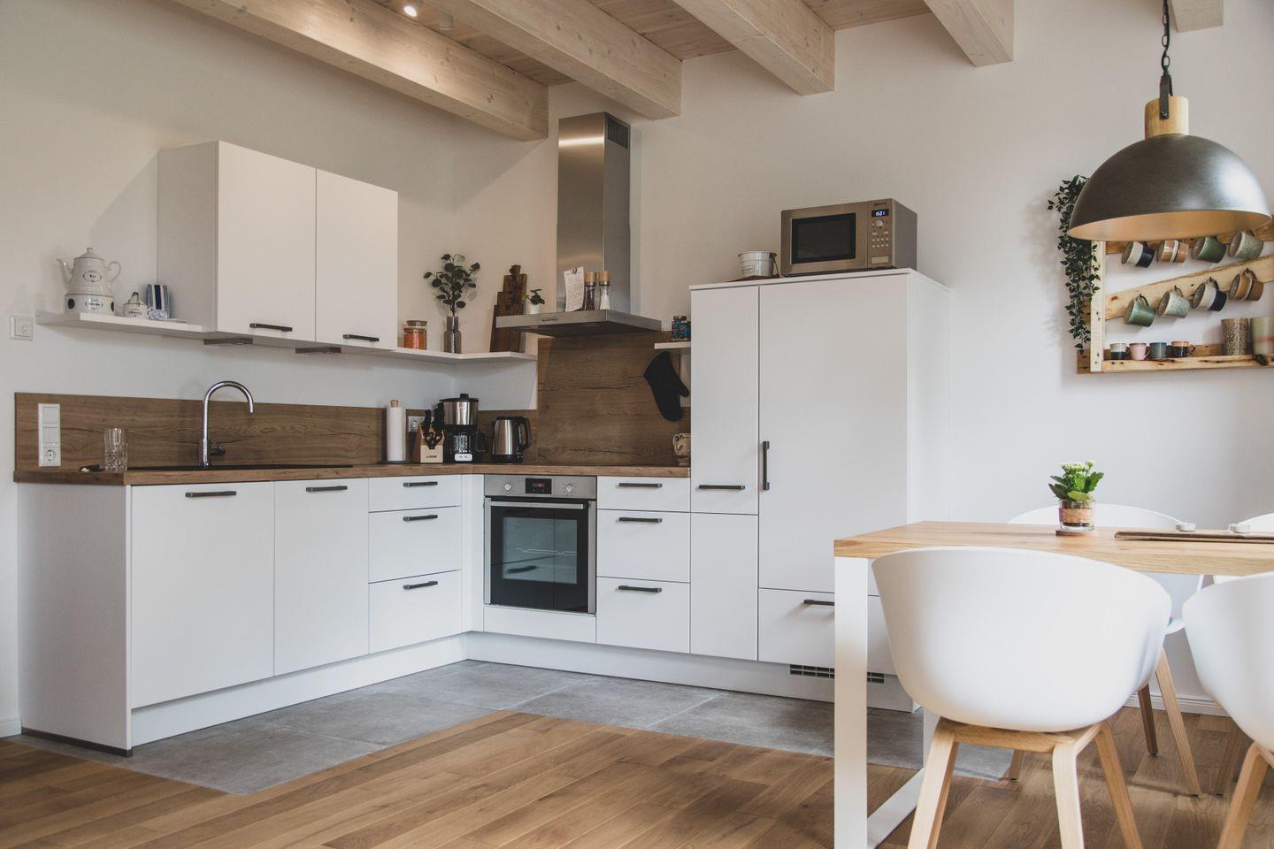 Die offene Küche, die zum Essbereich führt, ist voll ausgestattet und lässt keine Wünsche offen. Egal, ob Sie eine schnelle Mahlzeit zubereiten oder ein ausgiebiges Festmahl für Ihre Liebsten kochen möchten, hier finden Sie alles von einer Induktionskochplatte über einen Backofen bis hin zu einer Nespresso-Maschine. Nach dem Essen können Sie auf der großzügigen Terrasse die frische Luft genießen und die idyllische Landschaft bewundern.