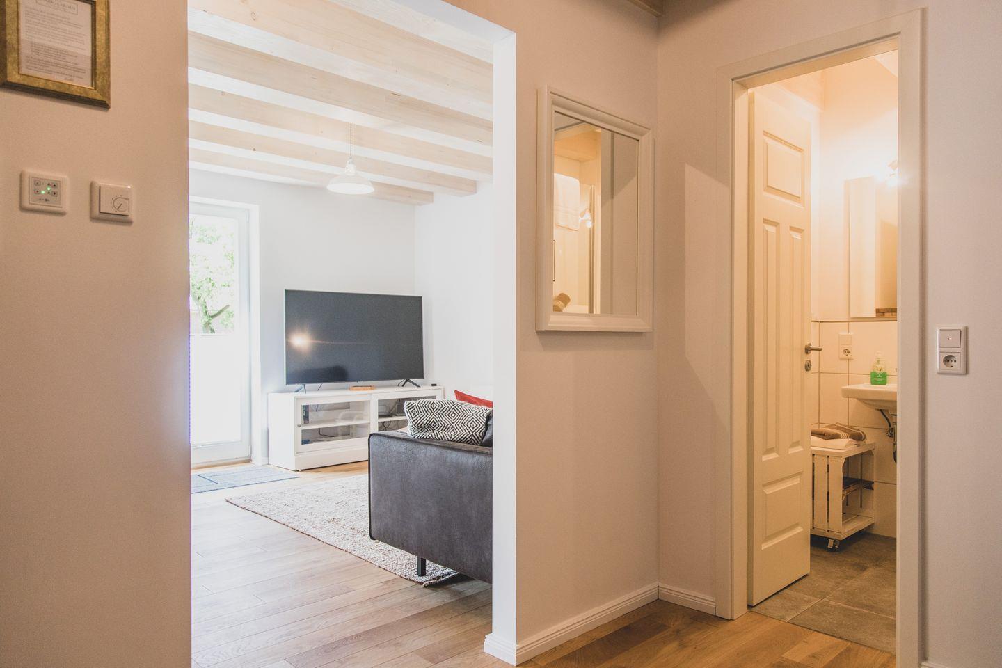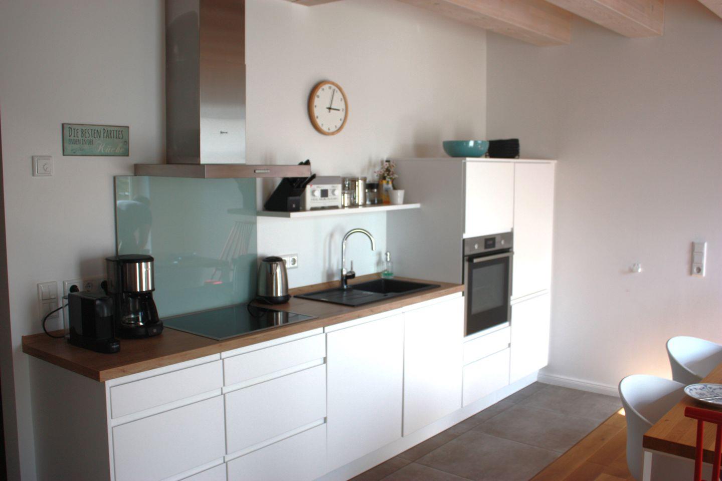 Die vollausgestattete Küche lässt mit hochwertigem Geschirr, Mikrowelle und Caffissimomaschine keine Wünsche offen. Im großzügigen Eingangsbereich befindet sich ebenfalls ein Bad mit Dusche.