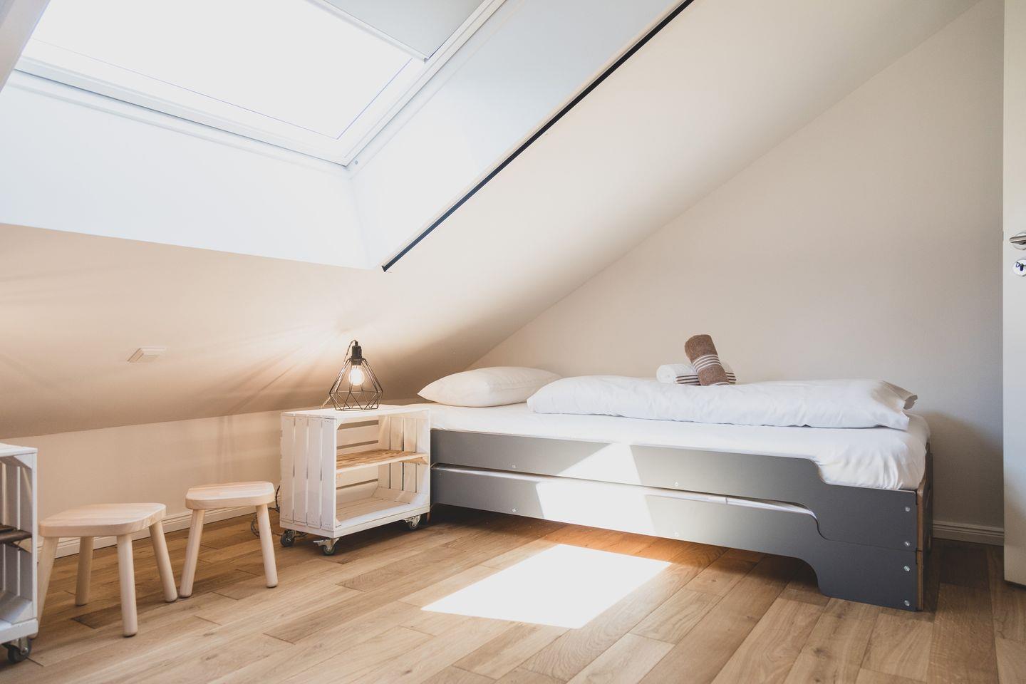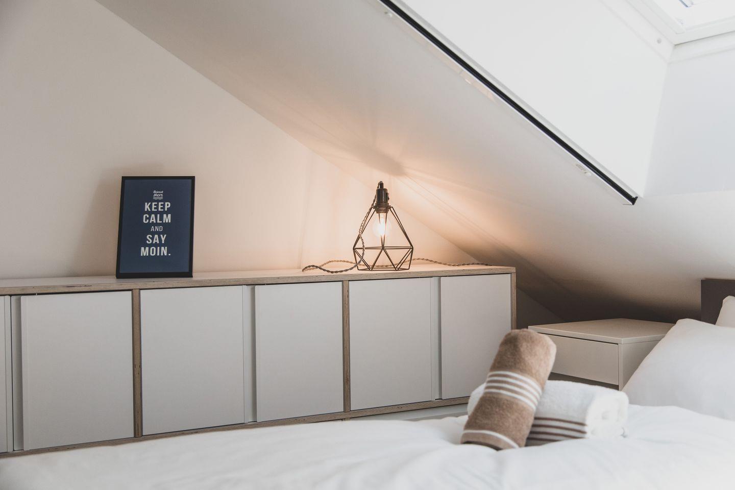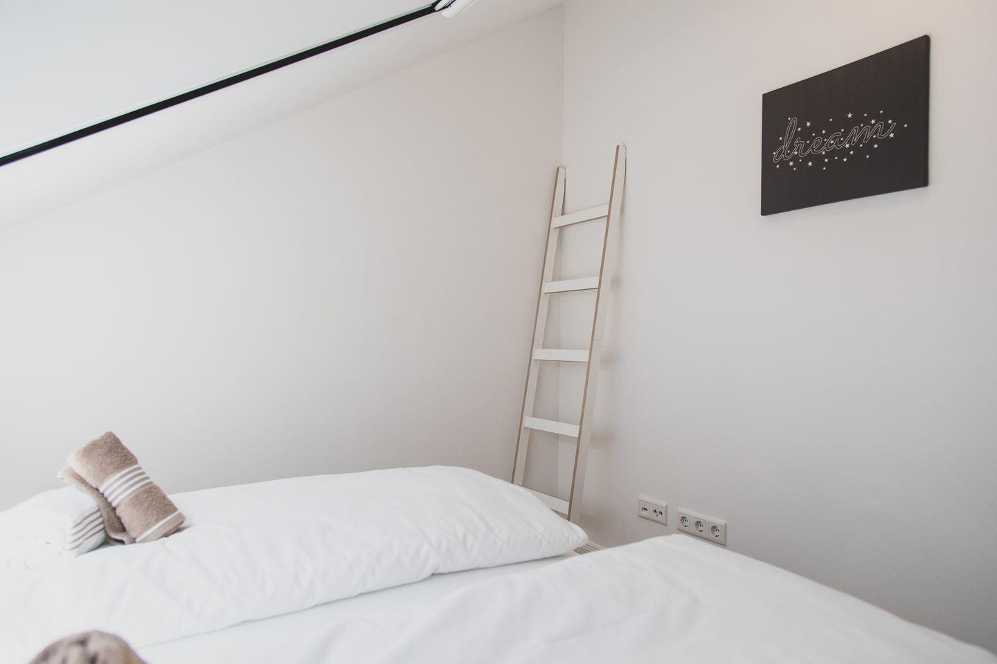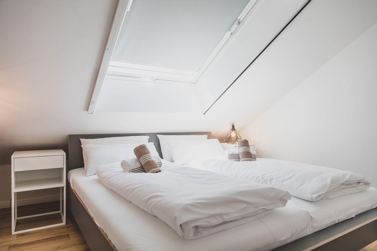 Im Obergeschoss befinden sich zwei Schlafzimmer sowie ein geräumiges Bad mit Dusche. Im Schlafzimmer 1 befindet sich ein Doppelbett, Schlafzimmer 2 bietet Platz für bis zu drei (ggf. auch vier) Kinder. Alternativ kann die Wohnung auch von 4 erwachsenen Feriengästen genutzt werden, da in Schlafzimmer 2 auch ein Doppelbett darstellbar ist. Beide Schlafzimmer verfügen über Verdunkelungs- und Insektenschutzrollos.