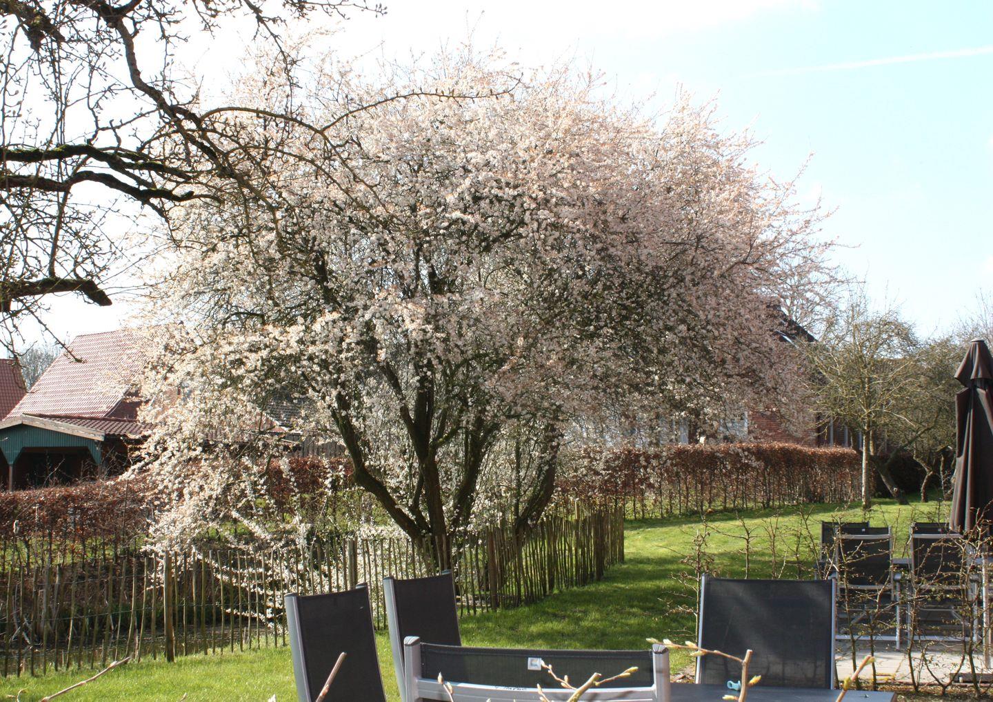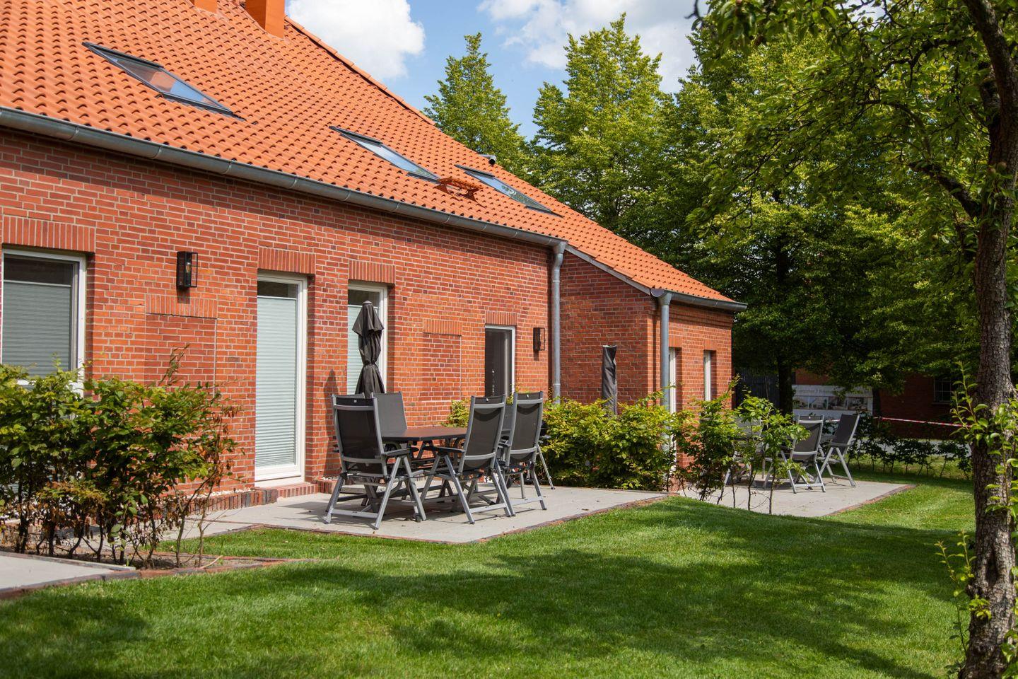 Die nach Süden ausgerichtete Terrasse ist bequem vom Wohnbereich zugänglich und eröffnet einen herrlichen Blick auf die angrenzende Obstwiese und die ostfriesische Landschaft. Gartenmöbel, Sonnenschirm und Grill stehen zur Benutzung bereit.