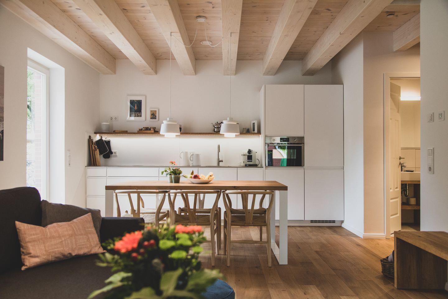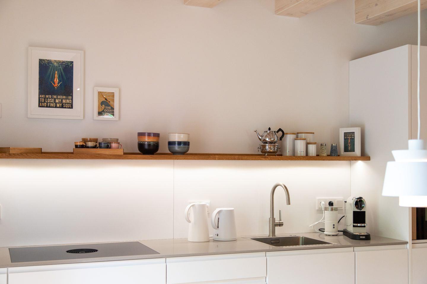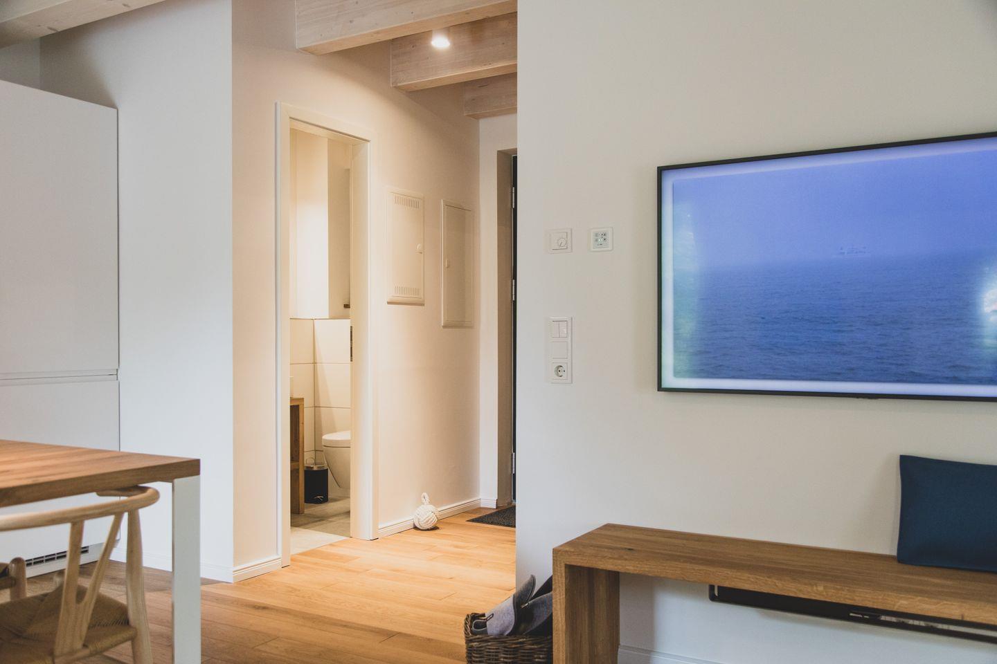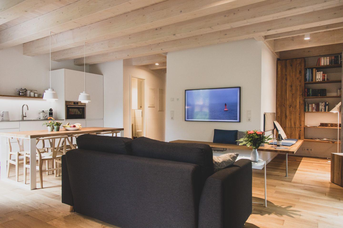 Die Wohnung verfügt über eine gut ausgestattete, offene Küche, die direkt mit dem gemütlichen Wohnzimmer verbunden ist. Hier stehen Ihnen alle wesentlichen Küchenutensilien zur Verfügung, von der Induktionsherdplatte über eine moderne Espressomaschine bis hin zu einer Spülmaschine. Genießen Sie gemeinsame Mahlzeiten im Essbereich oder entspannen Sie einfach auf dem bequemen Sofa im Wohnzimmer, während Sie den 44-55 Zoll großen Fernseher nutzen. Für zusätzlichen Komfort sorgt die Fußbodenheizung, die für eine wohlige Atmosphäre selbst an kühlen Tagen sorgt.