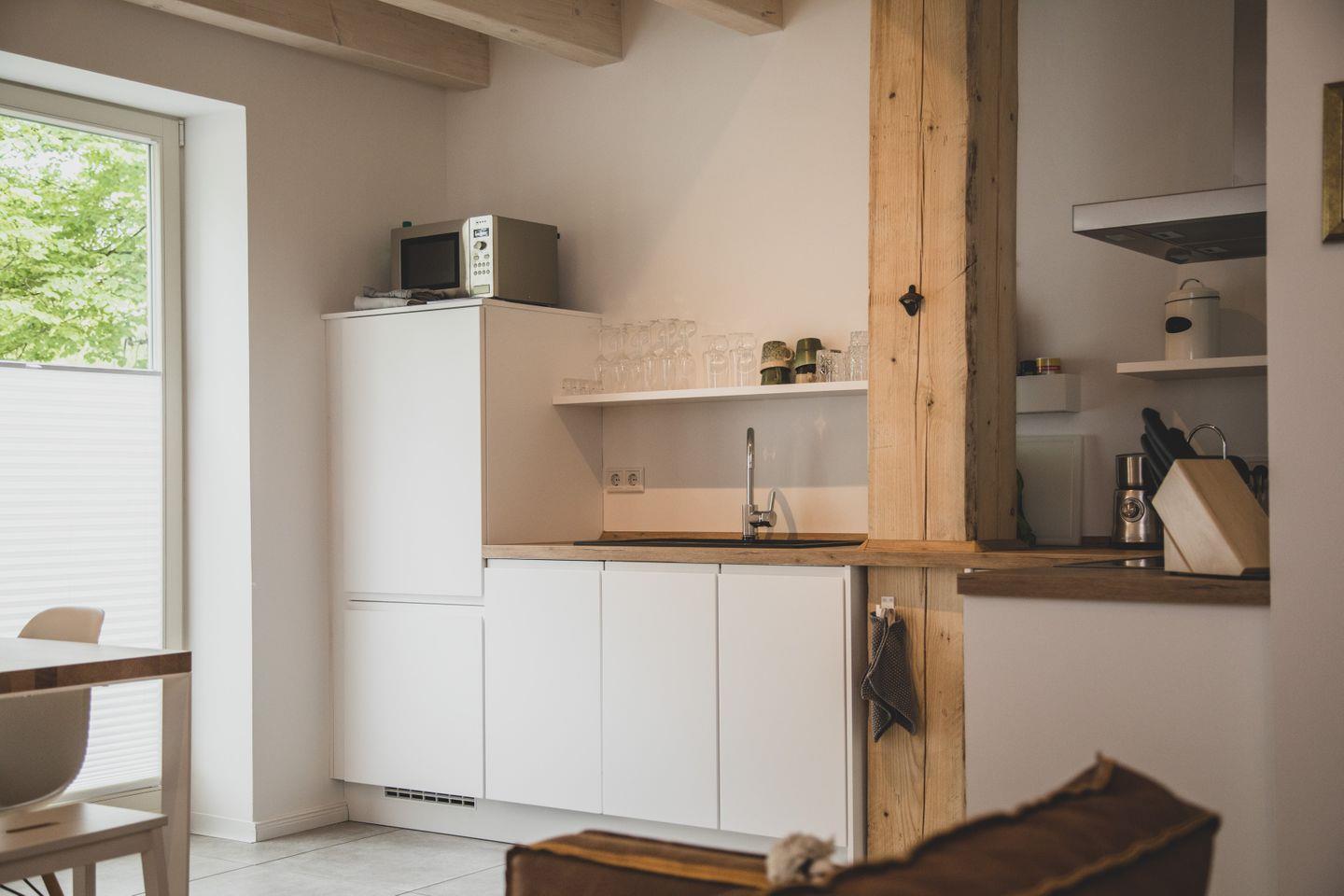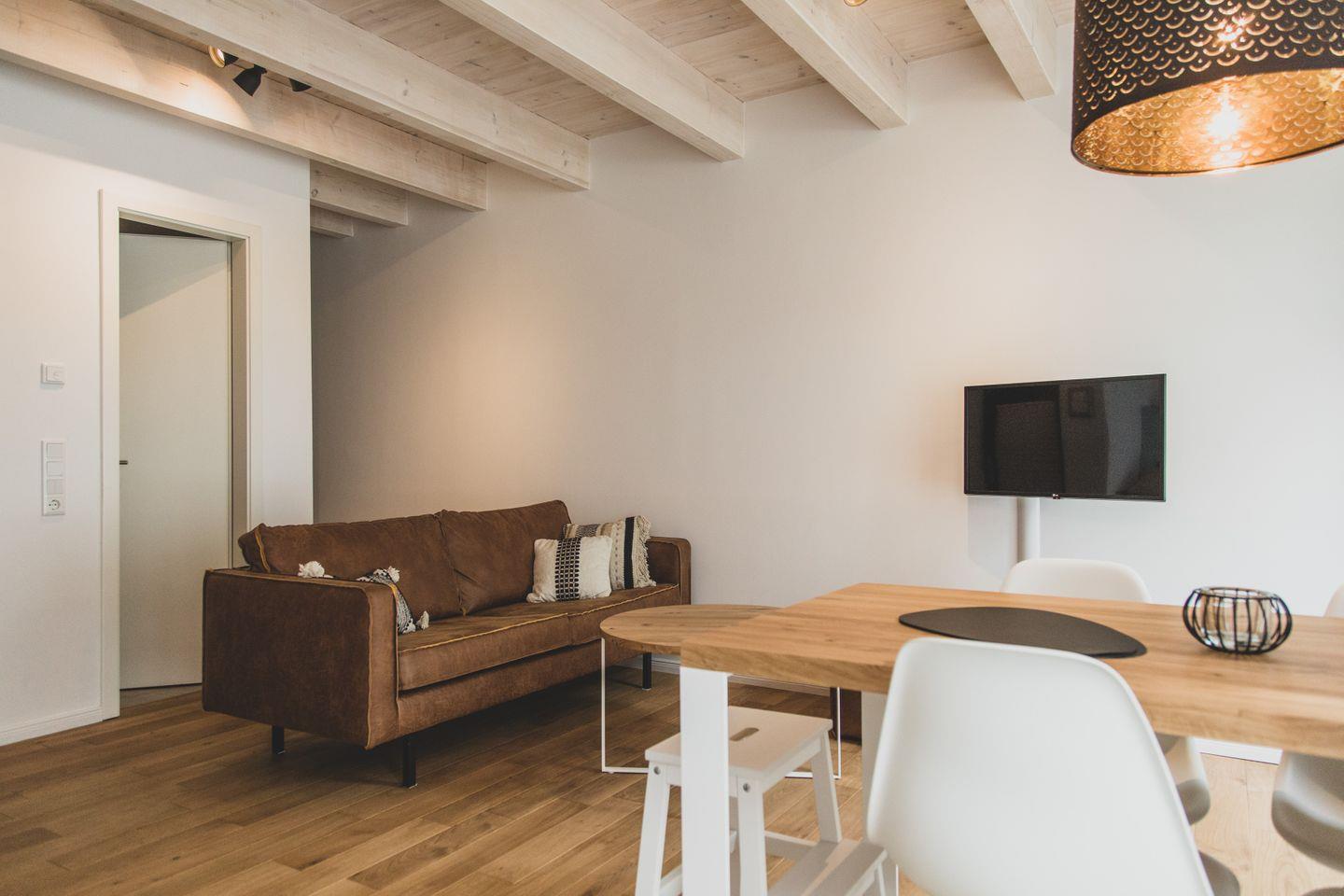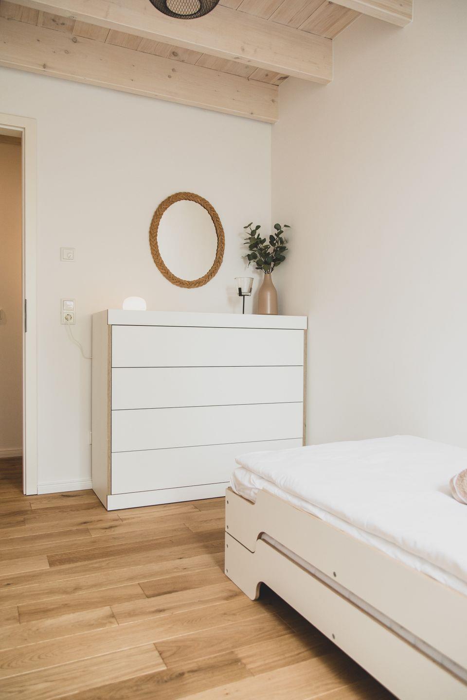 Mit einer großzügigen Fläche von 60 m² bietet die Ferienwohnung Platz für bis zu vier Personen und besteht aus zwei gemütlichen Schlafzimmern. Ideal für kleinere Familien oder zwei Paare, die gemeinsam reisen. Der offene Wohnbereich ist der perfekte Ort, um nach einem erlebnisreichen Tag zu entspannen. Hier finden Sie eine Sofaecke, einen Esstisch sowie eine moderne Küche, die komplett ausgestattet ist – vom Herd über die Spülmaschine bis hin zur Nespresso-Espressomaschine erwartet Sie alles, was Sie für Ihre kulinarischen Kreationen benötigen.