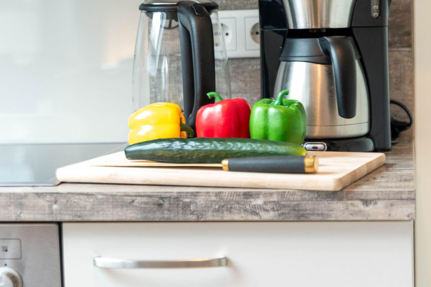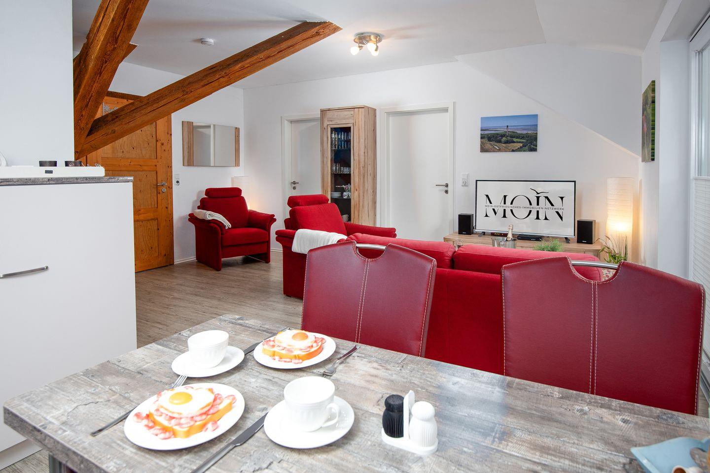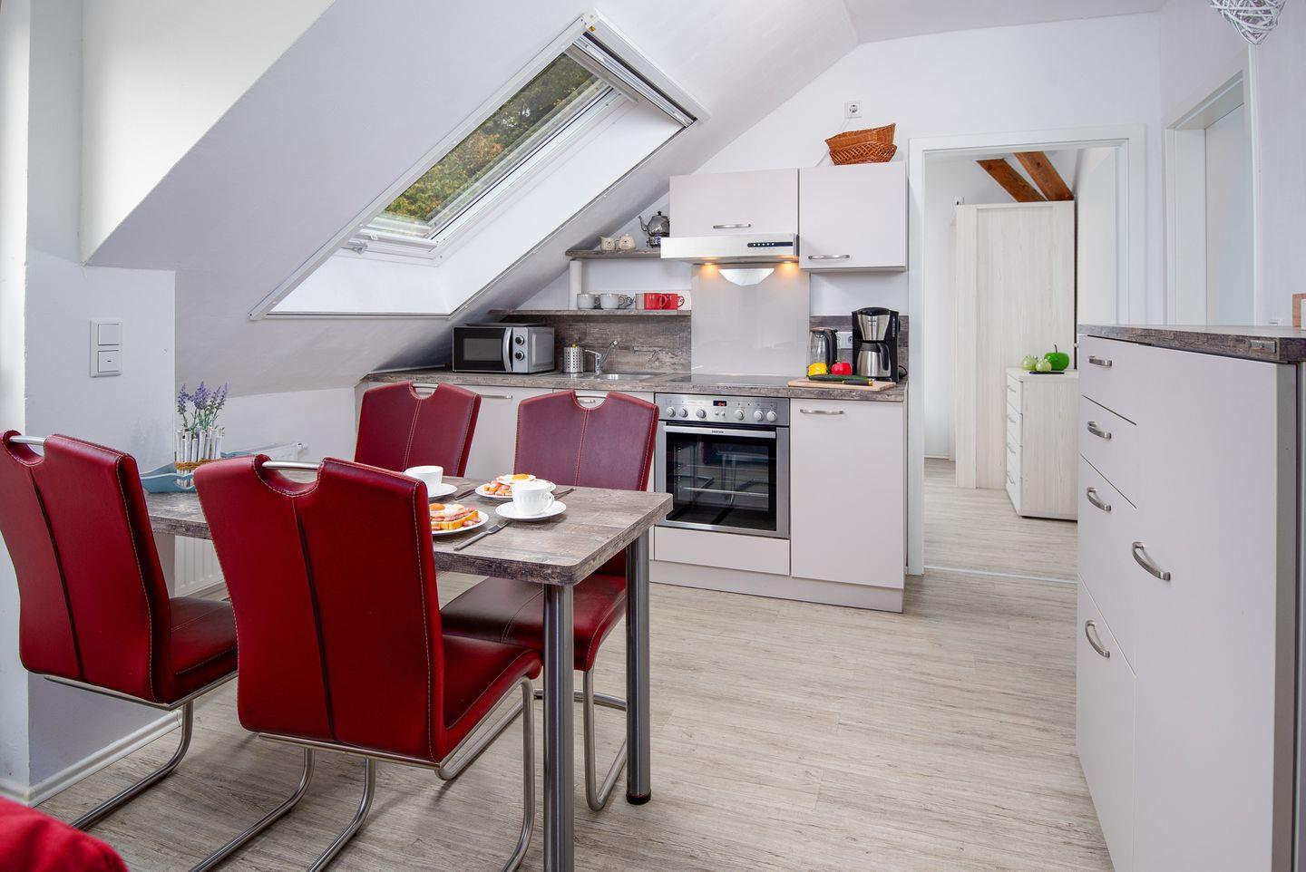 Die Wohnung verfügt über eine voll ausgestattete Küche, in der Sie Ihre Lieblingsmahlzeiten zubereiten können. Der großzügige Essbereich lädt zu geselligen Mahlzeiten ein. Im Wohnbereich finden Sie ein bequemes Sofa und einen Sessel, auf denen Sie sich nach einem erlebnisreichen Tag entspannen können. Genießen Sie einen gemütlichen Abend vor dem Fernseher oder tauschen Sie sich über die Erlebnisse des Tages aus.