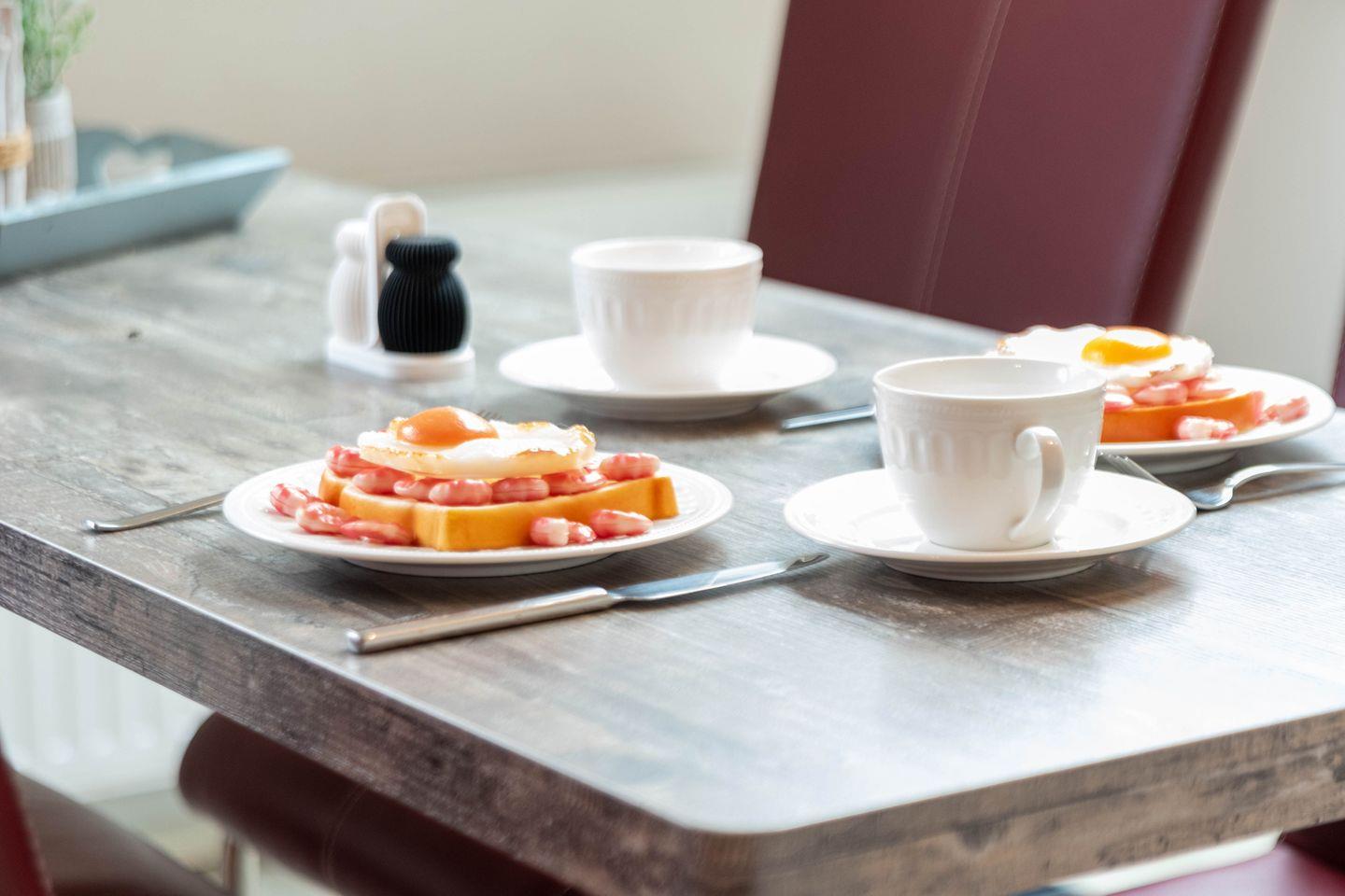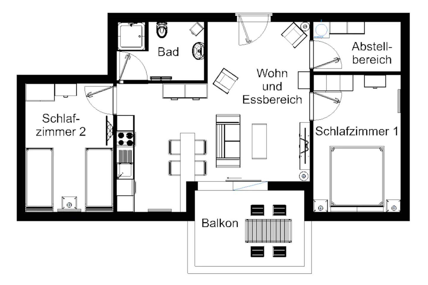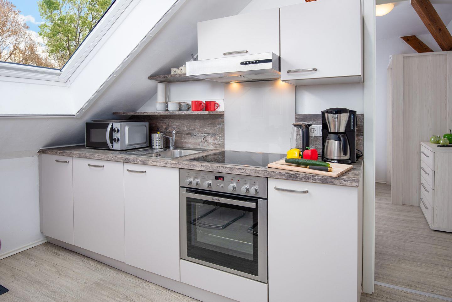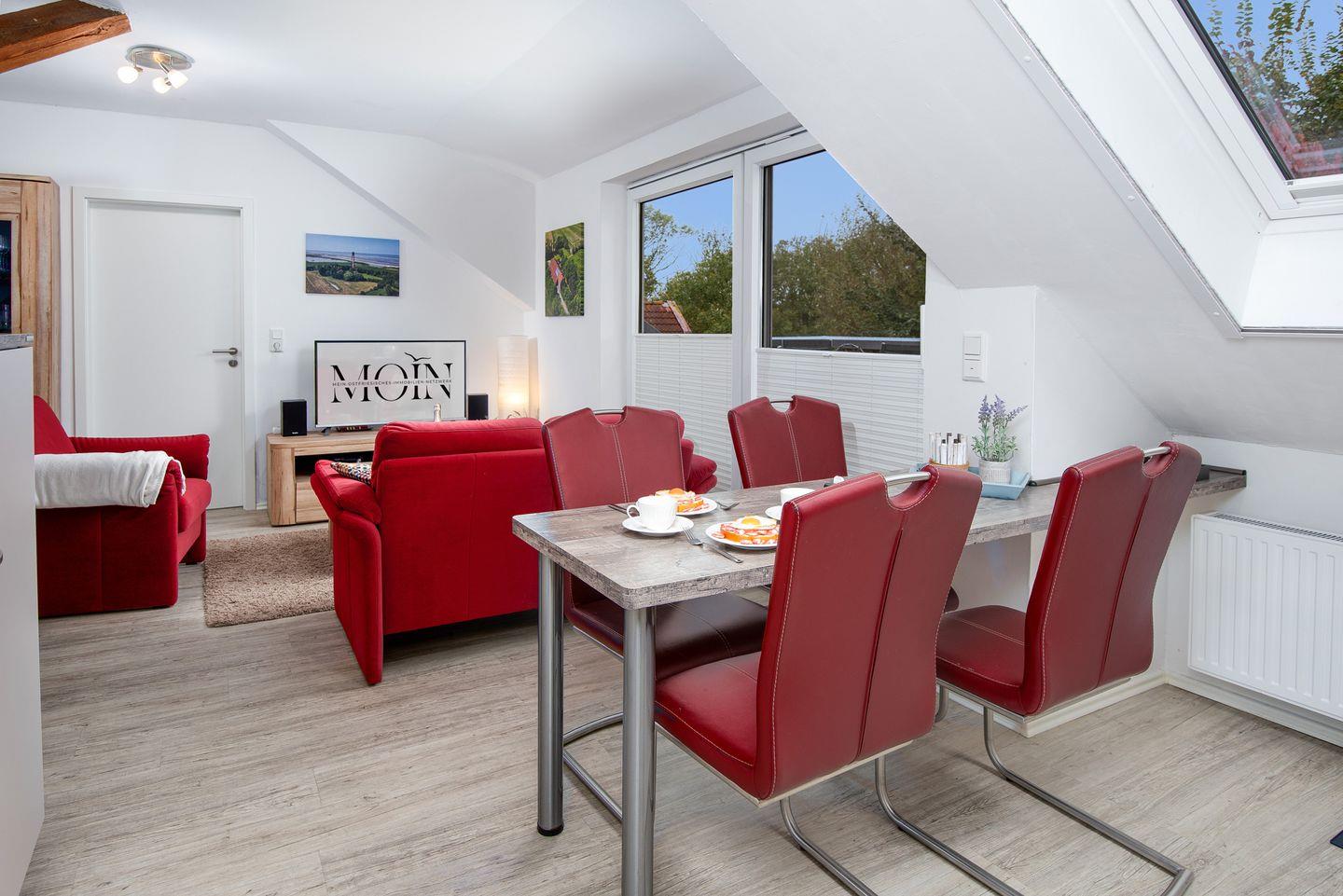 Die Wohnung verfügt über eine voll ausgestattete Küche, in der Sie Ihre Lieblingsmahlzeiten zubereiten können. Der großzügige Essbereich lädt zu geselligen Mahlzeiten ein. Im Wohnbereich finden Sie ein bequemes Sofa und einen Sessel, auf denen Sie sich nach einem erlebnisreichen Tag entspannen können. Genießen Sie einen gemütlichen Abend vor dem Fernseher oder tauschen Sie sich über die Erlebnisse des Tages aus.