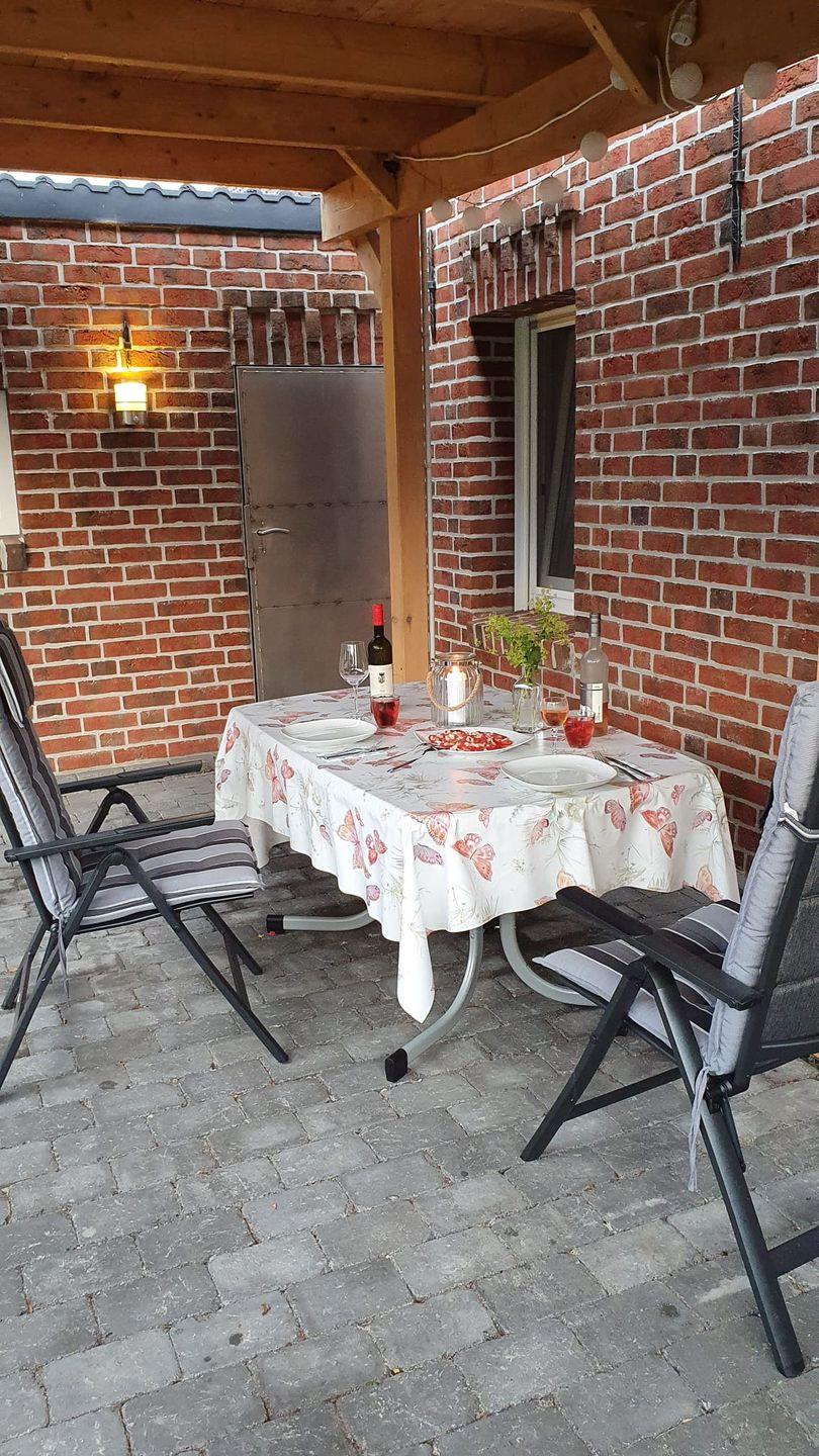 Gemütliches Friesenhaus 'Lüttje Huus an't Diek' nahe der Nordsee mit Kamin und überdachter Terrasse.