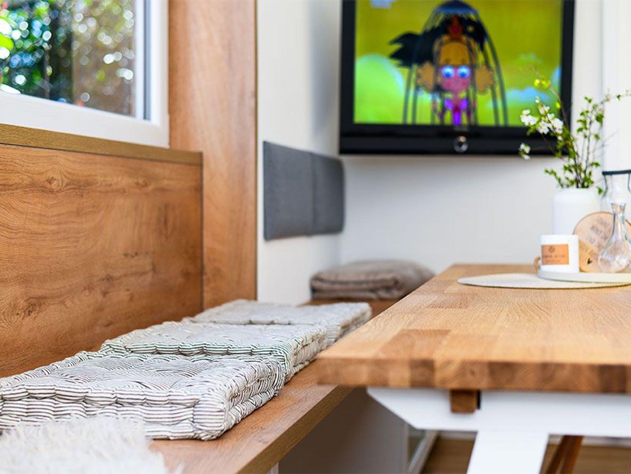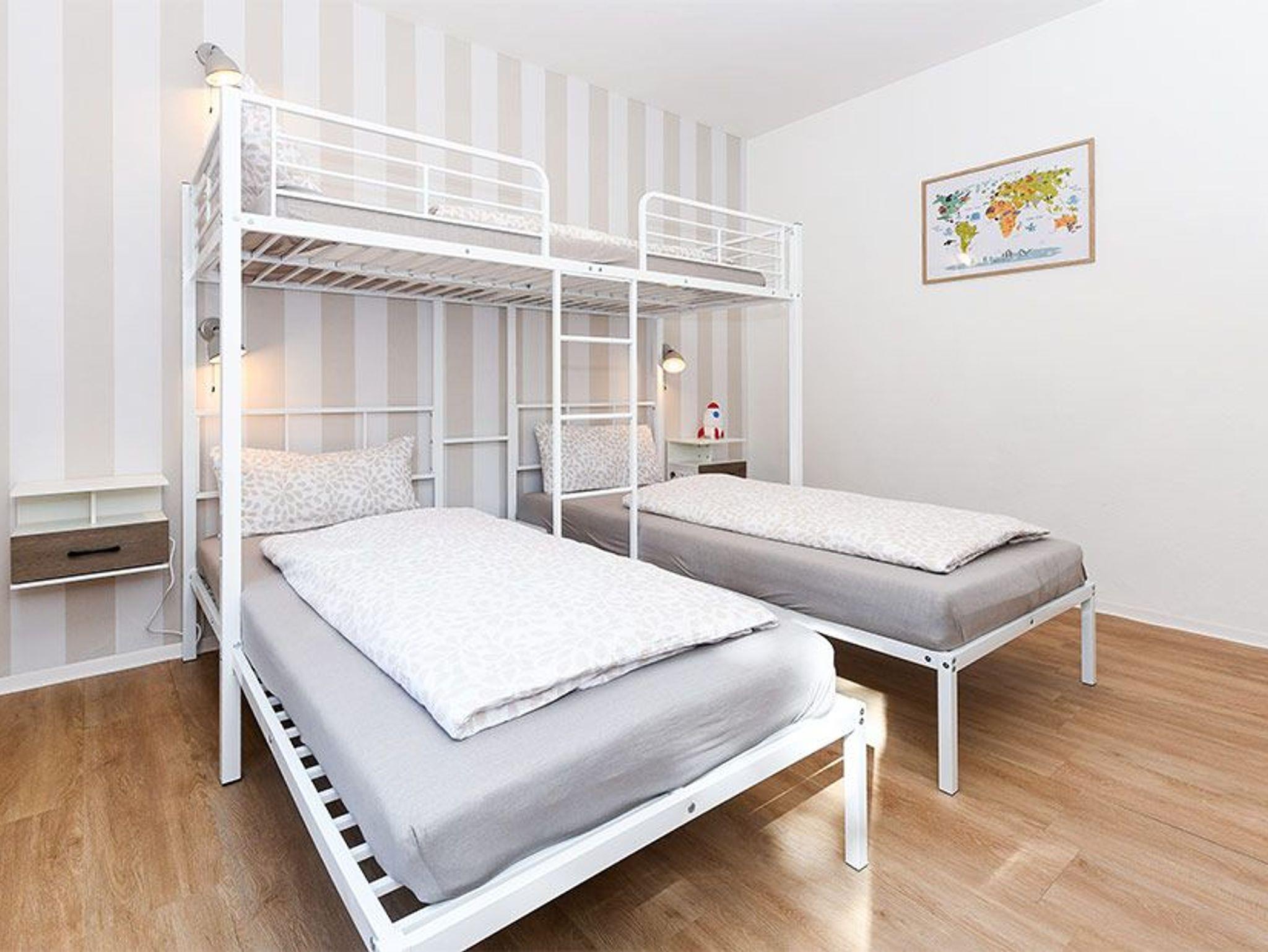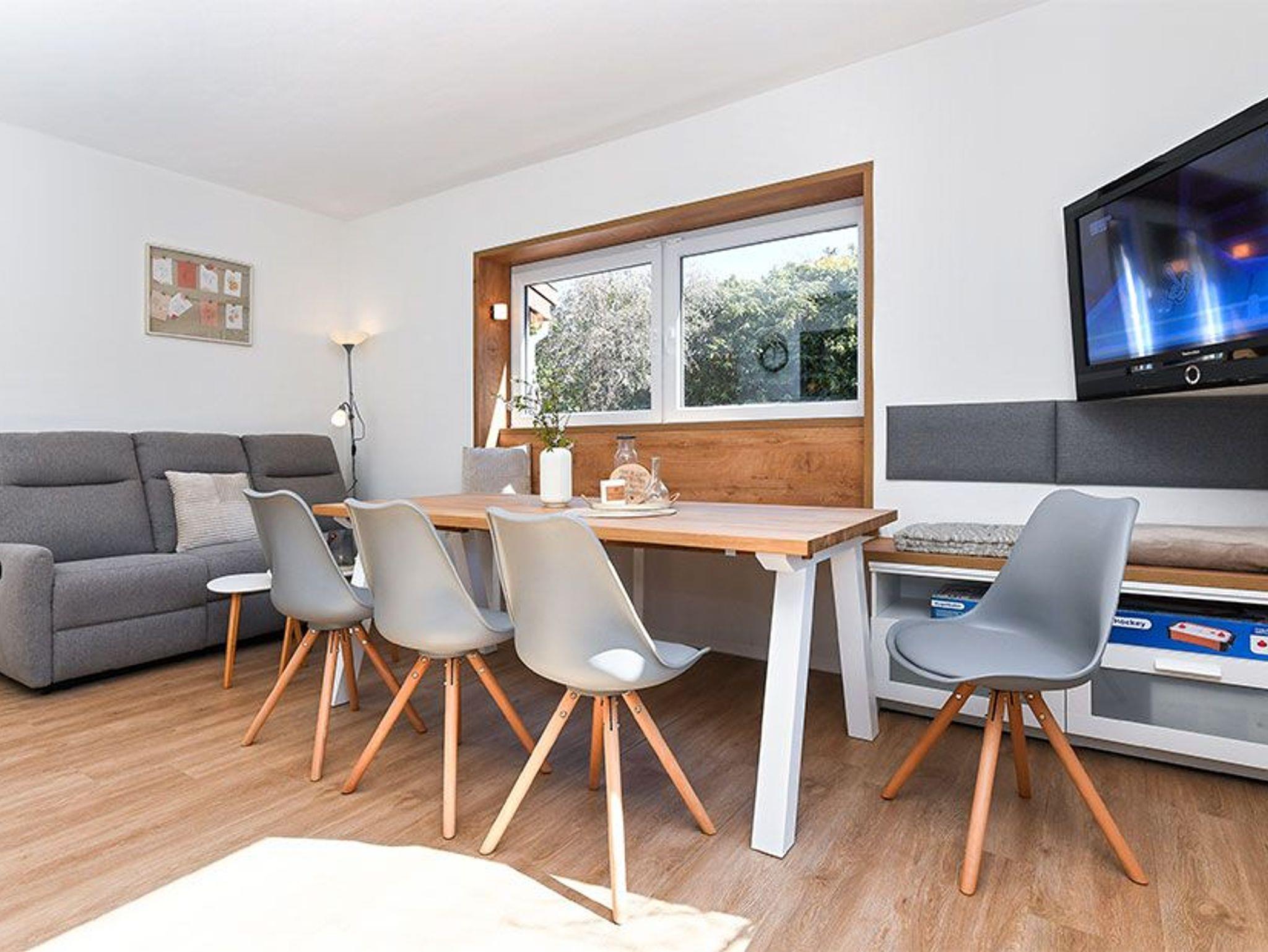 Größe: ca. 75 Quadratmeter, Wohnküche mit Ess-, Wohn- und Küchenbereich, Schlafzimmer, zweites separates Schlafzimmer, Kinderzimmer, Badezimmer mit Dusche, Waschtisch und WC, Erdgeschoss, Terrasse, optimal für 1 bis 7 Personen und zusätzlich ein Kleinkind.
