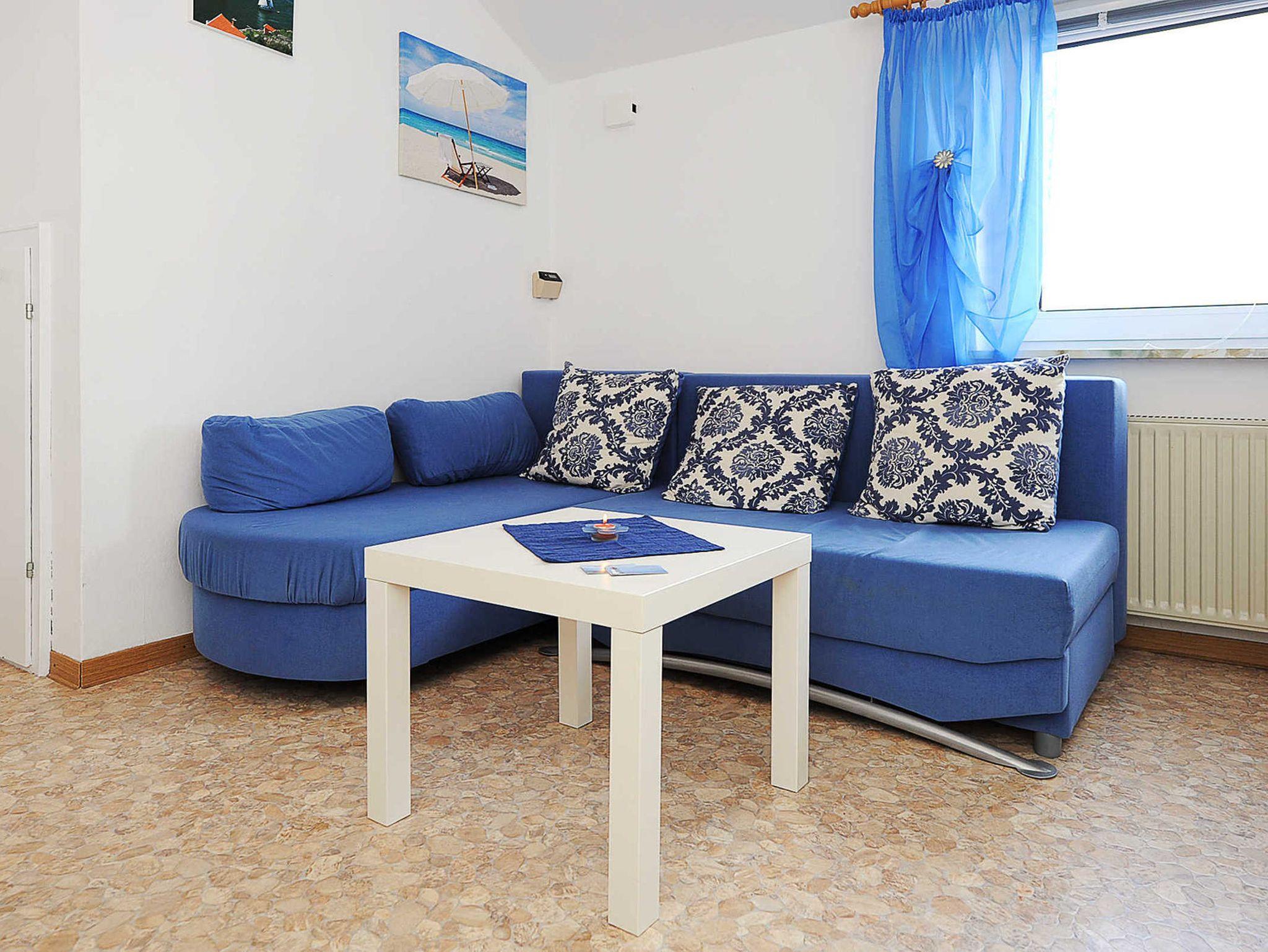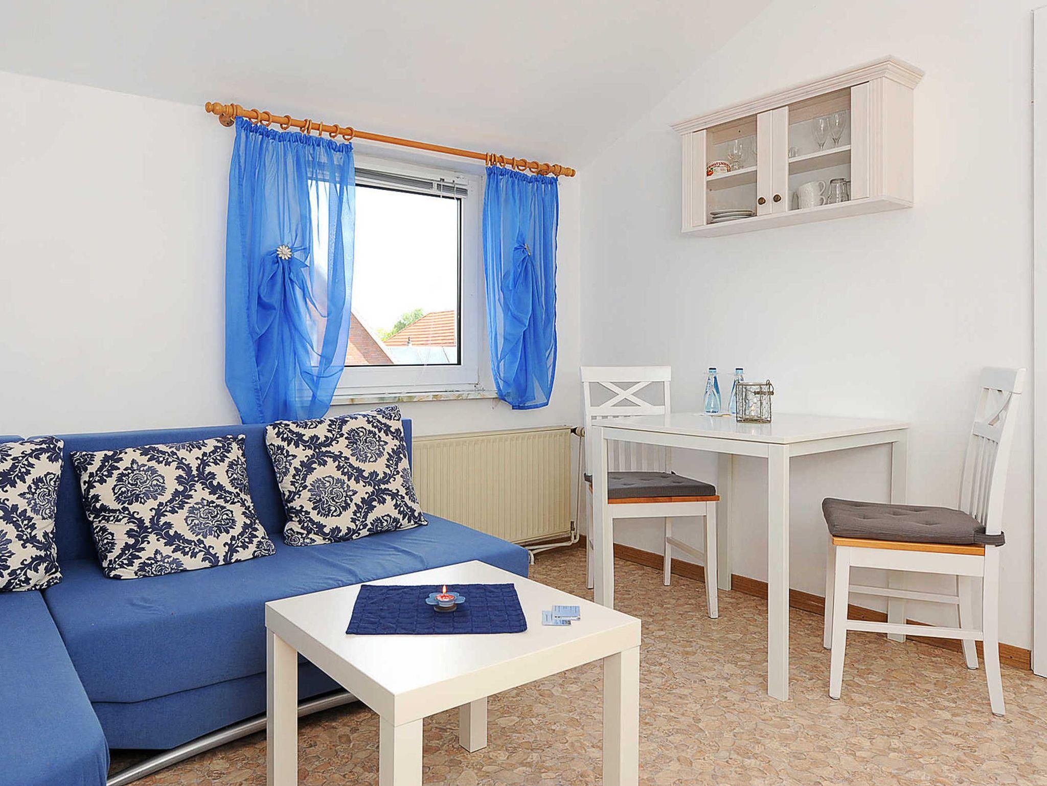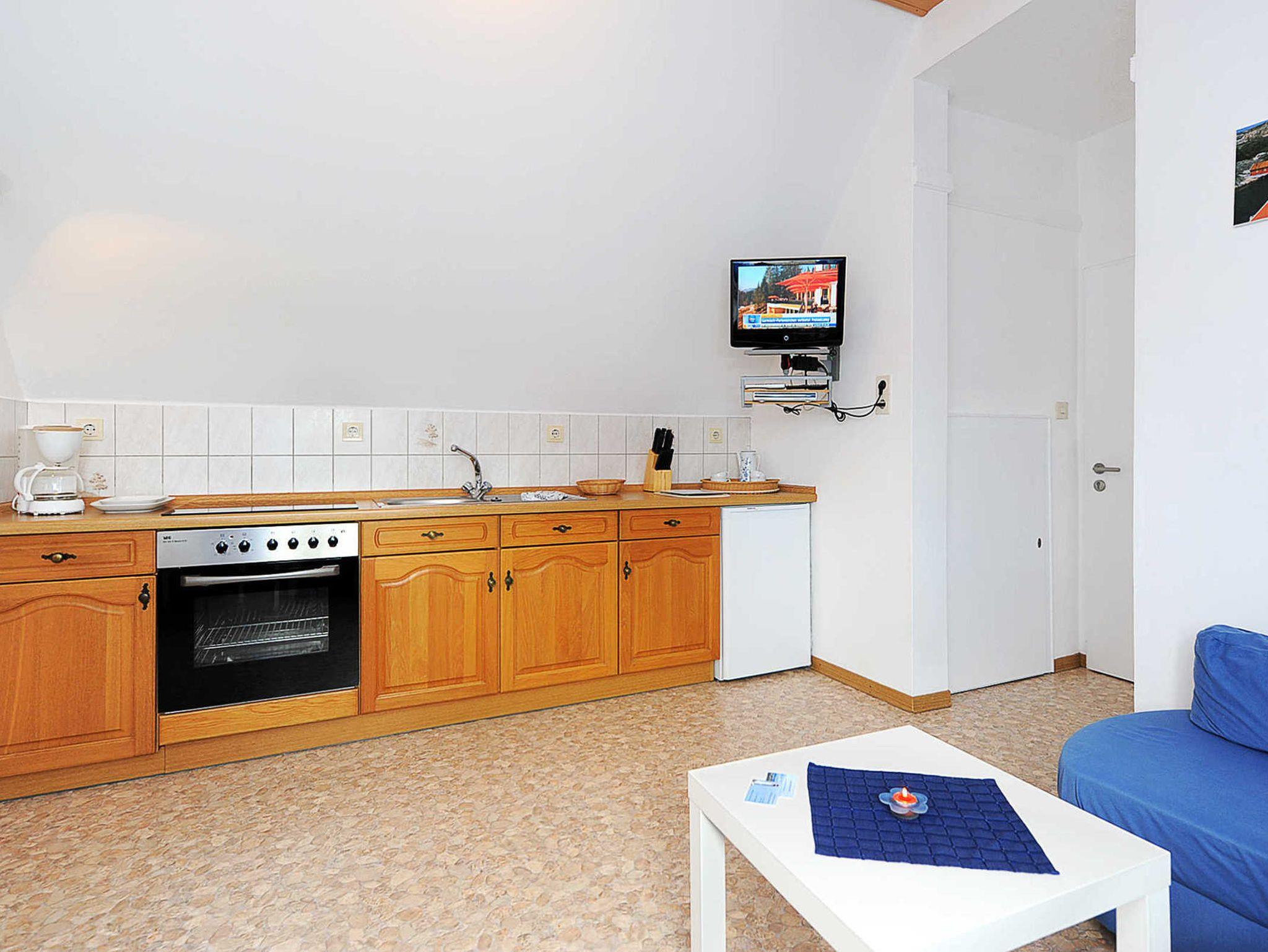Größe ca. 35 Quadratmeter, Wohnraum mit integrierter Küche, Schlafzimmer, Badezimmer mit Dusche, Waschtisch und WC, Obergeschoss, optimal für 1 bis 2 Personen.