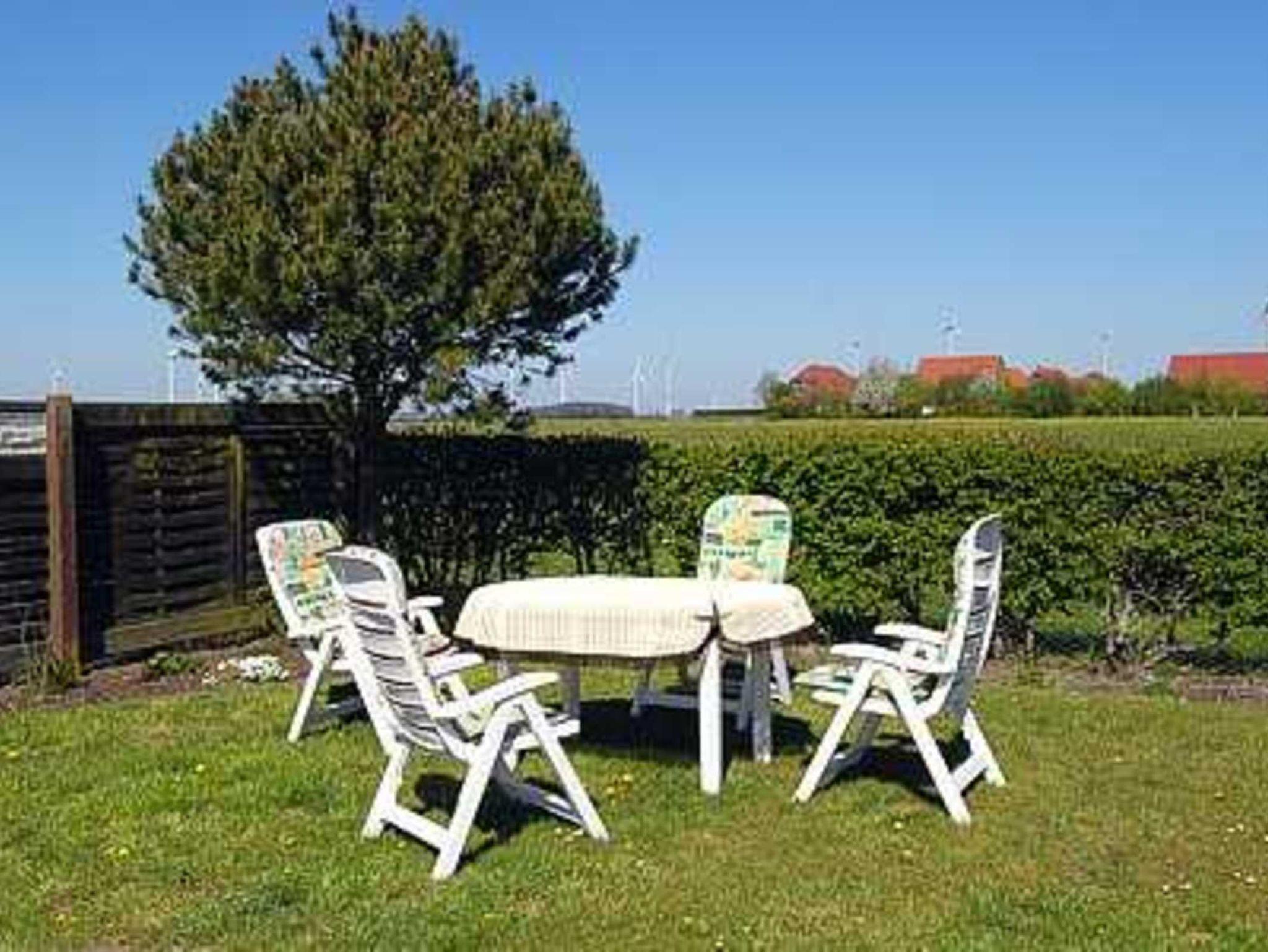Die Wohnung „Ebbe“ im Erdgeschoss hat eine eigene Terrasse. Für die Gäste der Ferienwohnungen „Flut“, „Deich“ und „Frieschen“ sowie die Bewohner des Apartments gibt es mehrere schön gelegene Terrassen beziehungsweise gemütliche Sitzecken, schattig oder in der Sonne, auf dem sehr weitläufigen Grundstück. Das Grundstück ist 2.600 Quadratmeter groß.