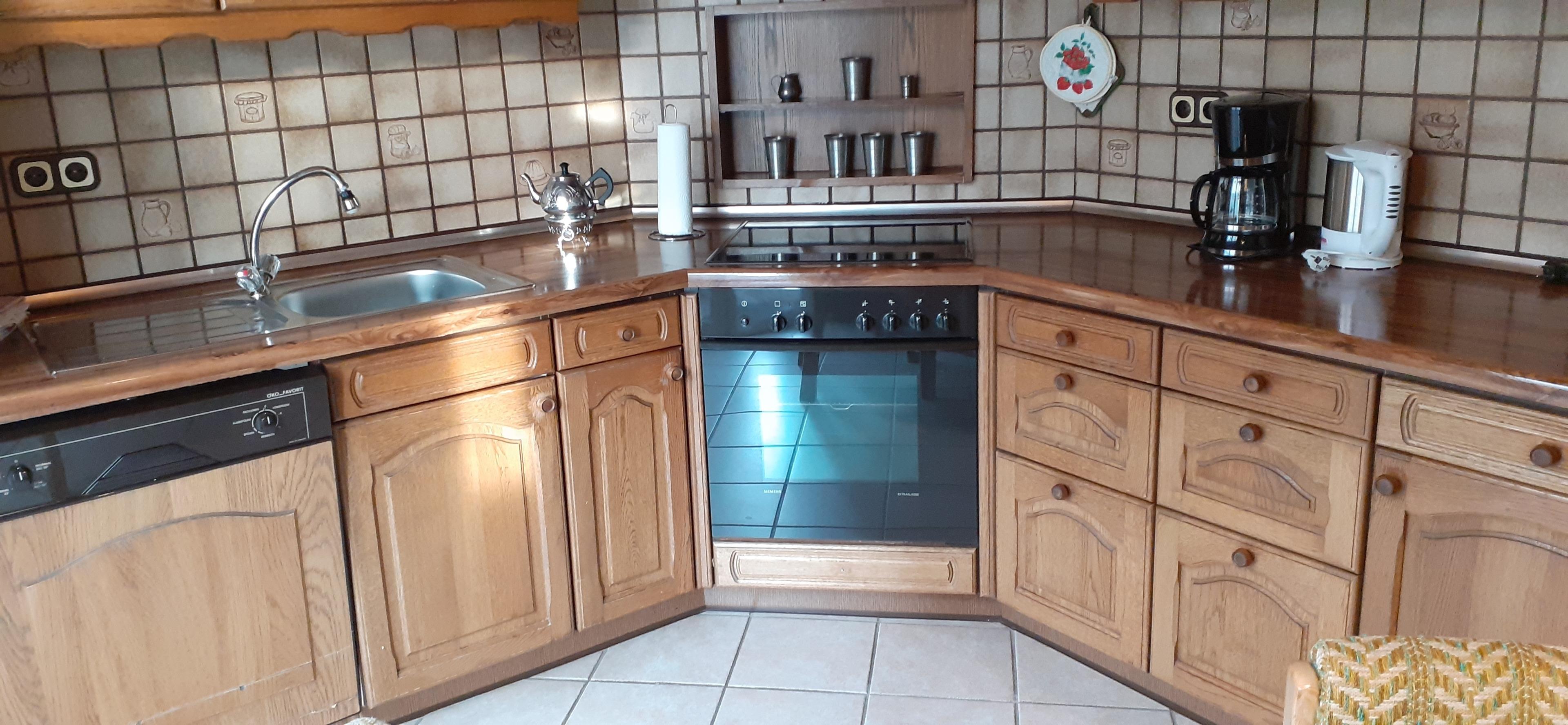 Die Küche ist vollständig ausgestattet mit E - Herd mit Ceranfeld, Backofen, Kühlschrank, Microwelle, Kaffeemaschine, Wasserkocher, Radio und großzügischer Sitzecke.