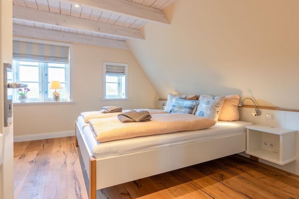 Im Erdgeschoss erwarten dich eine stylische Küche mit schickem Weinkühler, ein WC, eine Sauna mit Dusche, ein Flur, ein praktischer Abstellraum und das Wohn- und Esszimmer mit direktem Terrassenzugang. Im Obergeschoss gibt es zwei kuschelige Schlafgemächer, ein Duschbad und einen Flur. Und auf dem Spitzboden erwartet dich die ultimative Relax Zone zum Ausspannen! Der Garten ist komplett umzäunt und umwachsen. Fahrräder können in der Fahrradgarage abgestellt werden. In einer ruhigen Wohngegend in Utersum. Restaurants, Einkaufsmöglichkeiten, sowie ein Bäcker sind zu Fuß binnen weniger Minuten erreichbar. Der Strand ist nur ca. 700m entfernt.