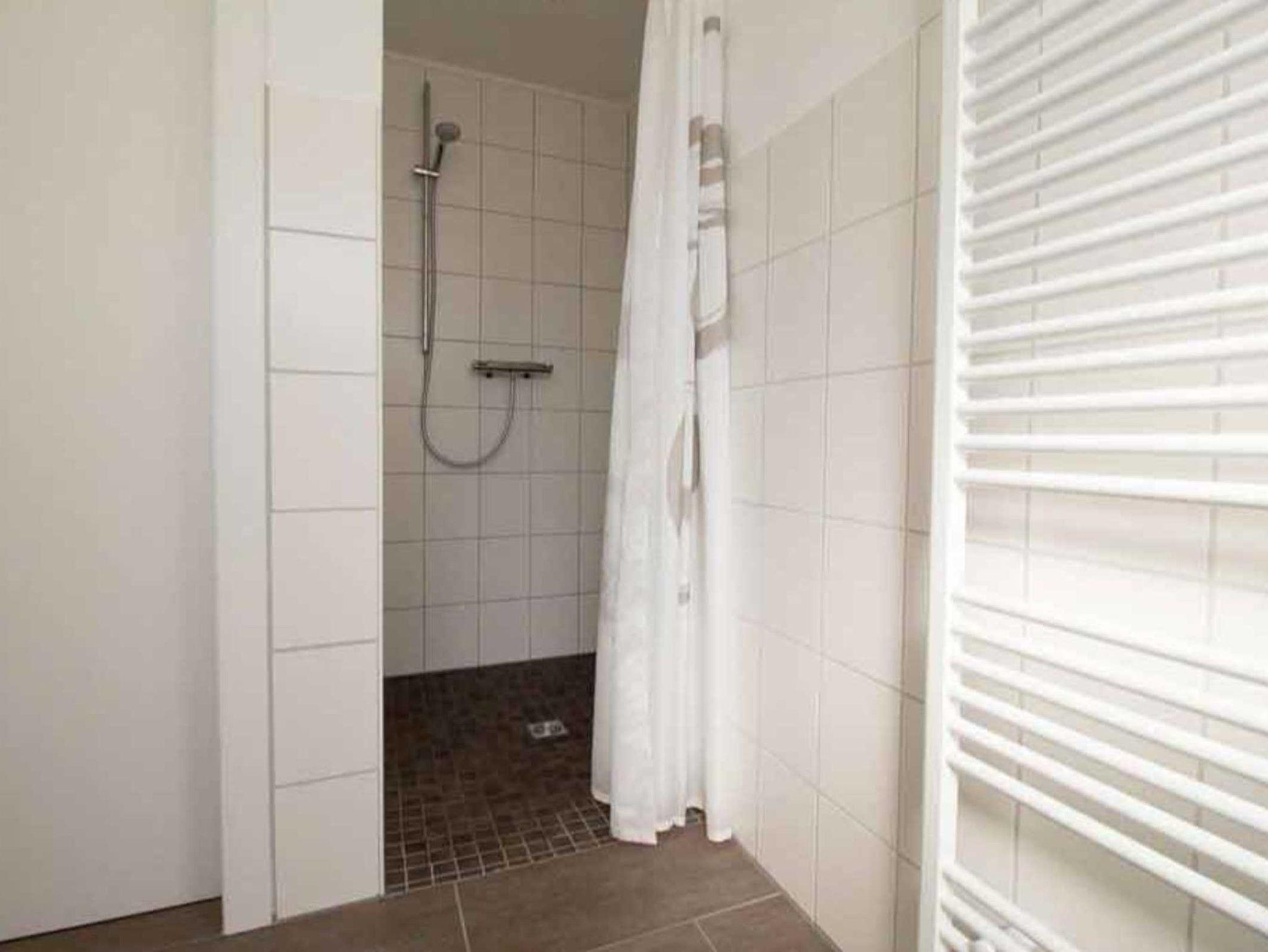 Sanitär: bodenebene Dusche, Föhn, Handtuchheizkörper, Schminkspiegel.