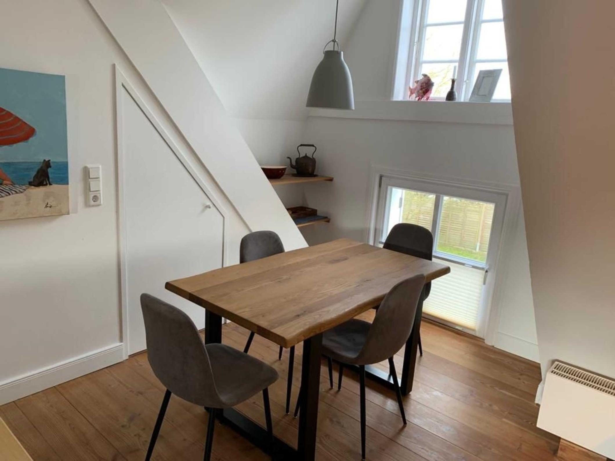 Diese wunderschöne und renovierte Ferienwohnung befindet sich im Obergeschoss des Alten Lehrerhauses. Sie ist für ein bis vier Personen (plus Kleinkind) geeignet. Es erwartet Sie eine komplett renovierte, mit viel Liebe eingerichtete Ferienwohnung, in der auch Ihr Hund willkommen ist. In der Wohnung stehen Ihnen ein Schlafzimmer mit Boxspringbett, zwei Zimmer mit je einem Bett, ein Duschbad, eine offene Einbauküche, ein gemütliches Wohnzimmer mit Essbereich und einem Ofen zur Verfügung. In der gut ausgestatteten Küche finden Sie unter anderem: Gespirrspülmaschine, Kaffeemaschine, Toaster, Wasserkocher, Cerankochfeld, Backofen und ein Kühlschrank mit Gefrierfach. Im Hauswirtschaftsraum, den Sie gemeinsam mit den Gästen der Ferienwohnung im Erdgeschoss nutzen, steht Ihnen kostenfrei eine Waschmaschine und ein Trockner zur Verfügung. Ein Garten mit Sonnenliegen und Terrassenmöbeln rundet das Angebot ab.