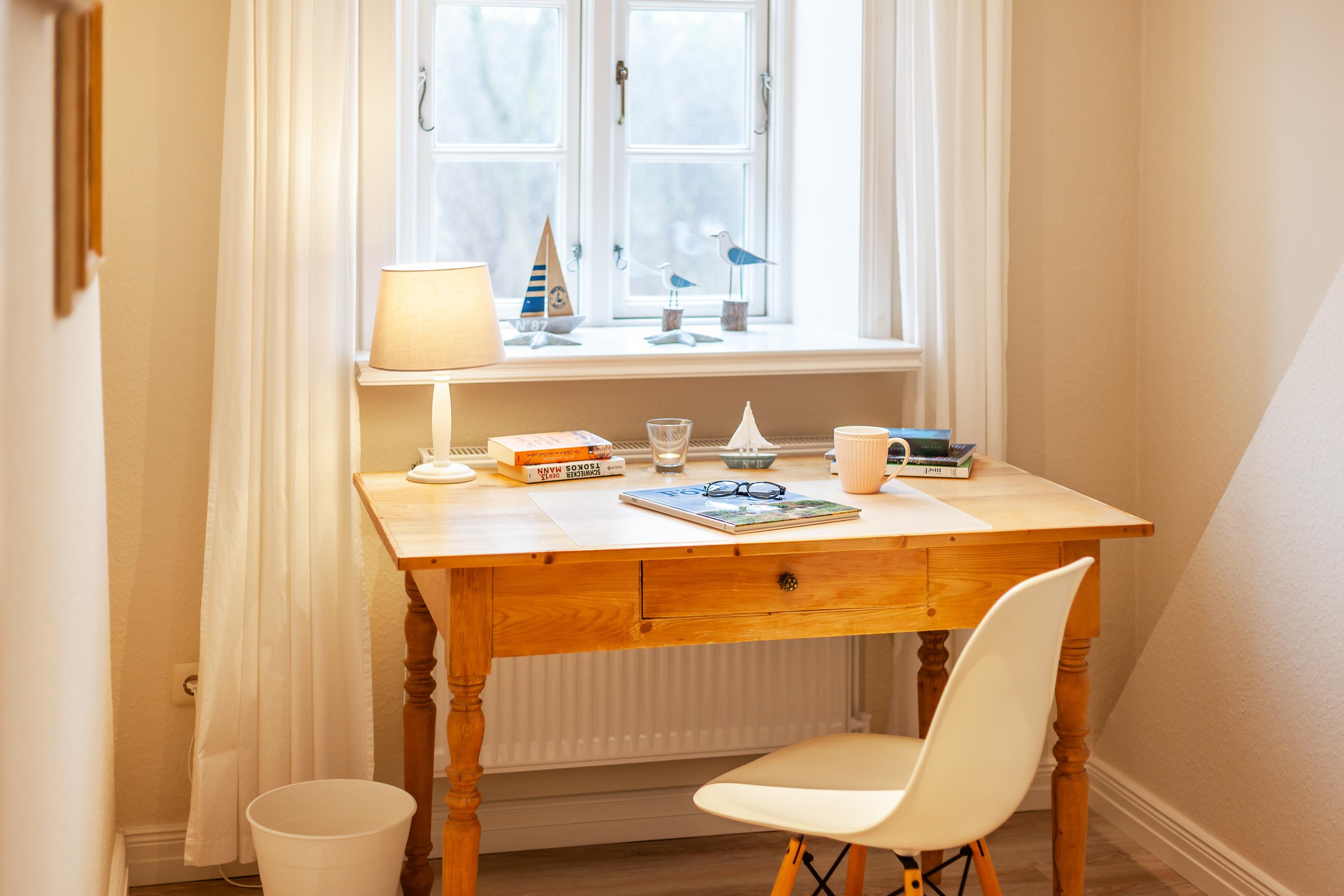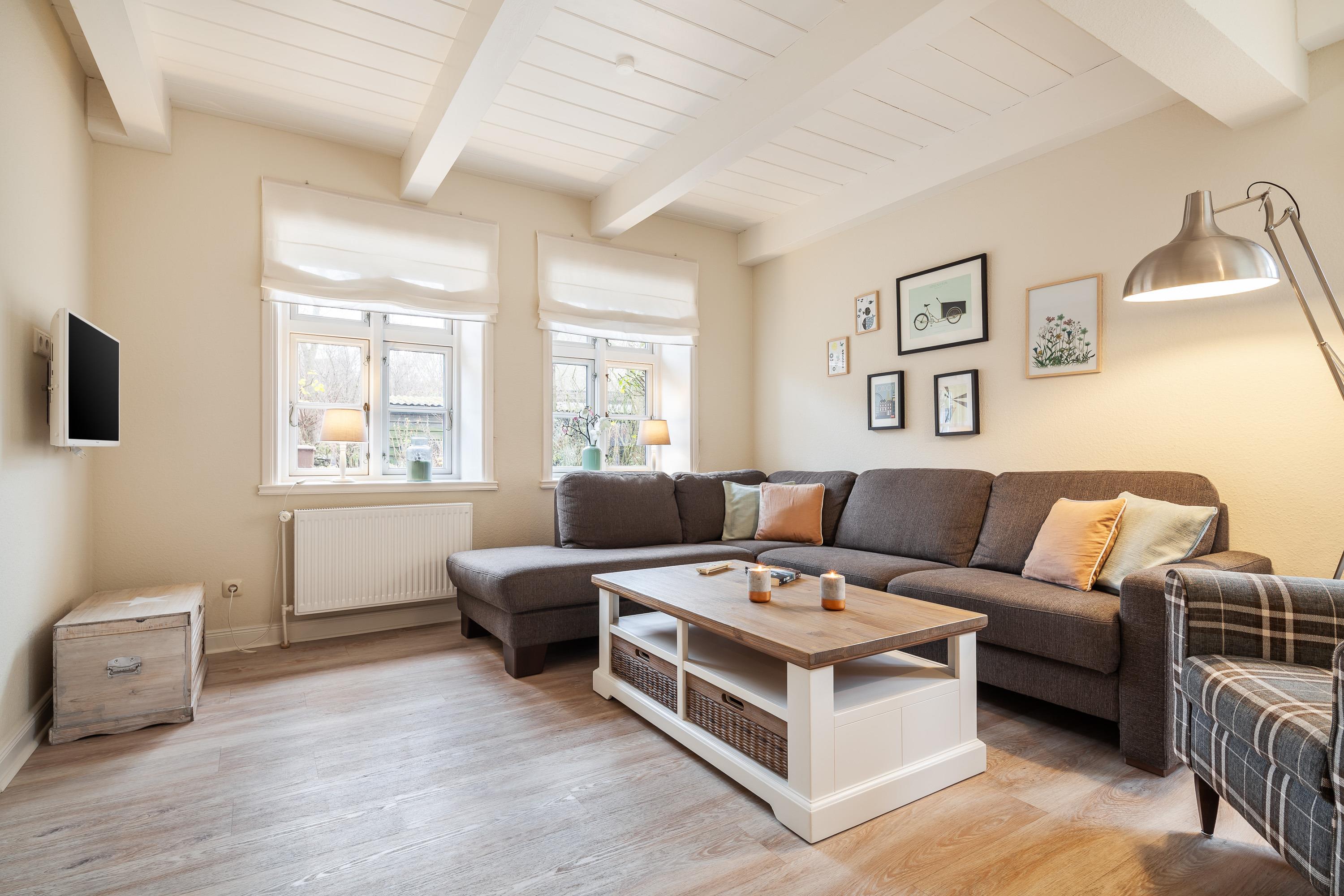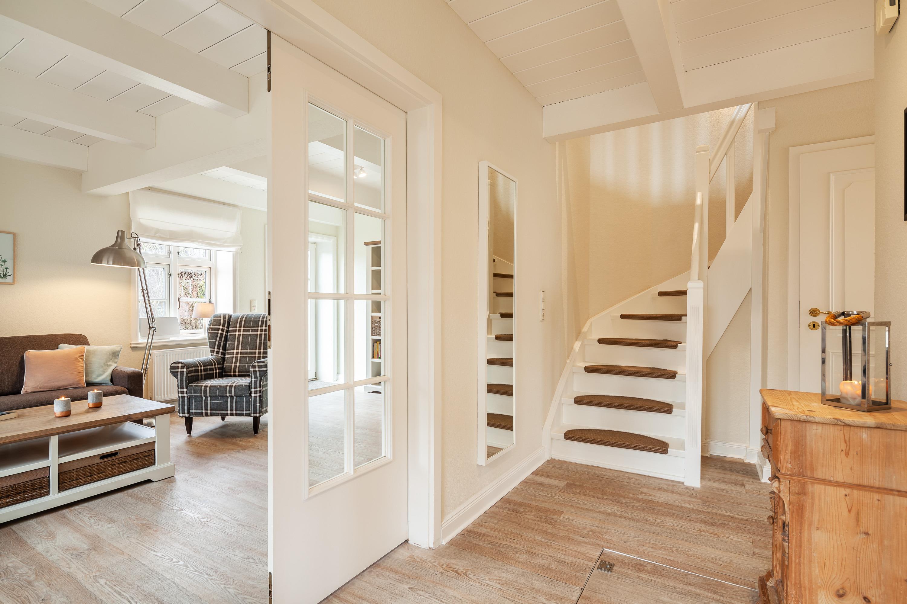 Modernes, reetgedecktes Ferienhaus in Utersum mit maritimem Stil, Garten, Strandkorb und Fußbodenheizung für entspannte Tage zu viert.