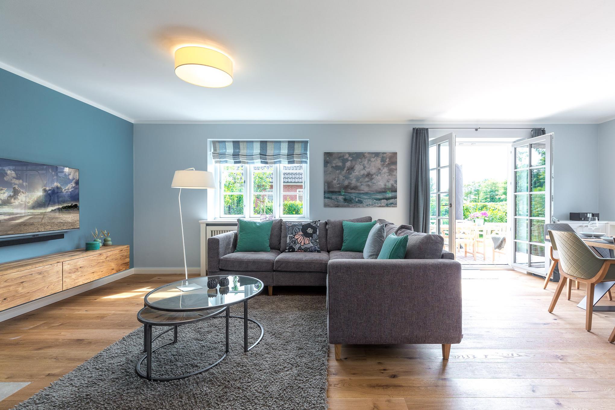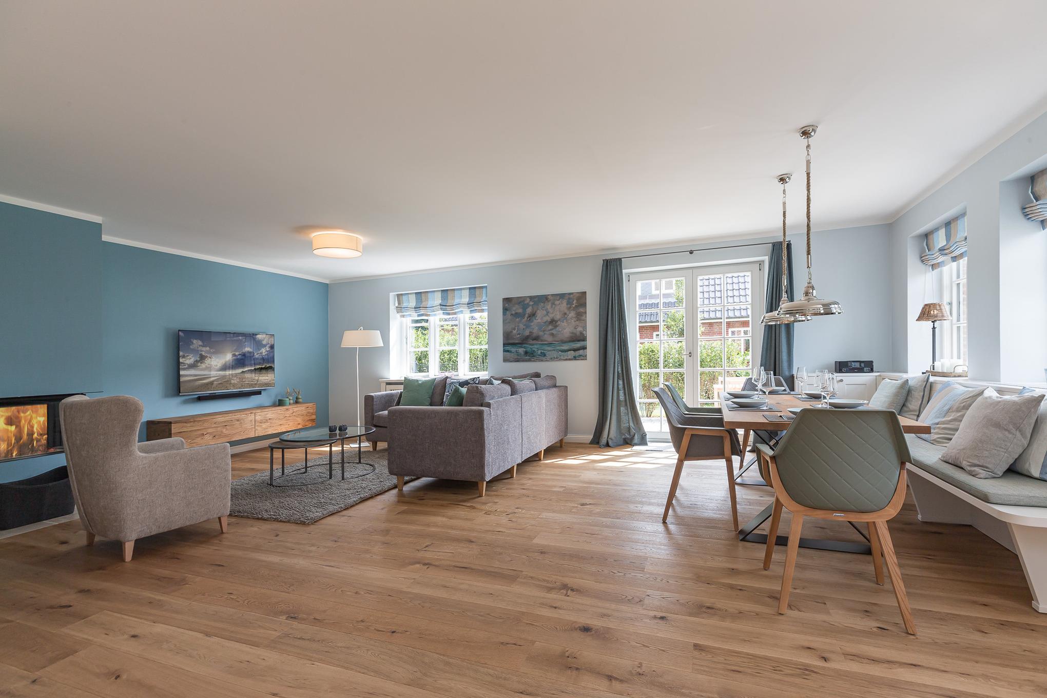 Der großzügige Wohnraum mit integriertem Essbereich und offener Küche mit farblich schön abgestimmten Farben läßt sofort Urlaubsstimmung aufkommen. Die Bäder und Schlafräume sind jedes für sich ein Highlight. Sie werden sich sofort wohlfühlen und diese Atmosphäre genießen. Die große Terrasse wartet darauf, genutzt zu werden. Der Blick in den Garten zeigt die Tiefe des Grundstücks. Natürlich fehlt auch die Sauna nicht, und der Kamin sorgt im Herbst und Winter für gemütliche Abende. Der kurze Weg zum Strand macht diese Haushälfte zu einem tollen Urlaubdomizil auf Zeit.