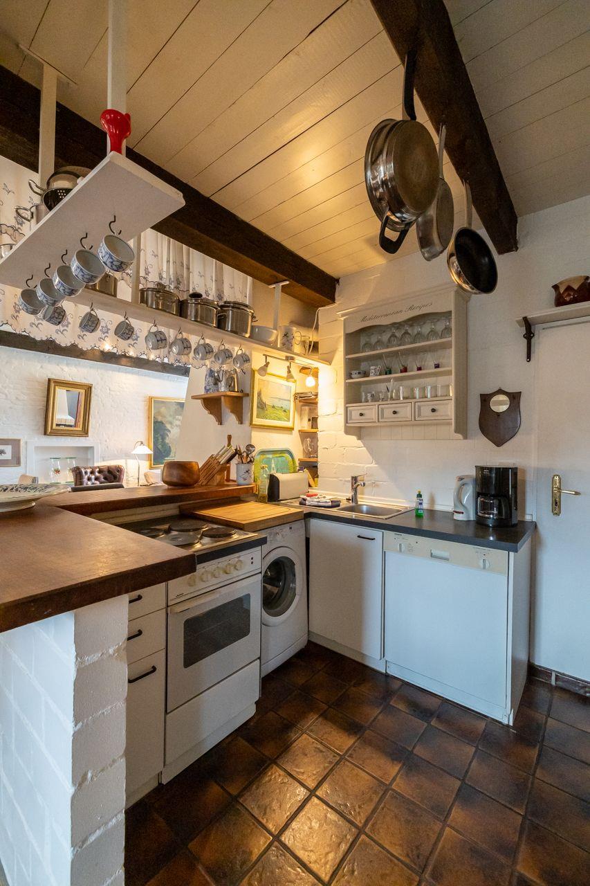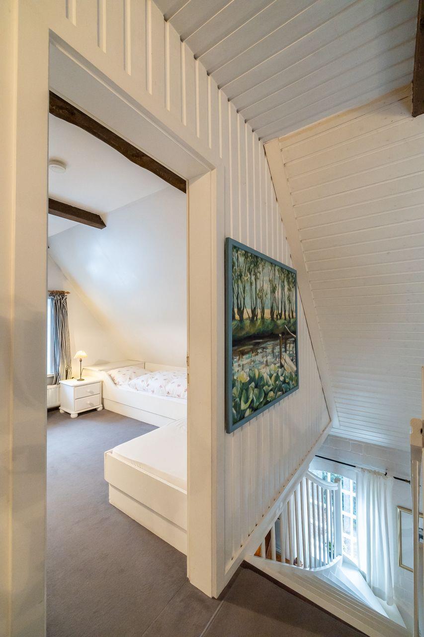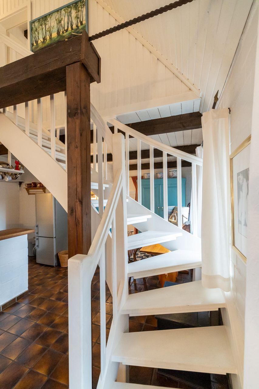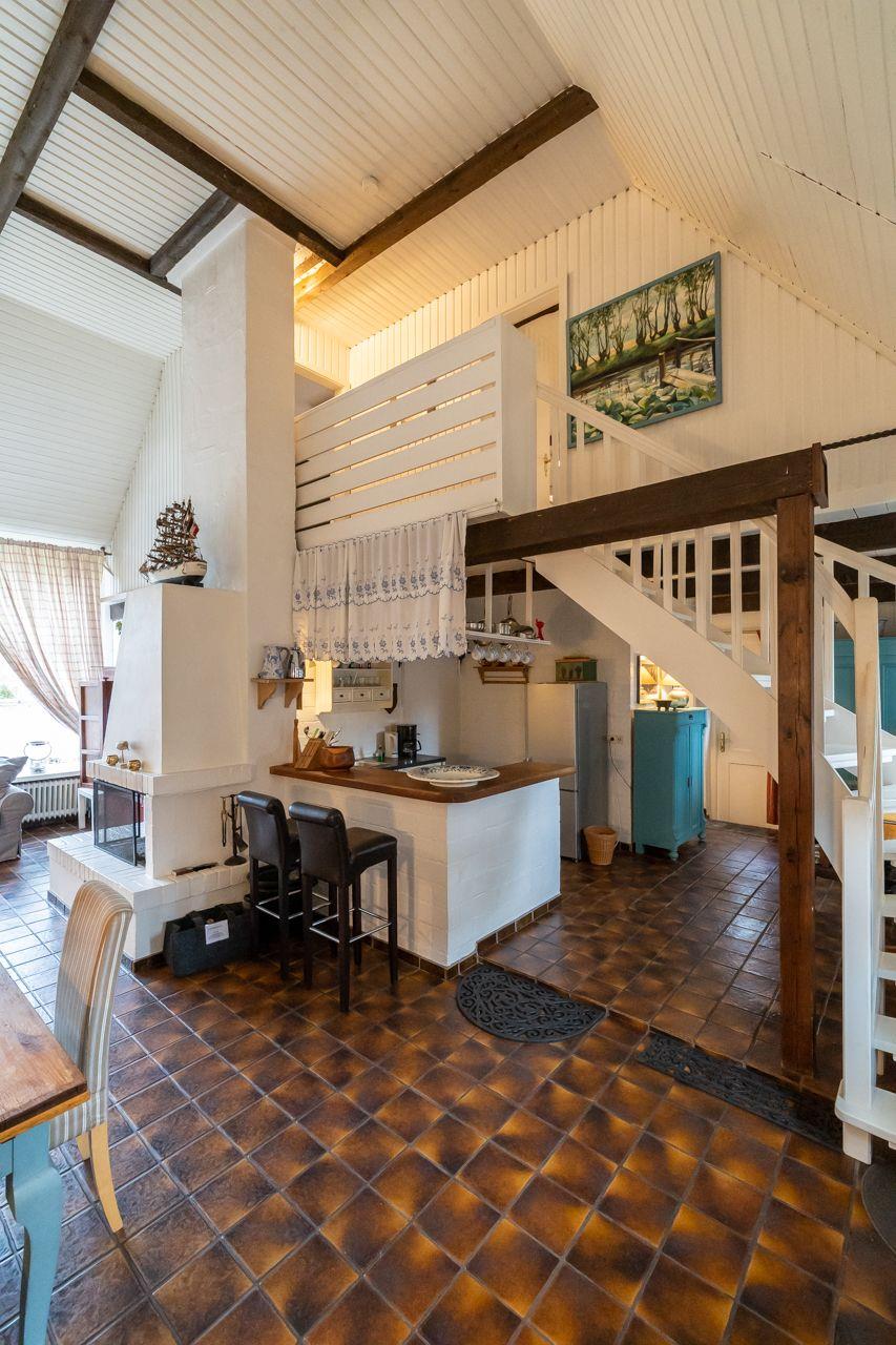 Es stehen Ihnen zwei Schlafzimmer (eines mit Doppelbett und eines mit zwei getrennten Betten) in der oberen Etage zur Verfügung. Die offene Küche und das Wannenbad finden Sie im Erdgeschoss.