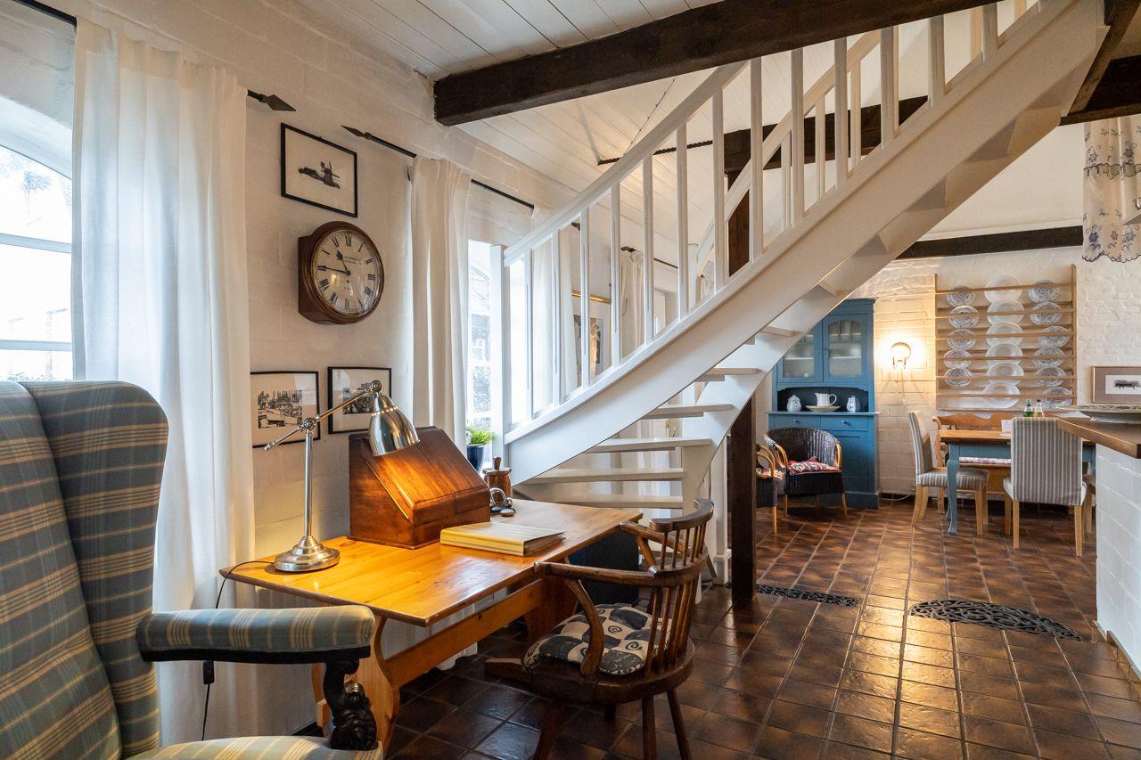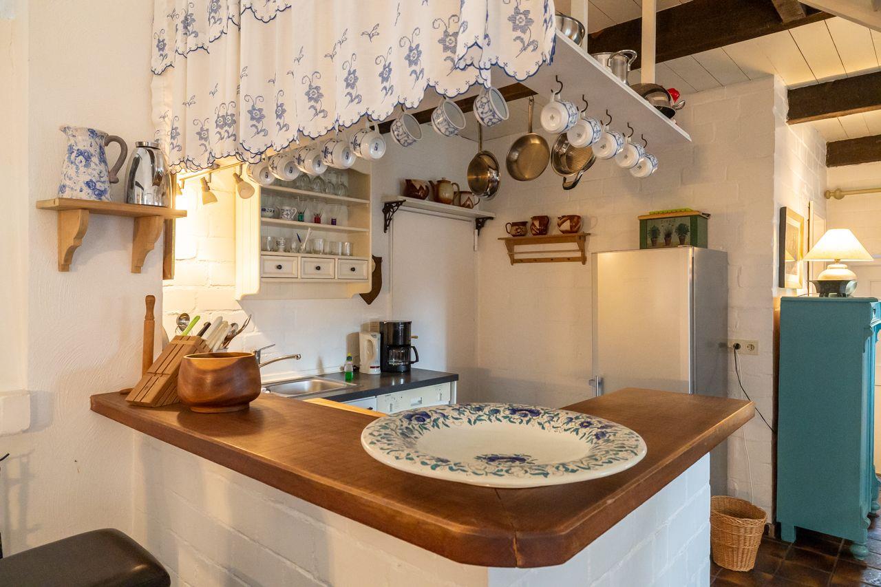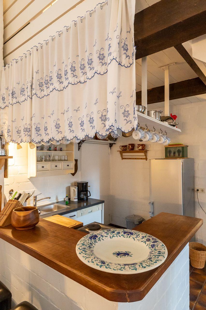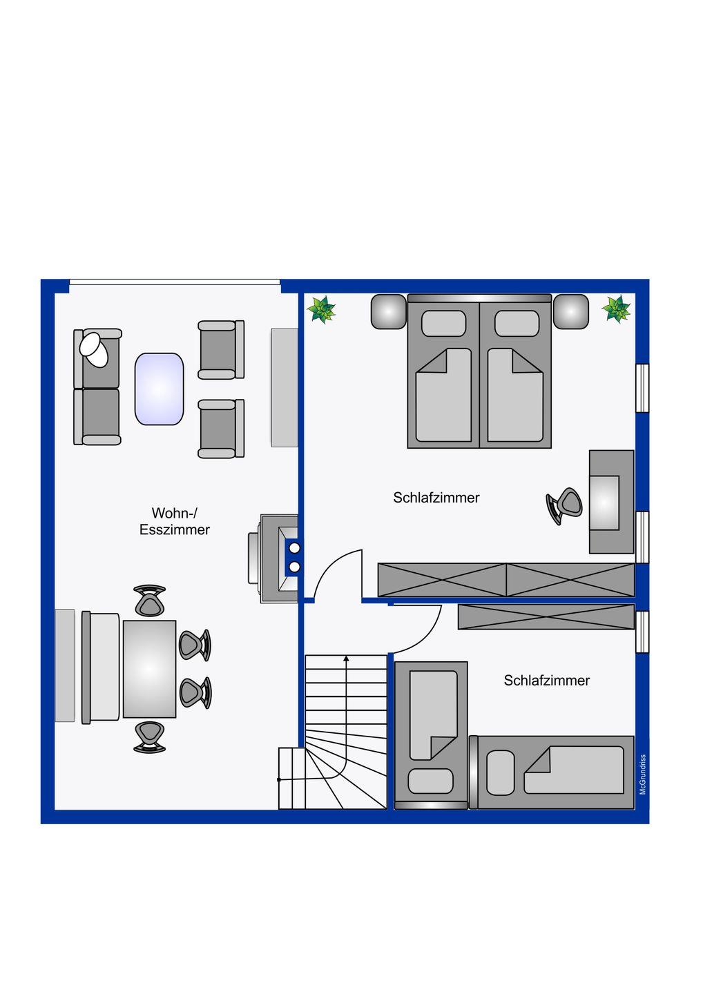 Es stehen Ihnen zwei Schlafzimmer (eines mit Doppelbett und eines mit zwei getrennten Betten) in der oberen Etage zur Verfügung. Die offene Küche und das Wannenbad finden Sie im Erdgeschoss.