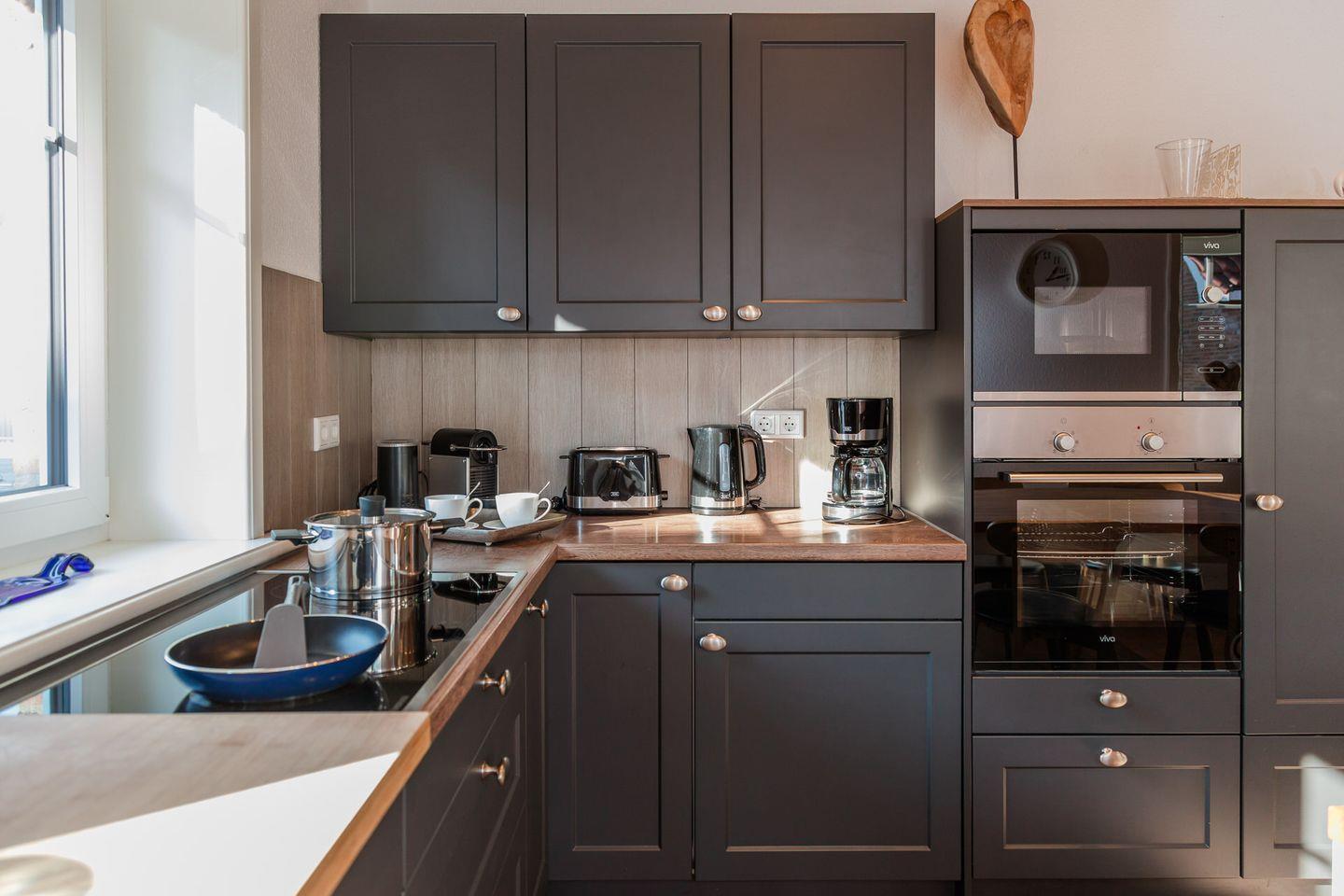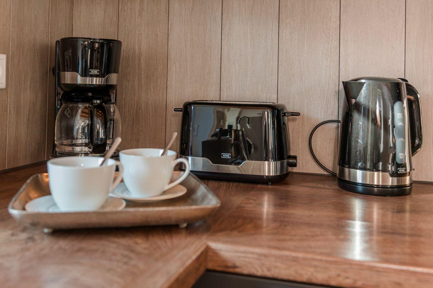 Im Erdgeschoss befinden sich ein Wohn- und Essbereich mit offener Küche, ein Schlafzimmer mit zwei Einzelbetten und ein Vollbad mit Badewanne und Raindance-Dusche, eine eingebaute Waschmaschine in der Küche. Über den Wohnbereich gelangen Sie auf die eigene Terrasse. Der Ethanol-Kamin sorgt auch an kühleren Tagen für eine angenehme Atmosphäre.