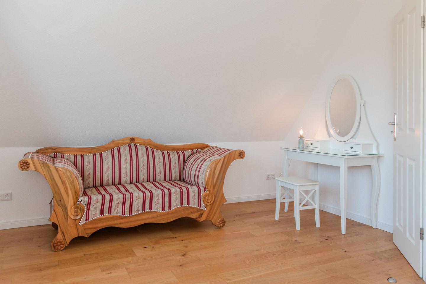Im Obergeschoss sind zwei weitere Schlafzimmer - jeweils mit einem Doppelbett ausgestattet - sowie das zweite Duschbad gelegen. Alle Schlafzimmer sind mit einem TV ausgestattet, ein Doppelbett-Zimmer verfügt über einen Schminktisch. In beiden Bädern befinden sich Radios, die in eine Wand eingelassen sind und über den Lichtschalter bedient werden.