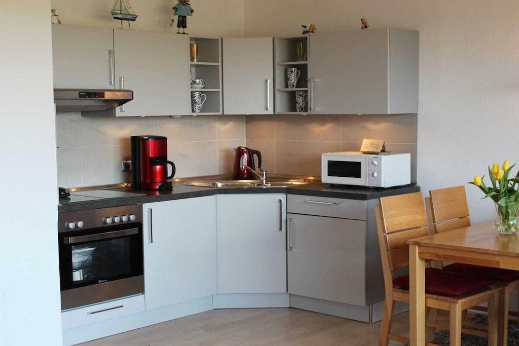 Die moderne Ferienwohnung Wattenmeer mit unverbautem Blick auf den Jadebusen steht Ihnen für einen unbeschwerten und schönen Nordseeurlaub zur Verfügung. Der Wohn-Essbereich ist offen und modern gestaltet. Der Wohnbereich ist ausgestattet mit WLAN , einem Flat Screen, DVD-Player und CD/Radio-Player. Die neue Einbauküche verfügt über eine exklusive Ausstattung: Ceranfeld, Backofen, Mikrowelle, Kühl- und Gefrierfach. Durch den Wohnbereich gelangt man auf die Terrasse und in den Gemeinschaftsgarten. Dort lässt sich bei angenehmer Nordseeluft ein Frühstück entspannt genießen. Das Schlafzimmer ist mit einem Doppelbett und einen großen Kleiderschrank ausgestattet. Das Badezimmer hat eine begehbare Dusche / WC.