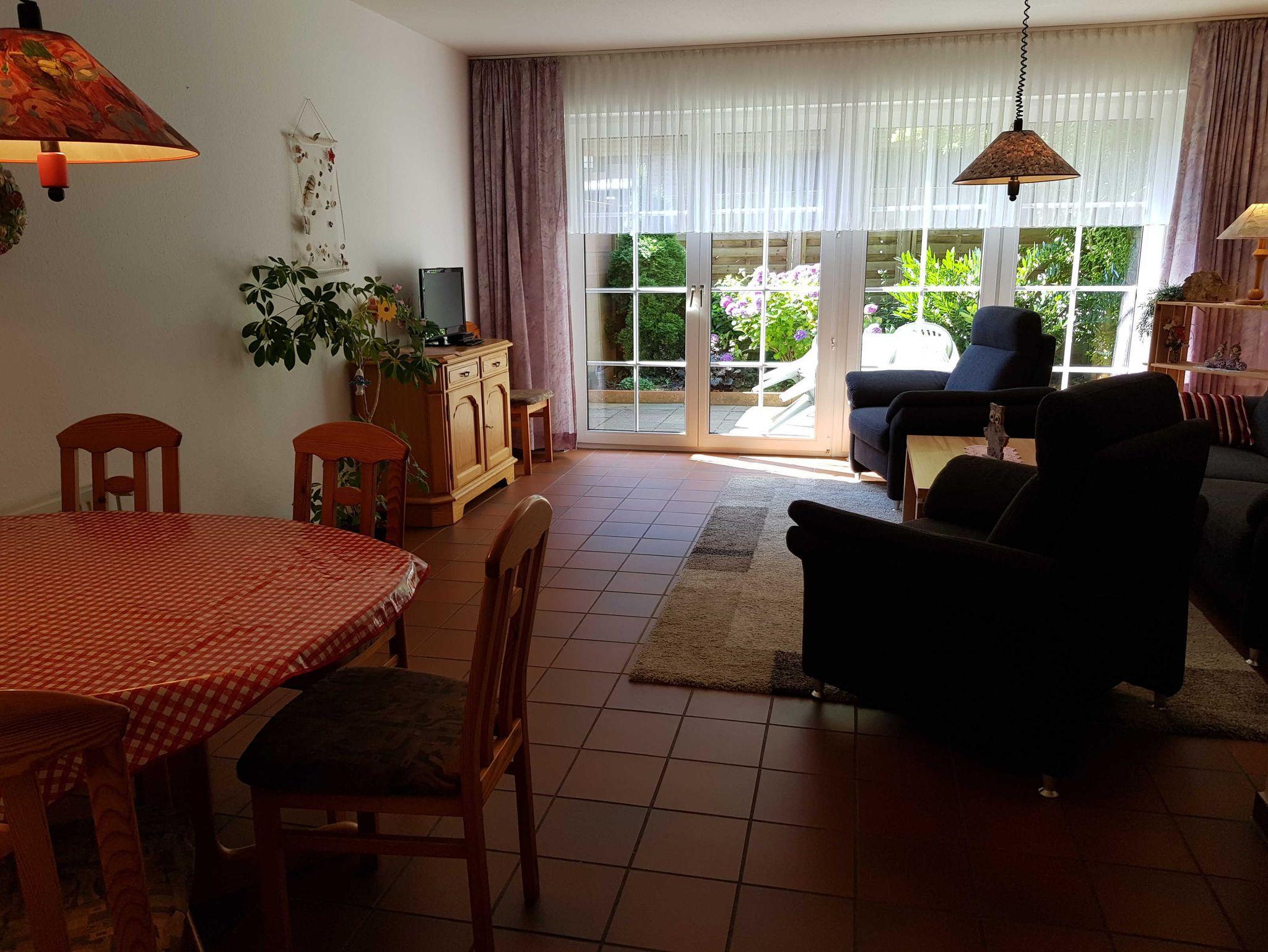 Das Ferienhaus ist das 3. Haus von 5 Reihenhäusern. 4 Häuser sind Ferienhäuser. Zum Haus gehört der 3. Parkplatz der über die Parallelstraße... Auf der Gast ... zu erreichen ist. Zum Haus gehört ein Kellerraum in dem Fahrräder untergebracht werden können. Im Keller befindet sich auch die Waschmaschine und der Wäschetrockner der von den Ferienhäusernutzern gemeinsam genutzten werden kann. Diese Geräte sind mit 1 Euro Münzen zu bedienen. Im Haus gibt es eine kleine vollausgestattete Küche, einen gemütlichen Ess- und Wohnbereich mit Fernseher und Radio- CD Spieler. Ein kleines Bücherregal das rege genutzt und getauscht werden kann. Auf der Terrasse sind Gartenmöbel. Im Abstellraum sind Sonnenschirm, Liegen und Auflagen, Kinderhochstuhl und Reinigungsgeräte zu finden. Ein kleiner Vorratsraum und ein Gäste WC sind ebenfalls im Erdgeschoss. Über eine Treppe gelangen Sie zu den Schlafzimmern. Ein Doppelzimmer mit geräumigen Schrank und ein Zimmer mit Etagenbett sowie Kinderbett sind dort zu finden. Es können jeweils 1 Klappbett oder ein Kinderbett zugestellt werden. Das Badezimmer mit Dusche, Waschbecken und WC sind ebenfalls oben. Hygiene- und Reinigungsartikel müssen selbst mitgebracht werden.