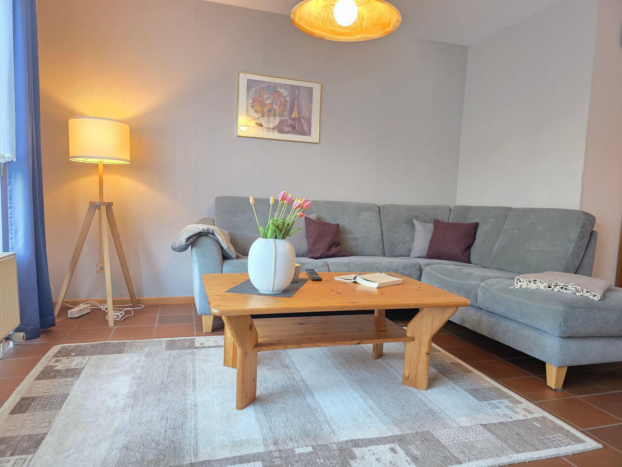 Eckgarnitur, Tisch, Schränke in skandinavischem Stil, Farb-TV mit Sat-Anlage, Stereo-Anlage, W-LAN, Diverses