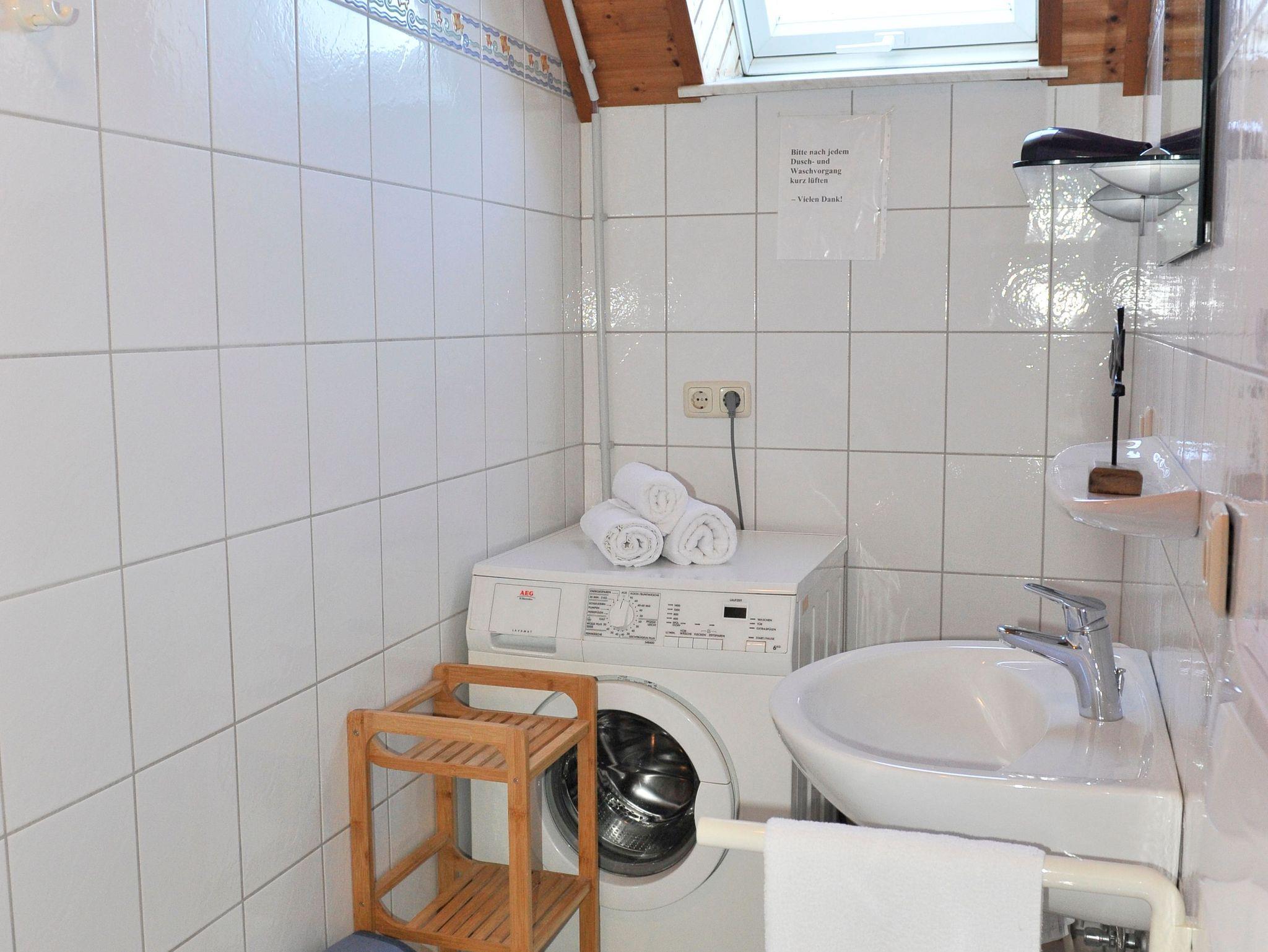 Im ersten Obergeschoss befindet sich das Elternschlafzimmer mit Doppelbett, ein Kinderzimmer mit zwei Einzelbetten sowie das Duschbad mit einer Waschmaschine und Außenfenster.