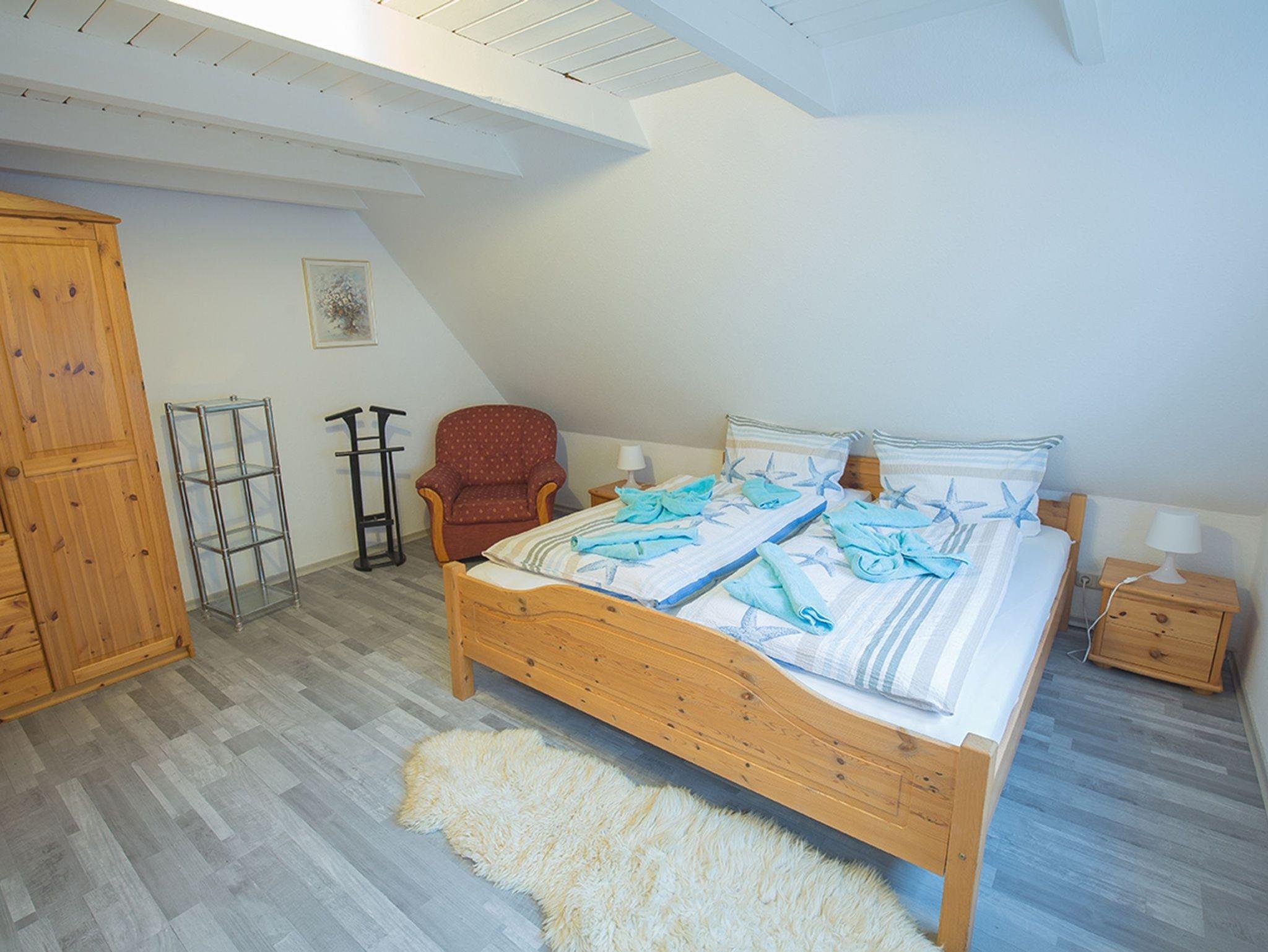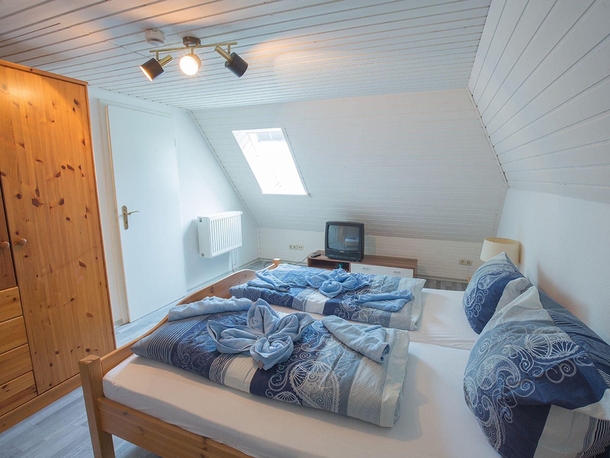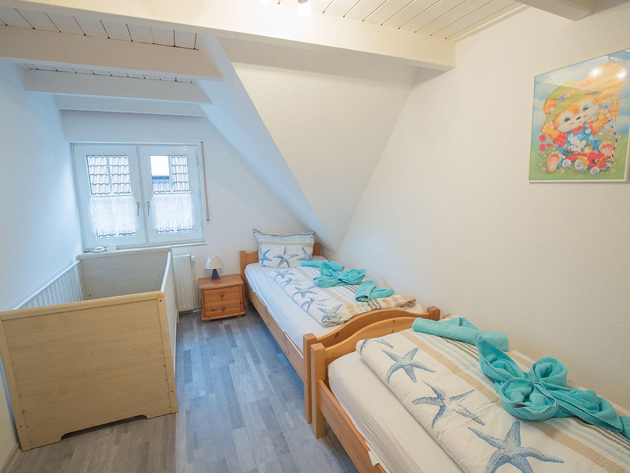 Im ersten Obergeschoss befinden sich zwei helle Schlafräume mit je zwei Einzelbetten und einem Doppelbett sowie das geräumige Duschbad mit Fenster. Im Dachgeschoss gibt es noch ein weiteres Schlafzimmer mit zwei Einzelbetten.