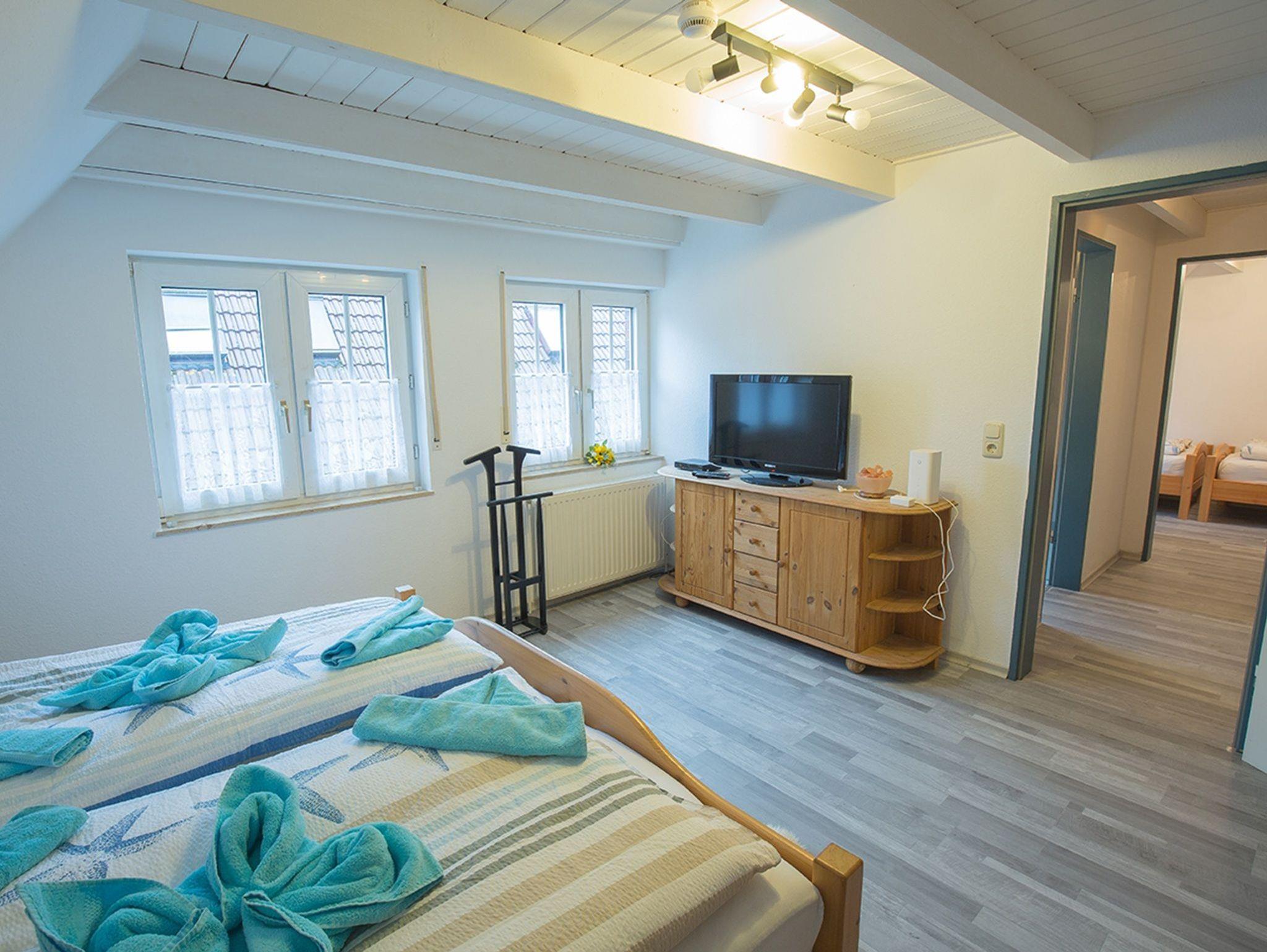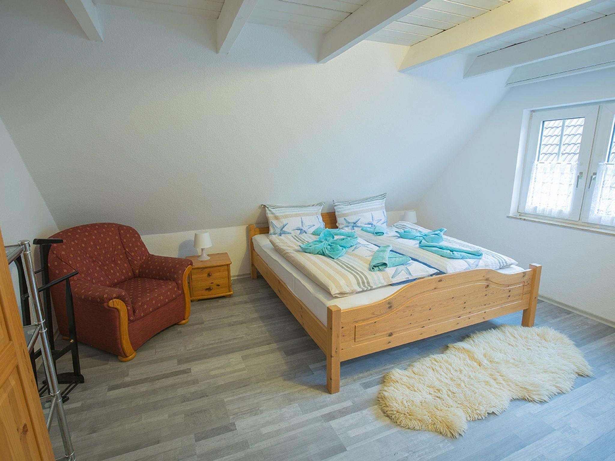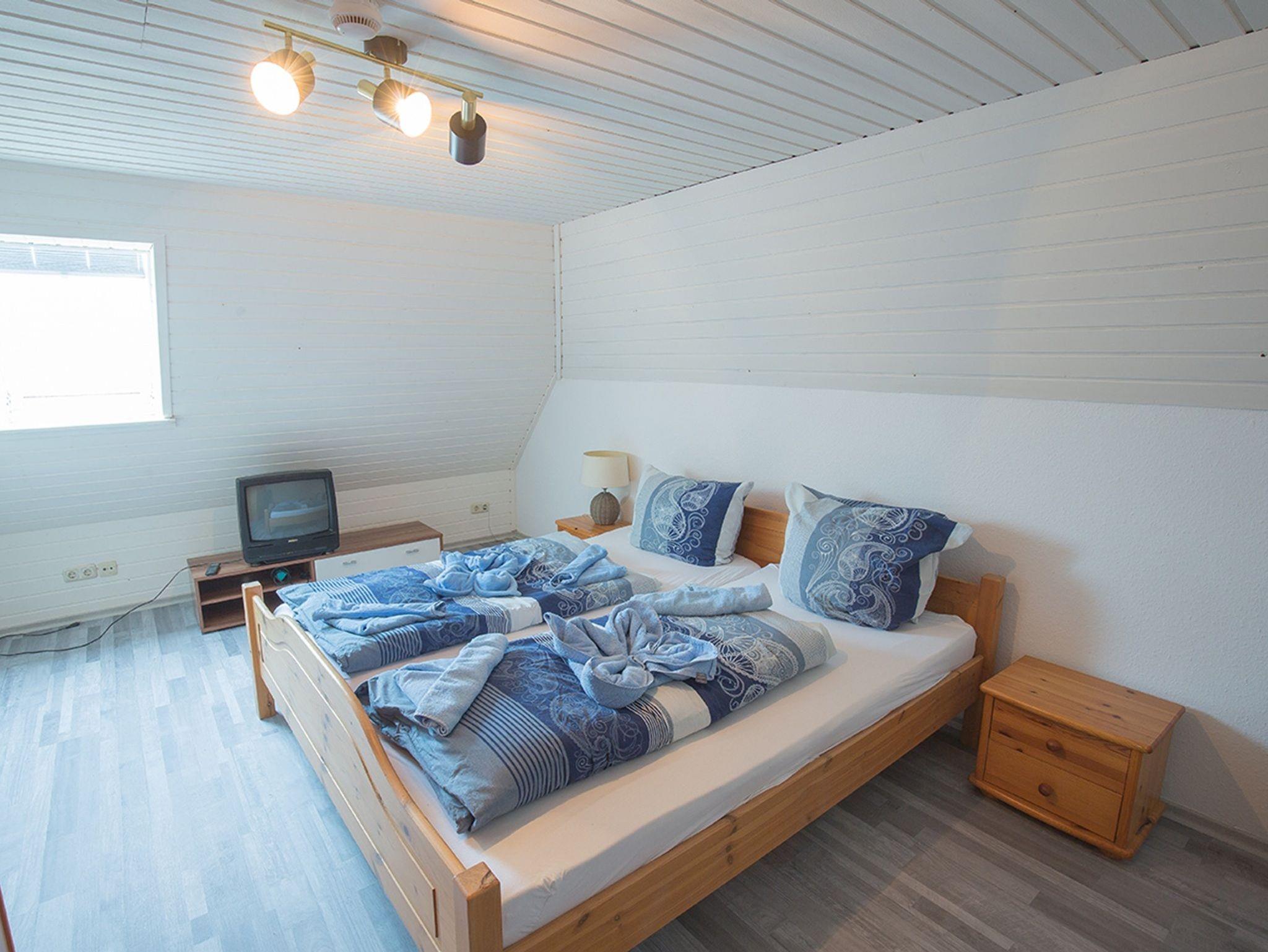 Im ersten Obergeschoss befinden sich zwei helle Schlafräume mit je zwei Einzelbetten und einem Doppelbett sowie das geräumige Duschbad mit Fenster. Im Dachgeschoss gibt es noch ein weiteres Schlafzimmer mit zwei Einzelbetten.