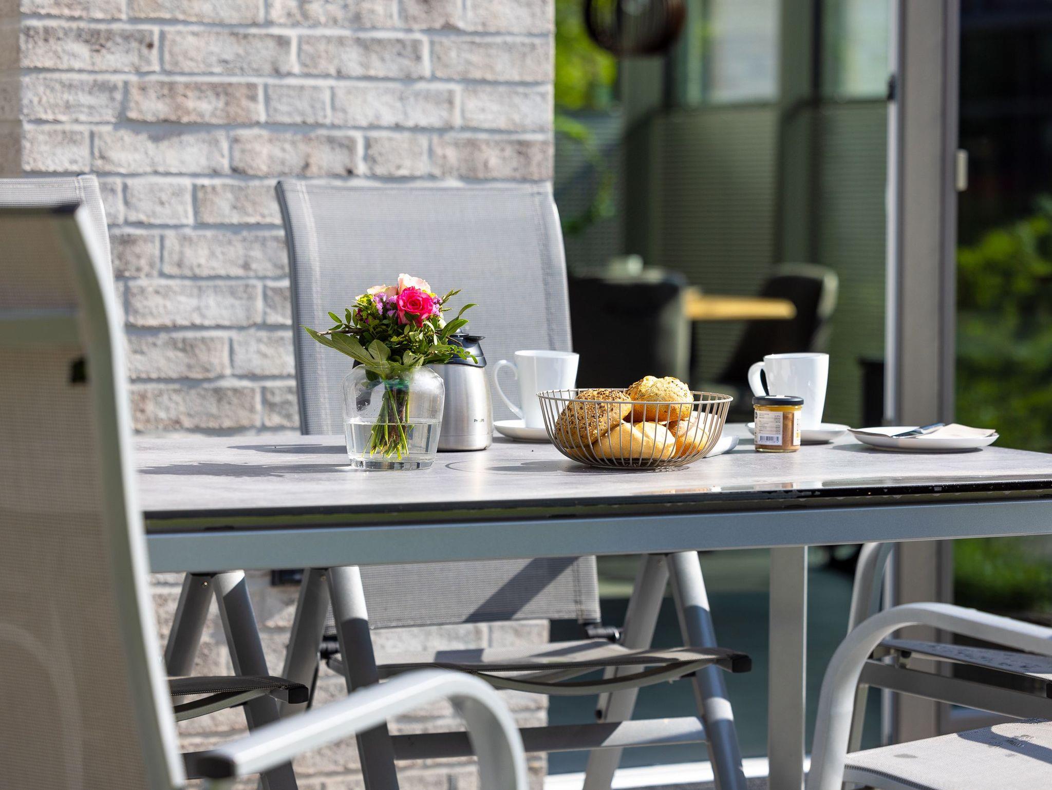 (Süd) Terrasse mit Tisch und Stühlen für 6 Personen, 2 Relaxsessel, Gartenbank, Holzkohlegrill, Fahrradabstellraum mit Elektroanschluss (Lademöglichkeit E-Bike), Tischtennisplatte, Fahrrad