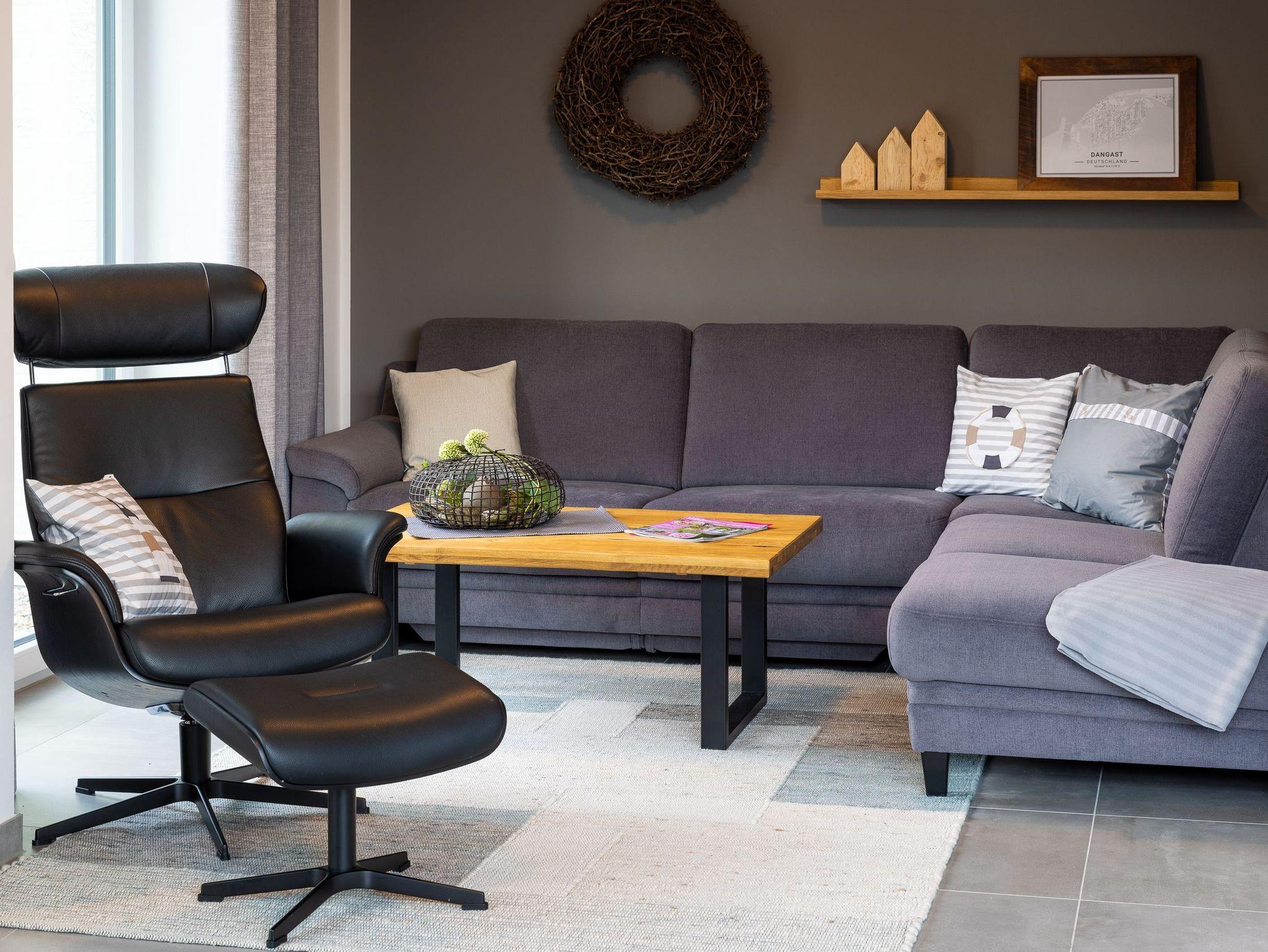 Wohnzimmer (EG): Ecksofagarnitur (mit Schlaffunktion für zwei Personen), Relaxsessel, Couchtisch, Flachbildfernseher, internet- und Bluetooth fähiges Radio.
