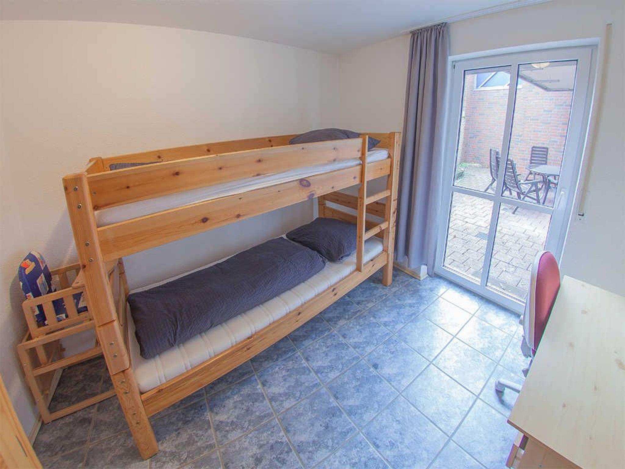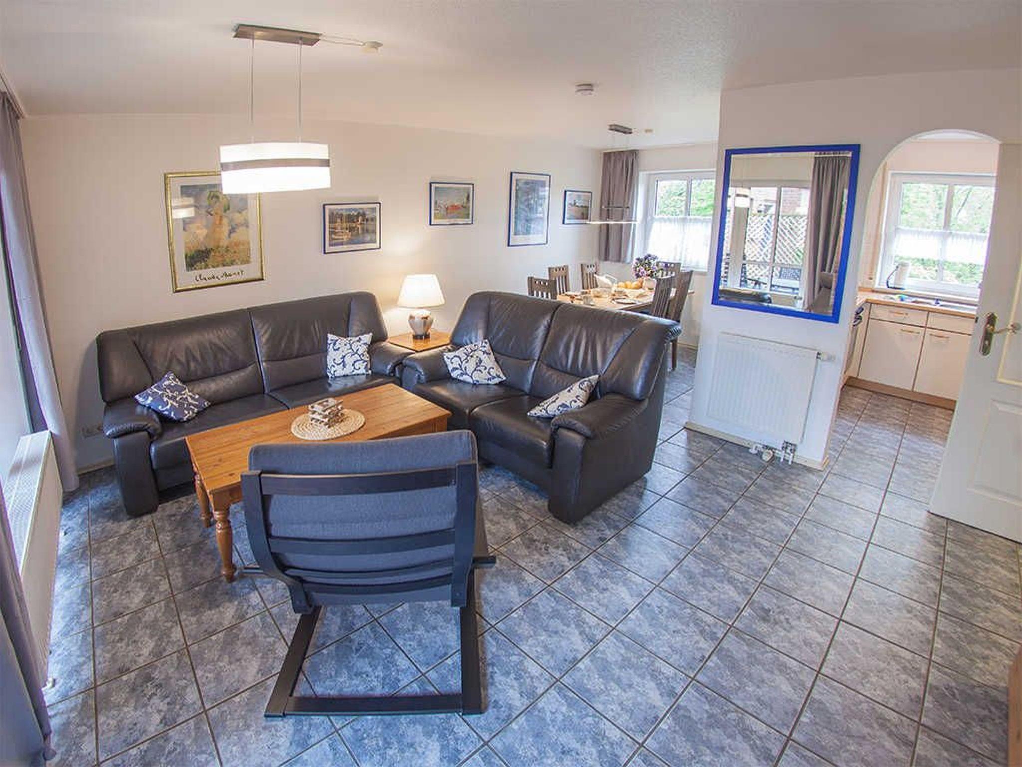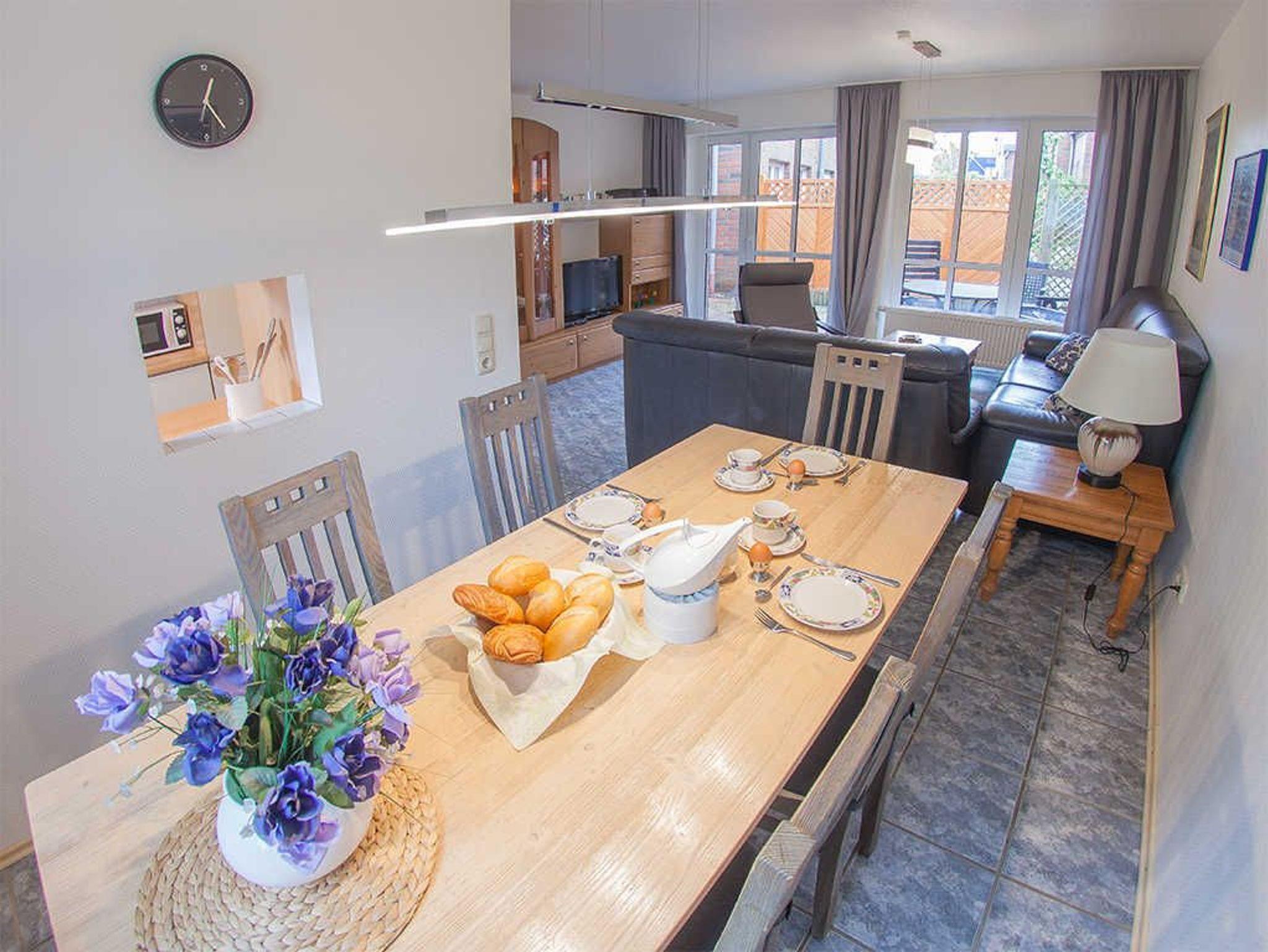 Herzstück der Wohnung ist der geräumige Wohn-/Essbereich mit Zugang zur separaten Küche und Terrassenausgang. Der Essplatz bietet eine Durchreiche zur Küche. Insgesamt stehen drei Schlafzimmer zur Verfügung; eines mit Doppelbett, das weitere mit einem Etagenbett und noch eines mit einem französischen Bett in der Größe 140x200. Das geräumige Fenster-Duschbad bietet Bidet, zwei Waschbecken, eine große Dusche sowie eine Top-Lader-Waschmaschine. Auf der großen Terrasse genießen Sie die frische friesische Luft.