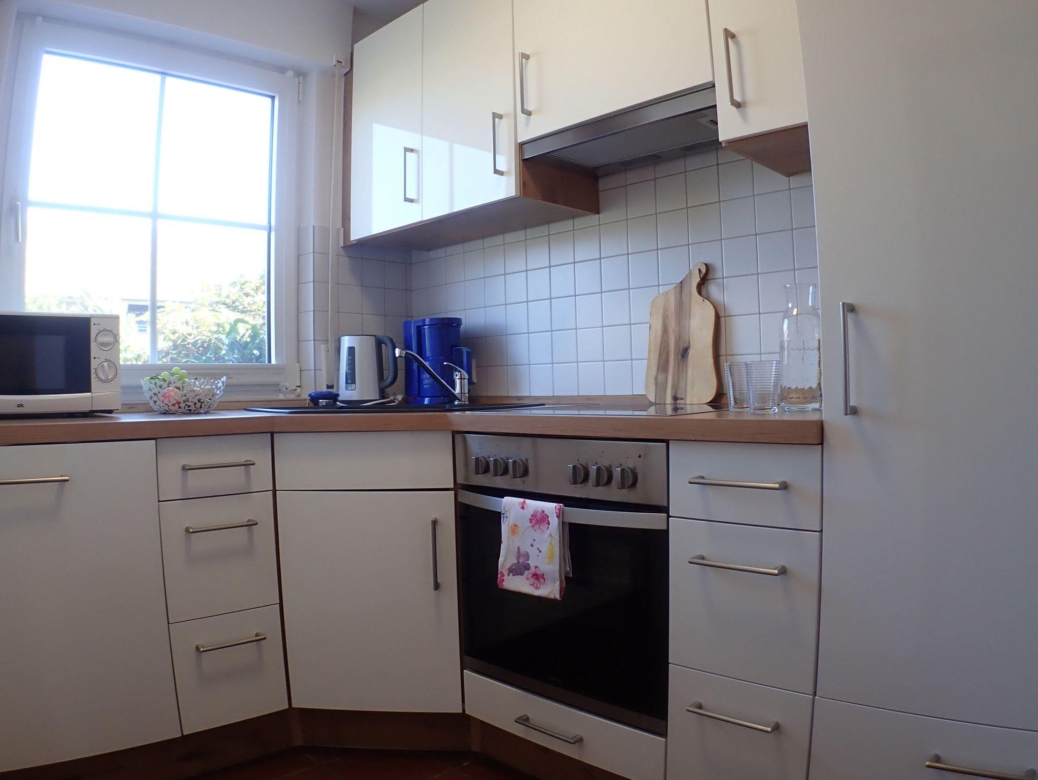 komplett eingerichtet, Spülmaschine, Elektroherd mit Ceranfeld und Backofen, großer Kühlschrank mit Gefrierfach, Kaffeemaschine, Toaster, Eierkocher usw.