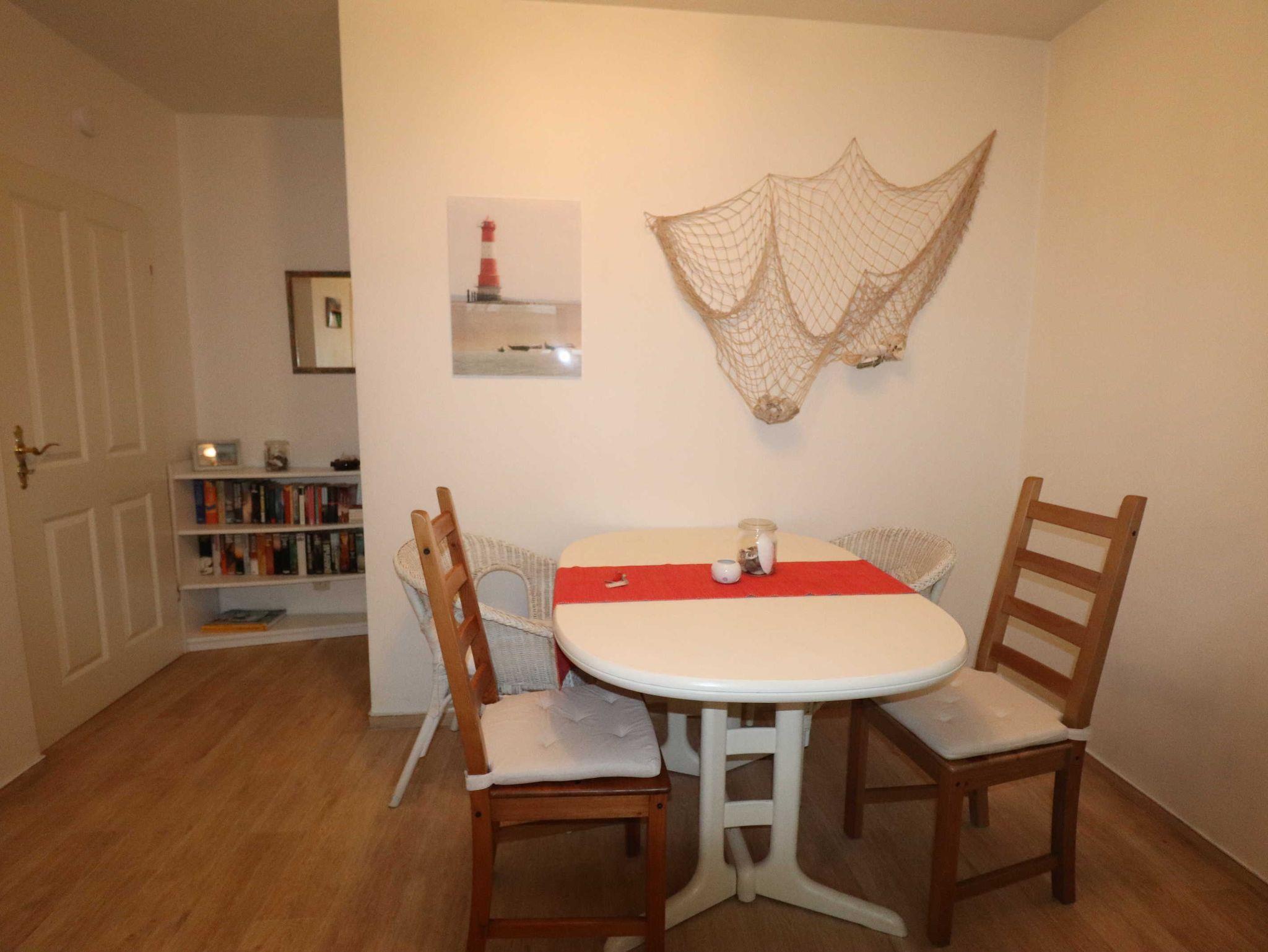 Im Erdgeschoss unseres Hauses vermieten wir zwei Ferienwohnungen, jeweils ca. 50m² groß. Unsere Wohnung im Erdgeschoss links verfügt über eine moderne technische Ausstattung, neben einem Radio mit CD-Laufwerk steht Ihnen ein moderner Flachbildfernseher mit Satellitenempfang zur Verfügung. Die voll ausgestattete Küche bietet neben einer Mikrowelle, einem Kühlschrank und einer Kaffeemaschine auch einen Geschirrspüler, so dass Sie in Ihrem Urlaub auf keinen Komfort verzichten müssen. Die Wohnung ist barrierefrei, wenn auch nicht behindertengerecht ausgestattet -bei Fragen sprechen Sie uns gerne an! Für weitere Gäste lässt sich das Sofa im Wohnzimmer zu einem vollwertigen Doppelbett ausklappen, so dass insgesamt bis zu vier Personen in unserer Parterrewohnung Platz finden. Darüber hinus verfügt die Wohnung über eine großzügige Südterasse, ausgestattet mit entsprechender Möblierung inklusive eines Strandkorbes. In der Wohnung gibt es neben dem Wohn-/Esszimmer eine separate Küche sowie ein Schlafzimmer mit Doppelbett und ein Duschbadezimmer.