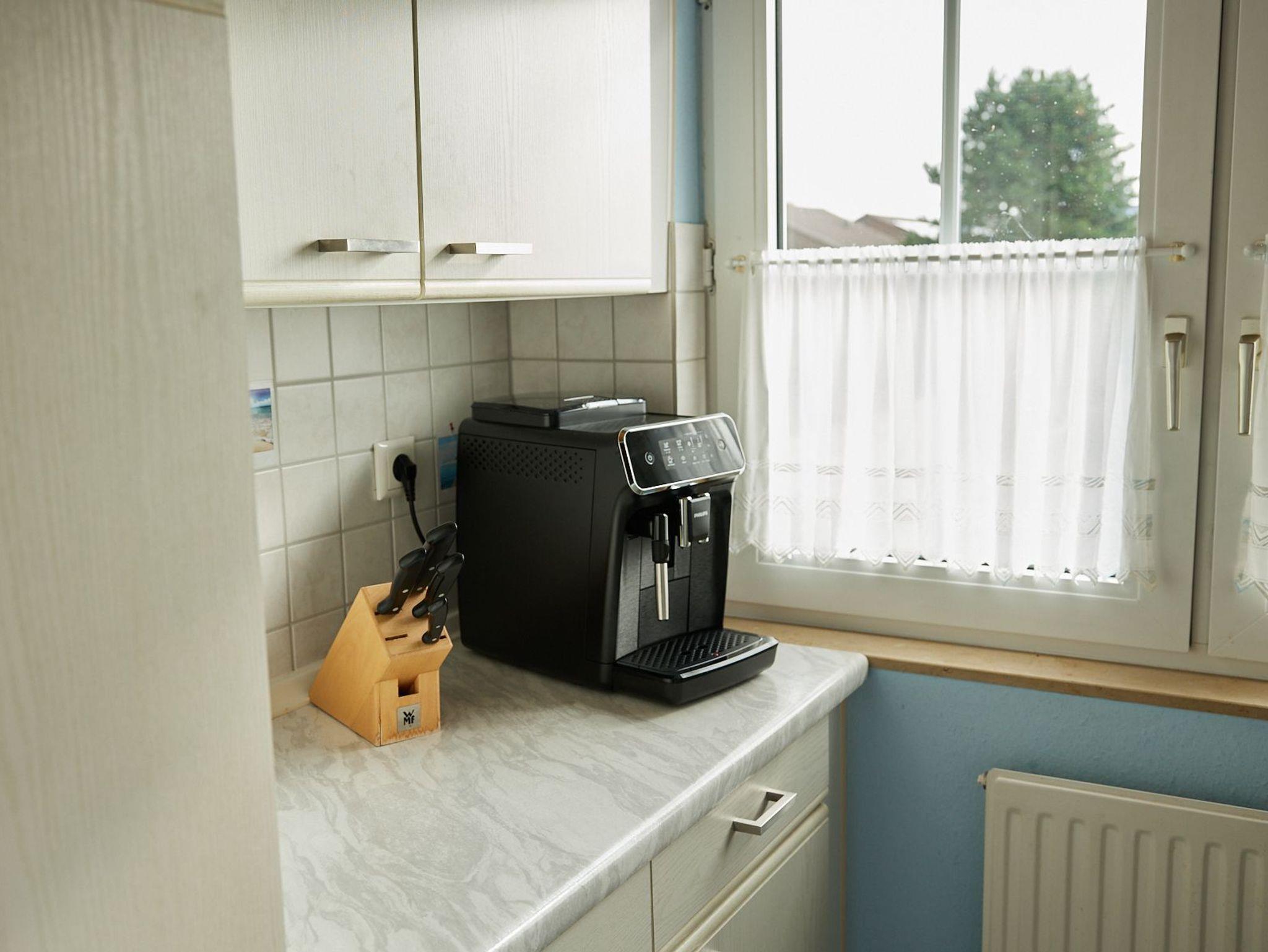 eine moderne Küchenzeile Kühlschrank, Herd, Backofen, Toaster und Kaffee-Padmaschine