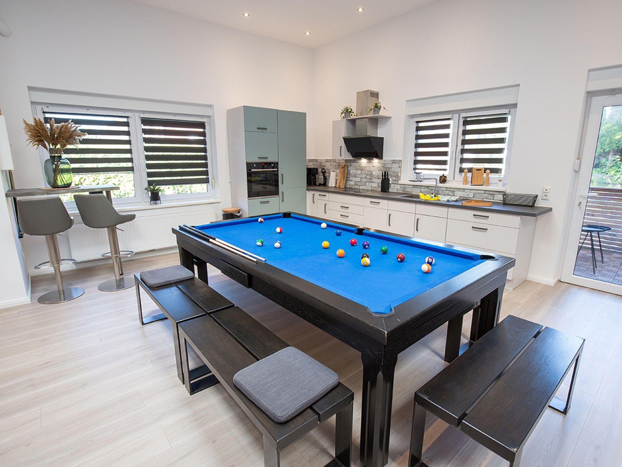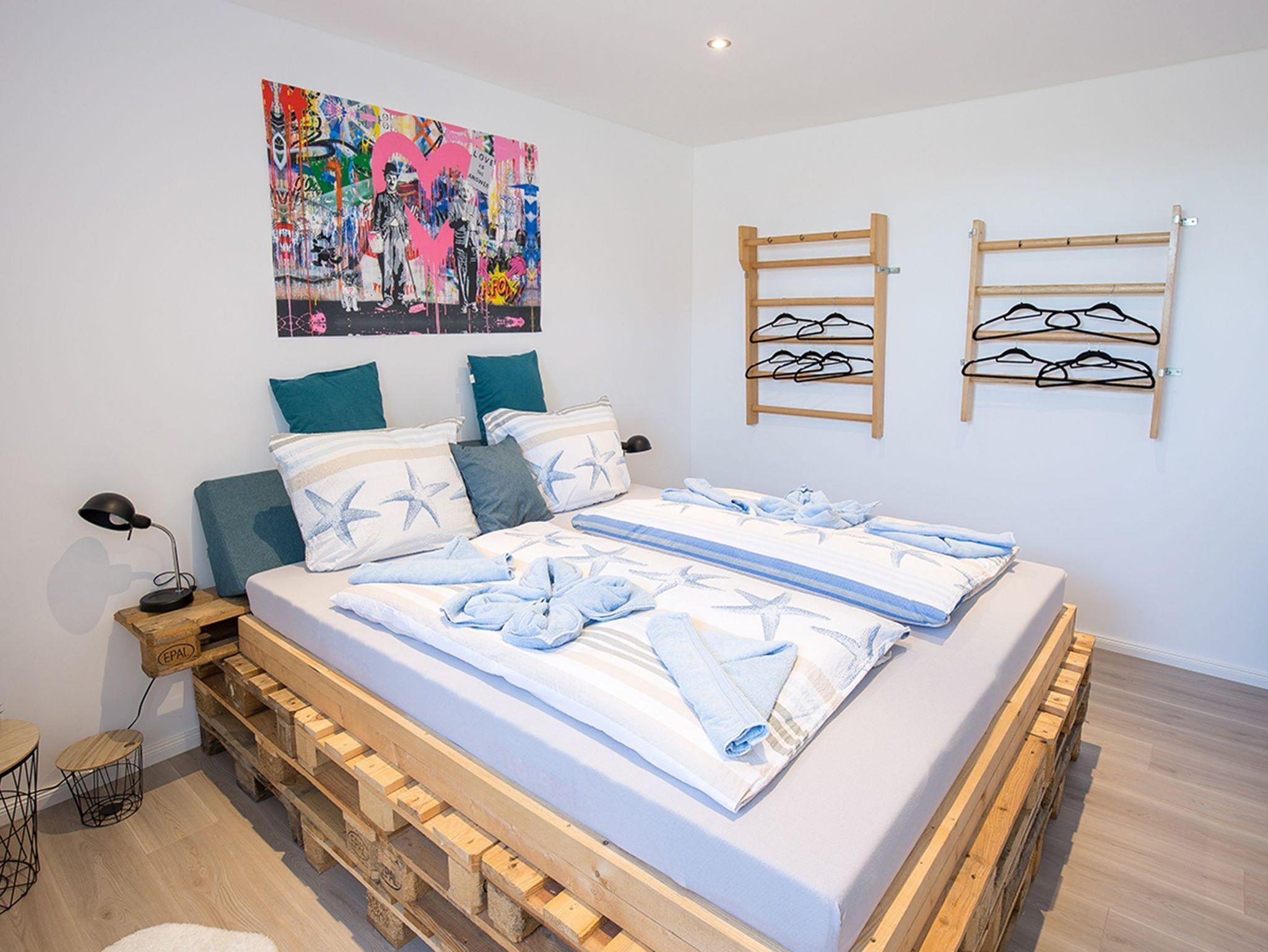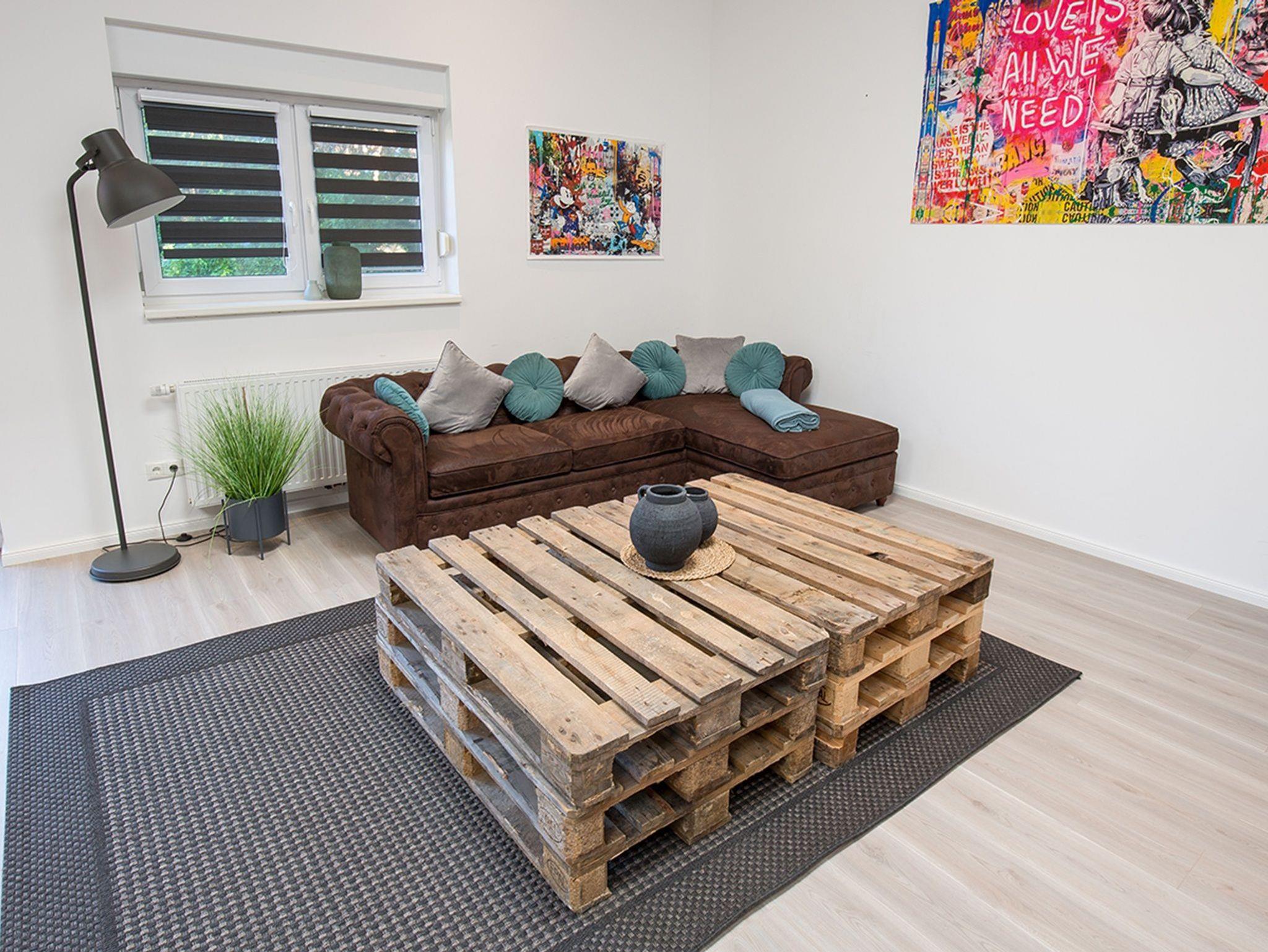 Herzlich Willkommen in unserer Ferienwohnung Jonte mit Loftcharakter - eigener Zugang sowie Balkon und Terrasse versprechen pure Erholung. Der komplette Innenbereich ist offen gehalten und vermittelt insgesamt ein tolles Raumgefühl. Er bietet alles auf modernstem Niveau. Beginnend mit der Garderobe geht es rechts herum zur schicken Küchenzeile mit großem vorgelagerten Essbereich. Der funktionale Esstisch lädt zu einer Partie Billard ein. Rechts befindet sich die gemütliche ausziehbare Couch. Das moderne Bad mit Walk-In-Regendusche und Flacheinstieg hat eine Sauna. Sodann geht es hoch auf die Schlafempore, welche offen und nicht abgesichert über eine Palettentreppe erreichbar ist - hier erwartet Sie ein bequemes Doppelbett mit Garderobennische und einem weiterem TV-Gerät. Die Couch im Wohnbereich ist ausziehbar und bietet mit einer Liegefläche von 120x200 Platz für einen dritten Gast.