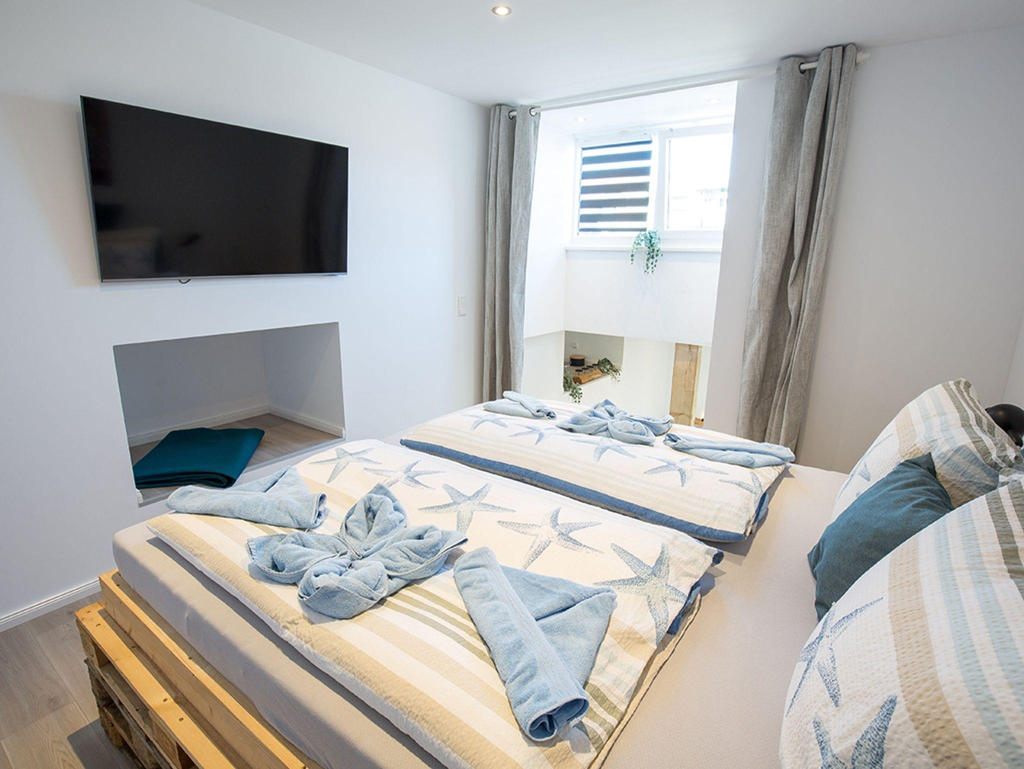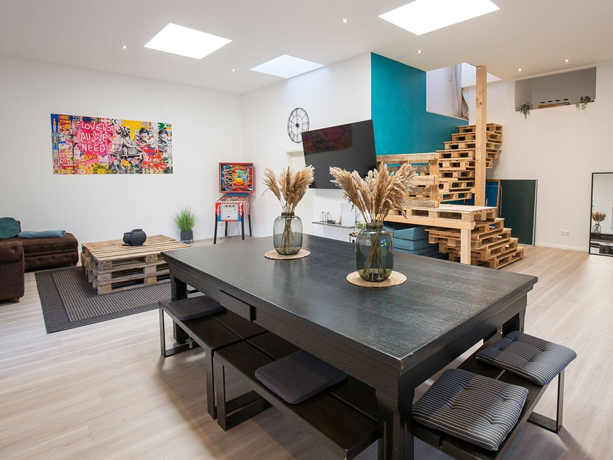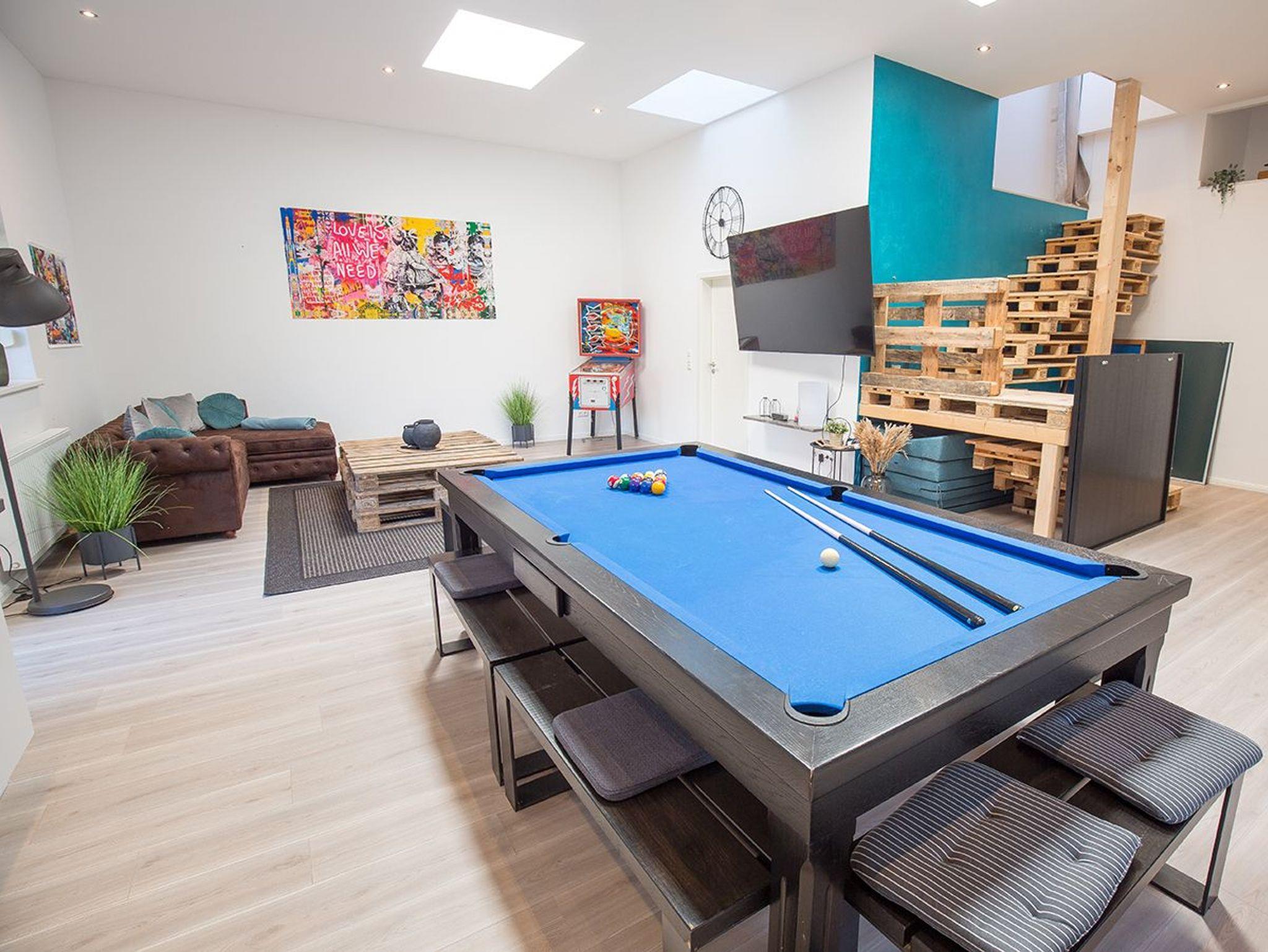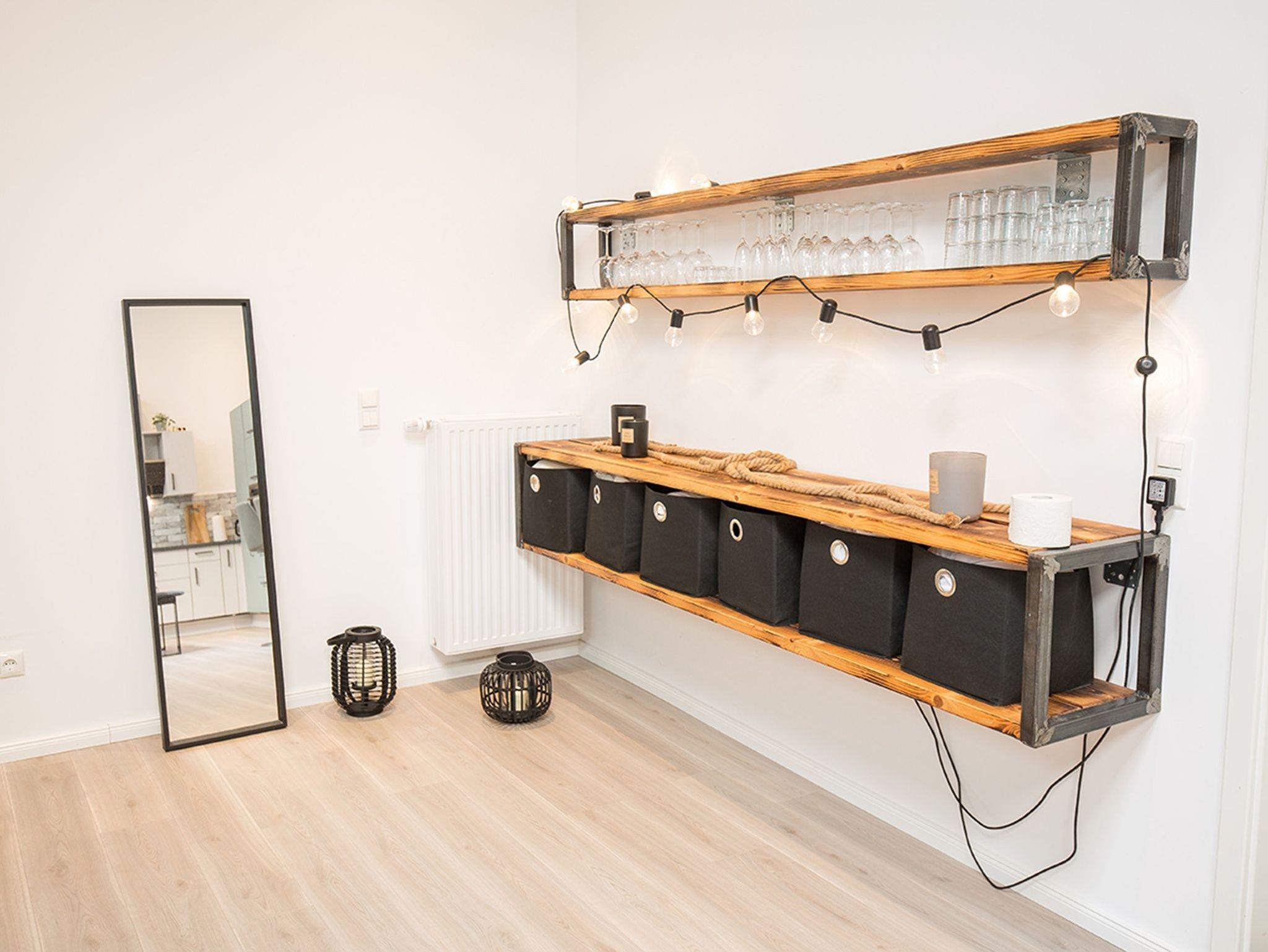 Herzlich Willkommen in unserer Ferienwohnung Jonte mit Loftcharakter - eigener Zugang sowie Balkon und Terrasse versprechen pure Erholung. Der komplette Innenbereich ist offen gehalten und vermittelt insgesamt ein tolles Raumgefühl. Er bietet alles auf modernstem Niveau. Beginnend mit der Garderobe geht es rechts herum zur schicken Küchenzeile mit großem vorgelagerten Essbereich. Der funktionale Esstisch lädt zu einer Partie Billard ein. Rechts befindet sich die gemütliche ausziehbare Couch. Das moderne Bad mit Walk-In-Regendusche und Flacheinstieg hat eine Sauna. Sodann geht es hoch auf die Schlafempore, welche offen und nicht abgesichert über eine Palettentreppe erreichbar ist - hier erwartet Sie ein bequemes Doppelbett mit Garderobennische und einem weiterem TV-Gerät. Die Couch im Wohnbereich ist ausziehbar und bietet mit einer Liegefläche von 120x200 Platz für einen dritten Gast.
