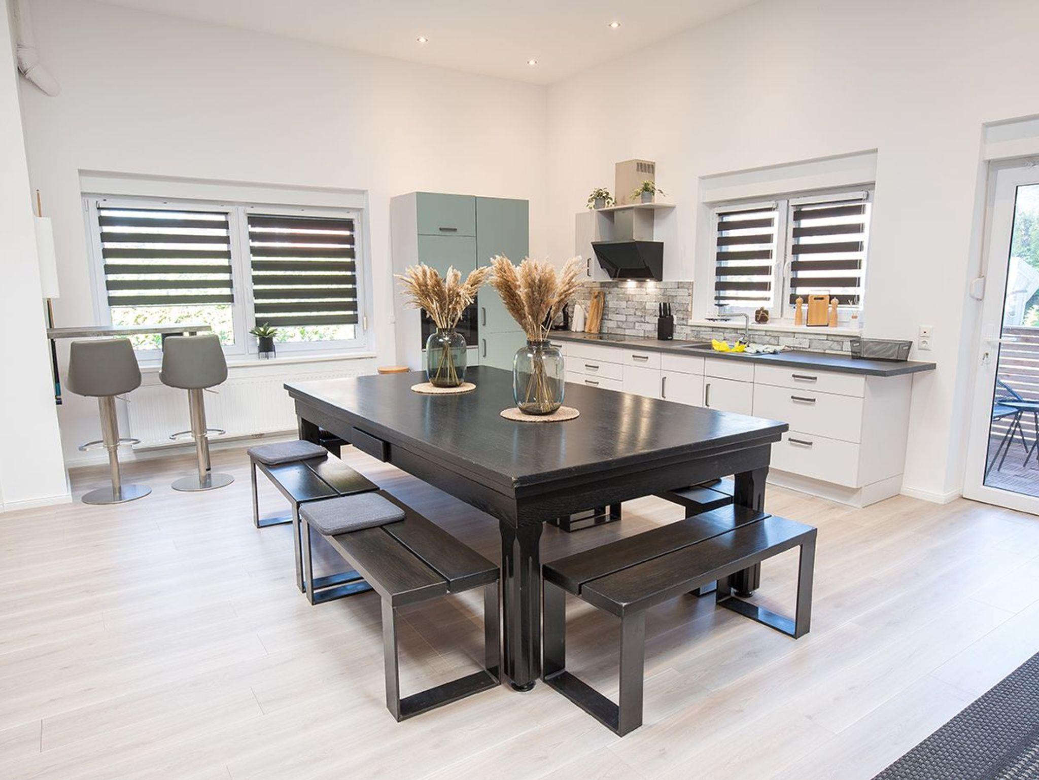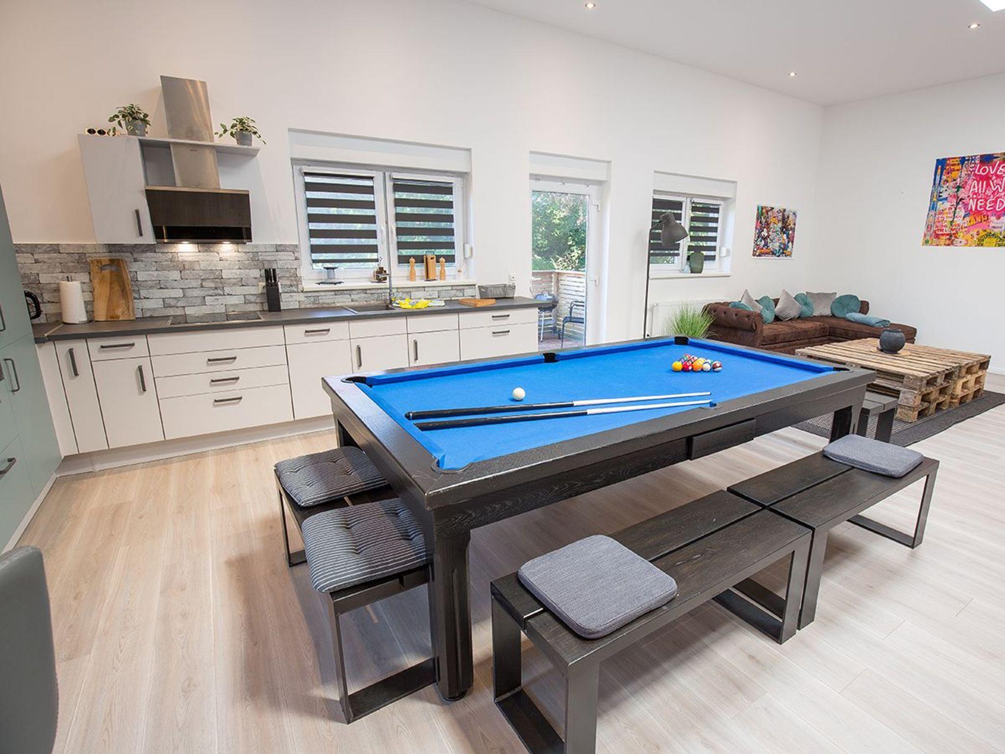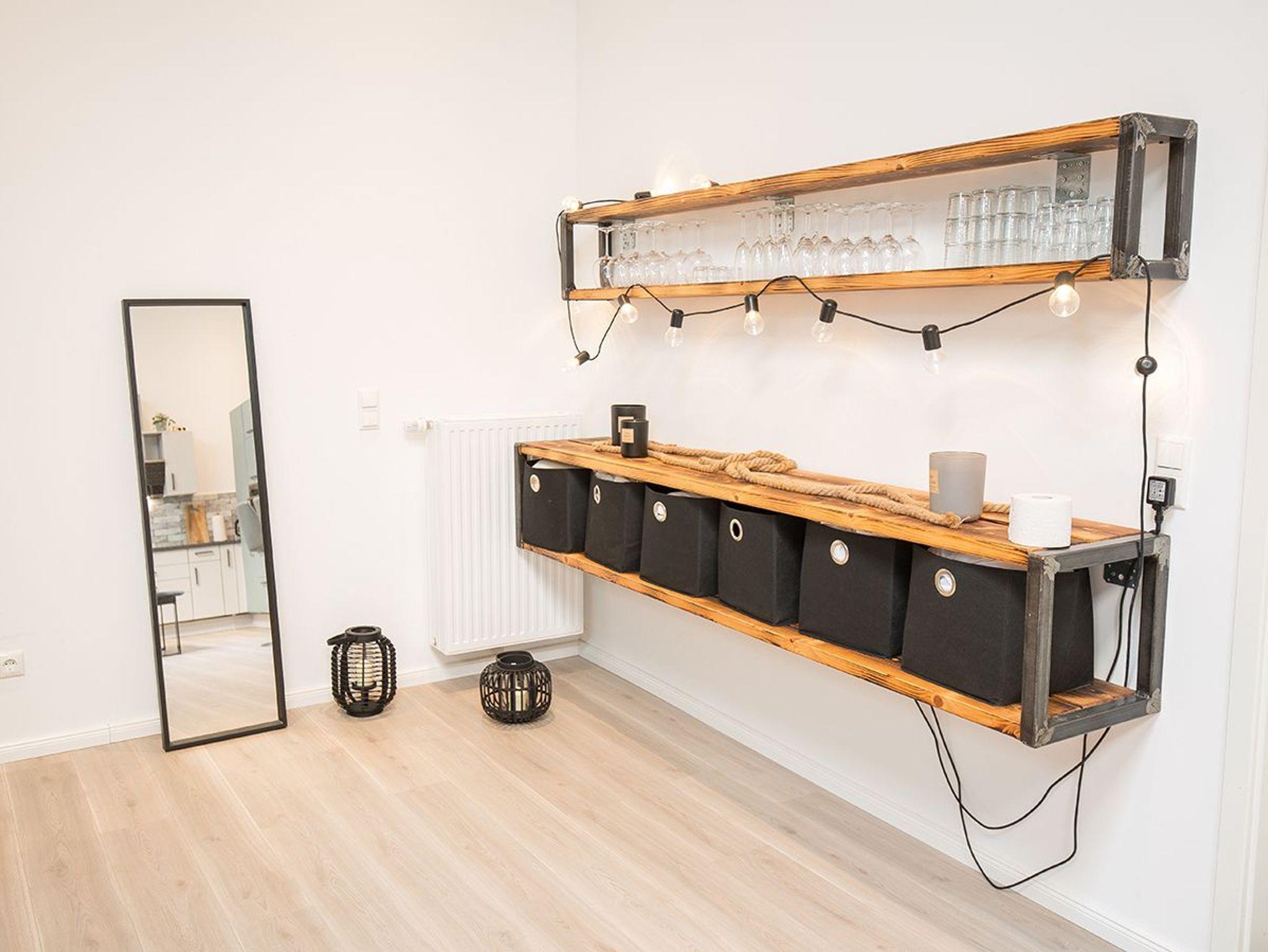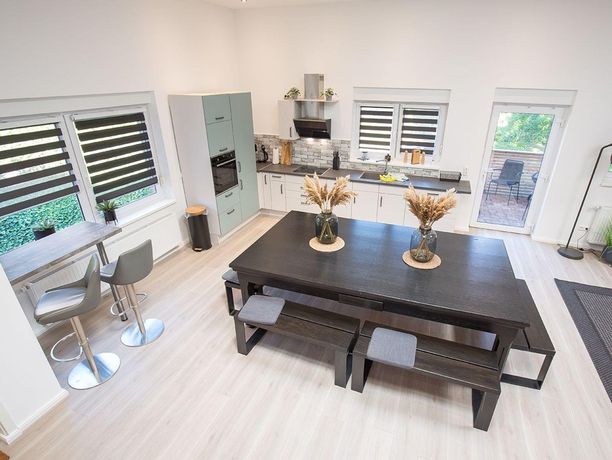 Herzlich Willkommen in unserer Ferienwohnung Jonte mit Loftcharakter - eigener Zugang sowie Balkon und Terrasse versprechen pure Erholung. Der komplette Innenbereich ist offen gehalten und vermittelt insgesamt ein tolles Raumgefühl. Er bietet alles auf modernstem Niveau. Beginnend mit der Garderobe geht es rechts herum zur schicken Küchenzeile mit großem vorgelagerten Essbereich. Der funktionale Esstisch lädt zu einer Partie Billard ein. Rechts befindet sich die gemütliche ausziehbare Couch für eine Person. Das moderne Duschbad hat eine Saunakabine. Sodann geht es hoch auf die Schlafempore - hier erwartet Sie ein bequemes Doppelbett mit Garderobennische und weiterem TV-Gerät. Die Couch im Wohnbereich ist ausziehbar und bietet mit einer Liegefläche von 120x200 Platz für einen dritten Gast.
