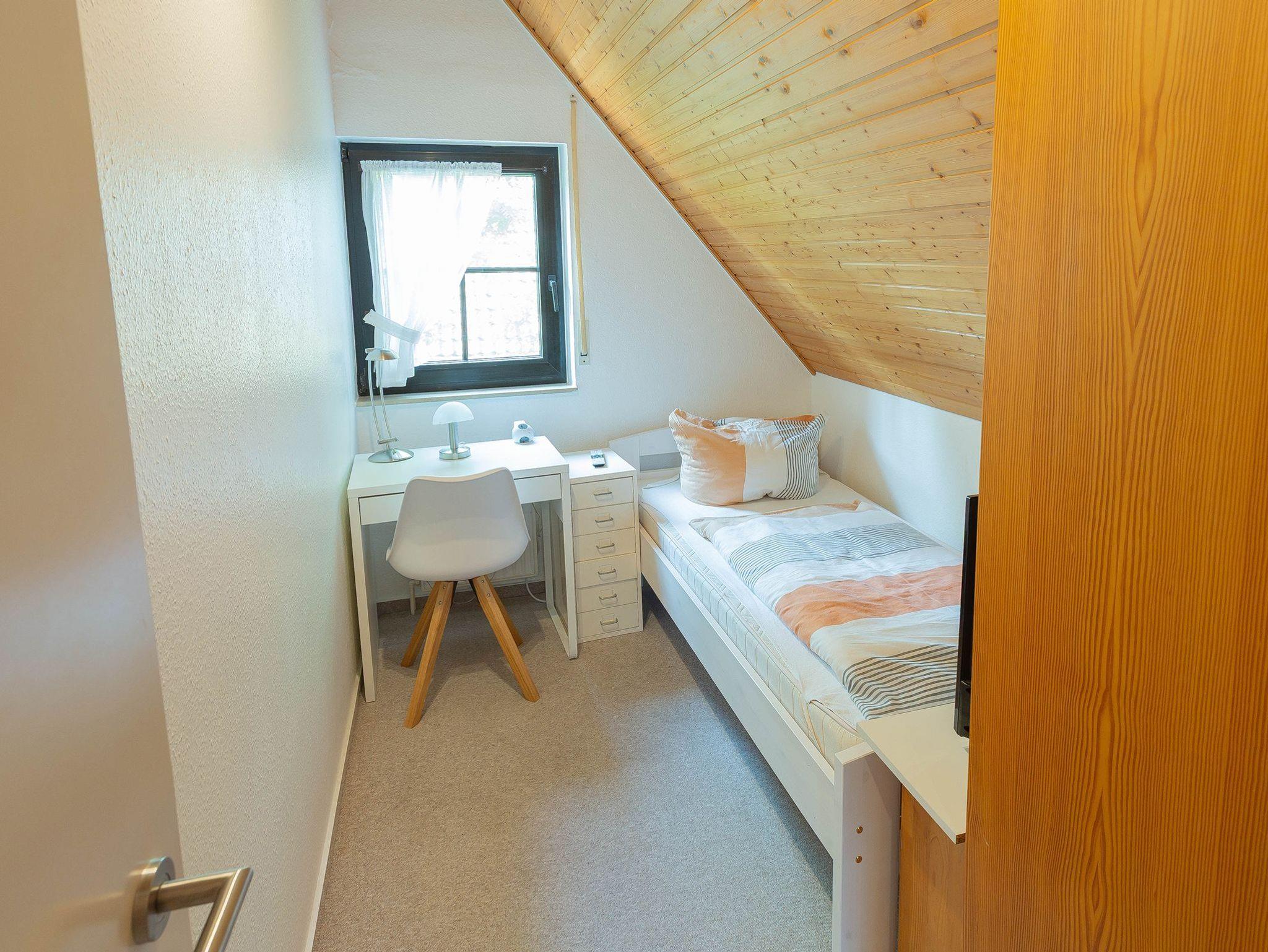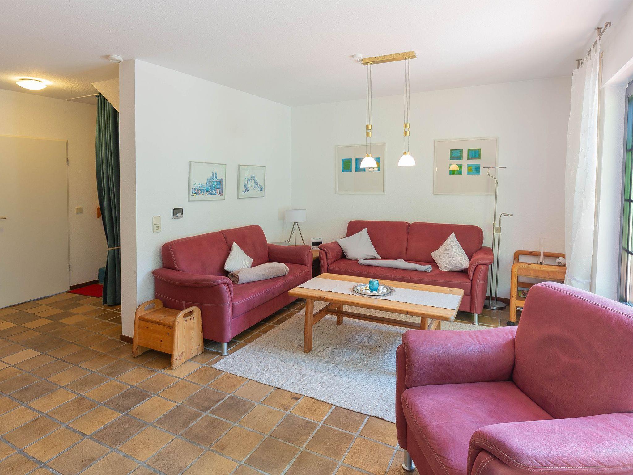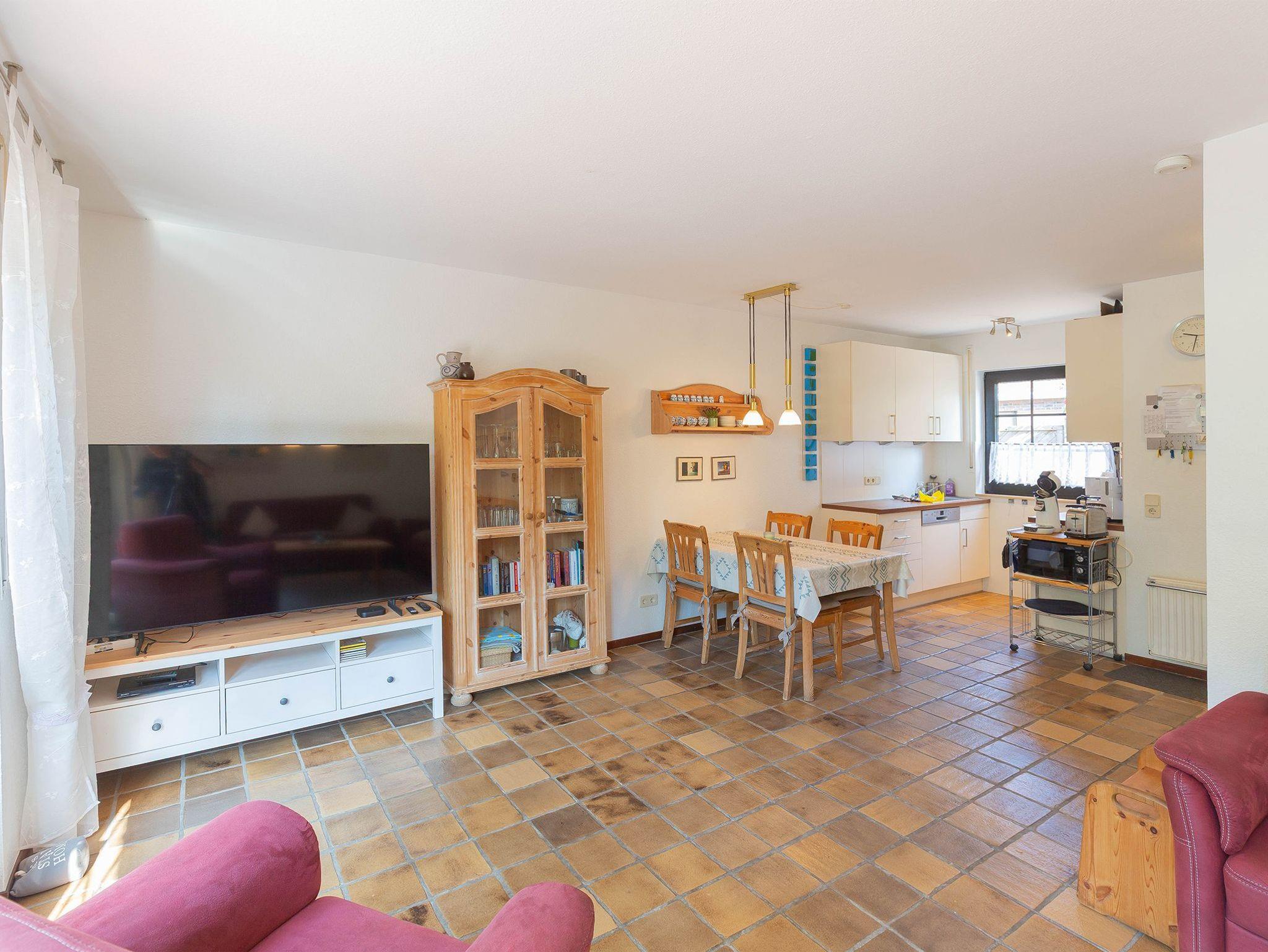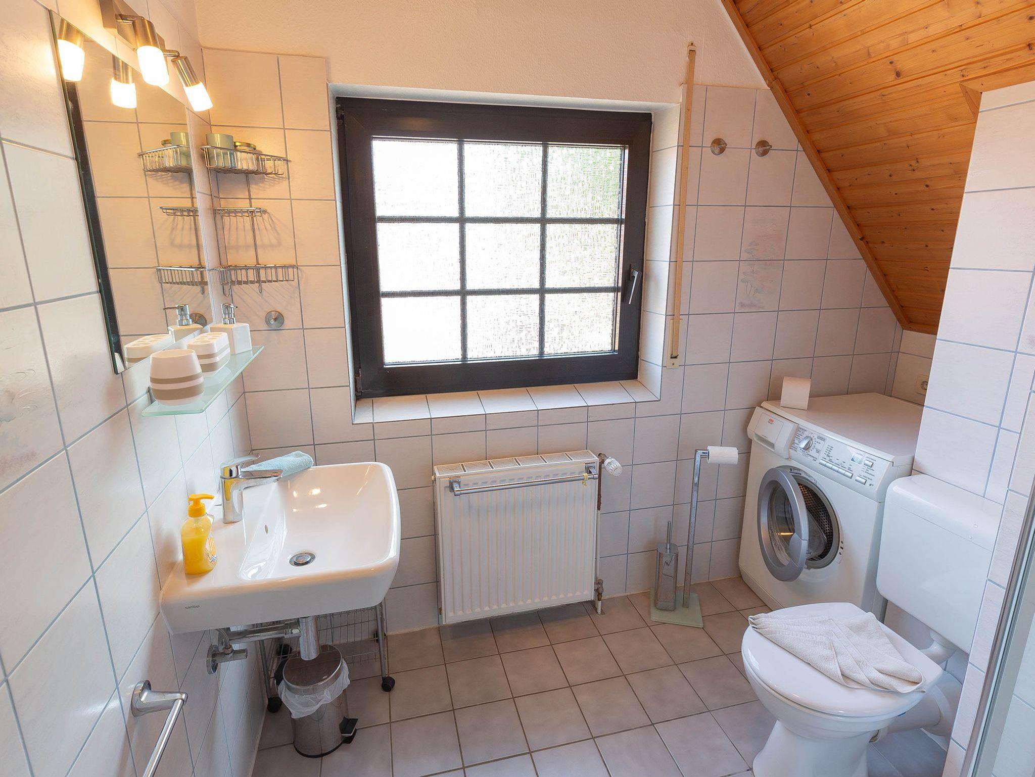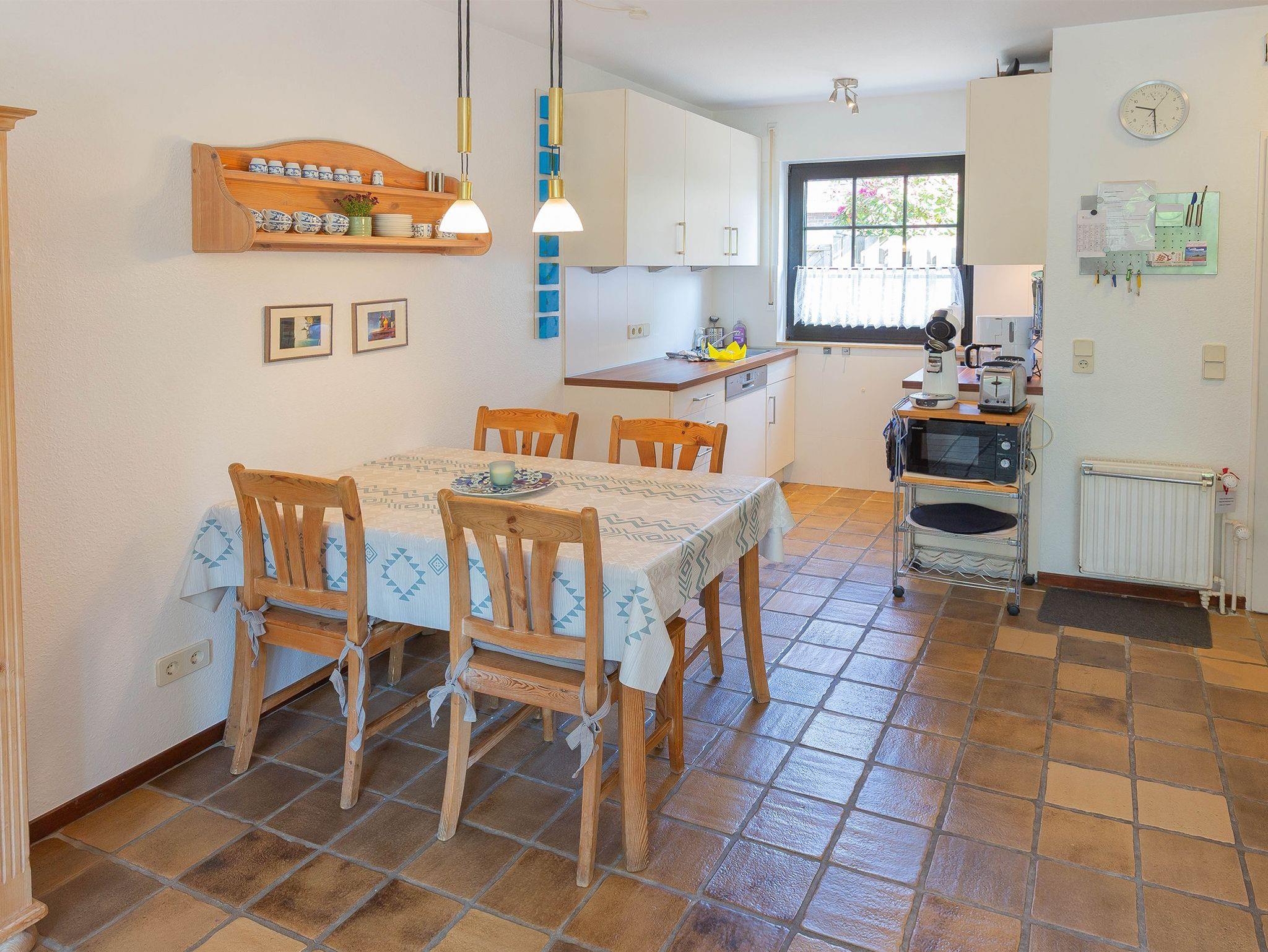 Sie betreten das Ferienhaus durch den Windfang mit Gäste-WC und Garderobe und gelangen in einen großzügigen Wohn- und Essbereich mit offener schicker Küchenzeile, die alles an Ausstattung für ein entspanntes Kochen bietet. Der Wohnbereich hat Kachelboden mit Fußbodenheizung. Hier ist auch der Ausgang zur großen Südterrasse. Im Obergeschoss befinden sich drei Schlafräume sowie das helle Fenster-Duschbad mit Waschmaschine. Ihre Fahrräder können Sie im dafür vorgesehenen Abstellraum am Gebäude sicher unterstellen.
