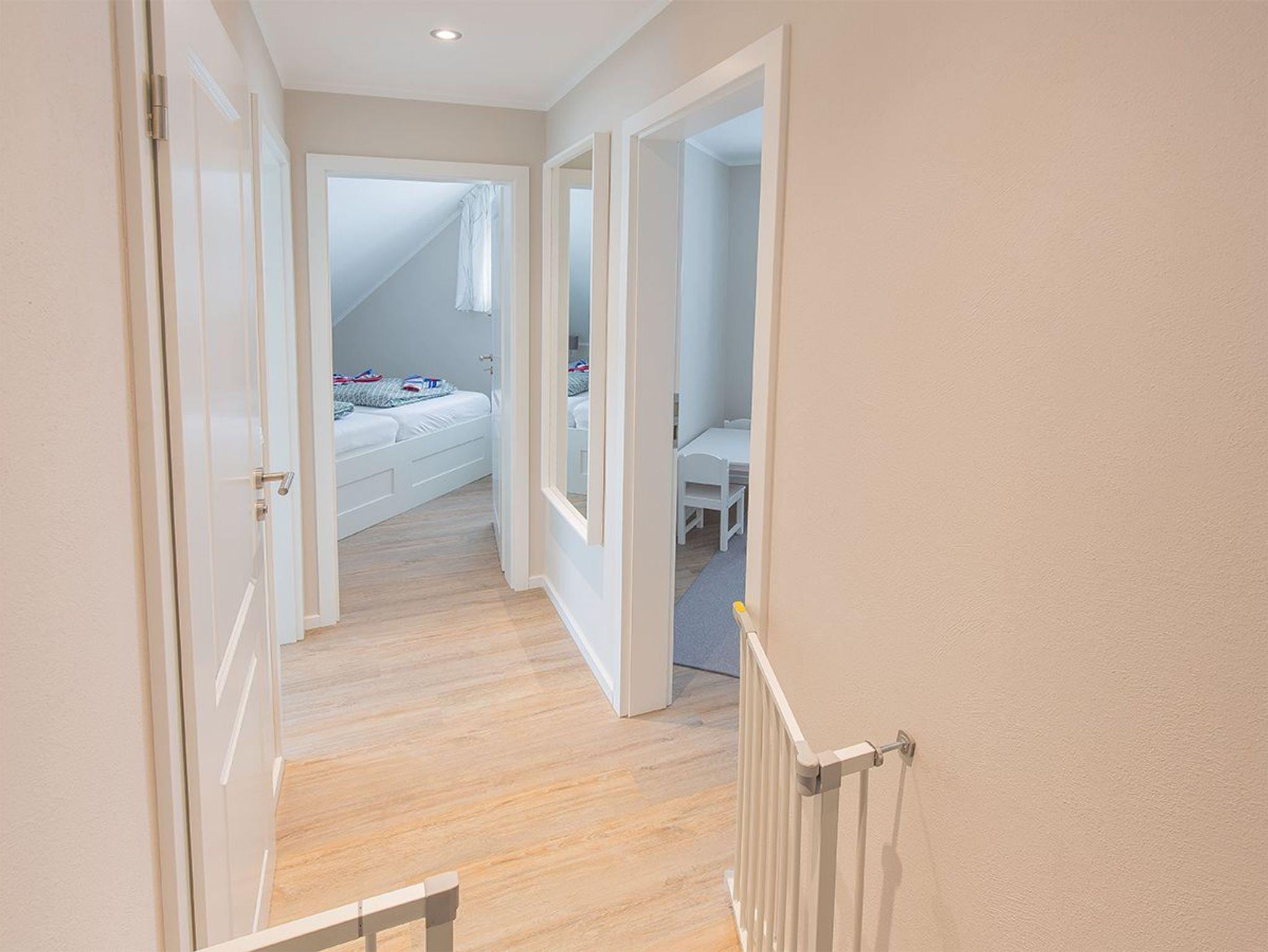 Das Ferienhaus Perlmuschel in der Danksteder Str. 23 B mit direktem Stellplatz vor dem Eingang ist ideal für bis zu acht Personen. Ab Diele mit Gäste-WC und dem ersten Duschbad gelangen Sie nach links in das Wohnzimmer mit Terrassenausgang. Hier im Wohn-/Essbereich empfängt Sie ein frisch renovierter heller freundlicher Wohn/Essbereich. In der Küchenzeile finden Sie alle Utensilien für ein entspanntes Kochen. Im ersten OG liegen drei Schlafräume, zwei davon mit ausziehbarem Tandembett, einer mit Doppelbett - und jeweils mit Kleiderschränken eingerichtet. Auf dieser Ebene sind auch die beiden Duschbäder. Hinauf im Dachgeschoss befindet sich ein weiteres Doppelbettschlafzimmer. Im separaten Hauswirtschaftsraum sind Waschmaschine und Trockner untergebracht. Entspannen Sie im schönen Garten und ihrer Sauna zur Alleinnutzung.