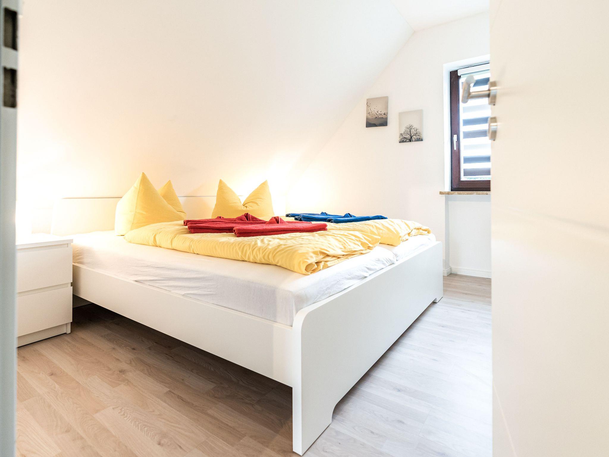 Eine Treppe führt Sie hinauf in die Maisonette-Ebene. Hier befindet sich das zweite Schlafzimmer mit Doppelbett. Das Fenster-Duschbad entspricht dem neuesten Standard.