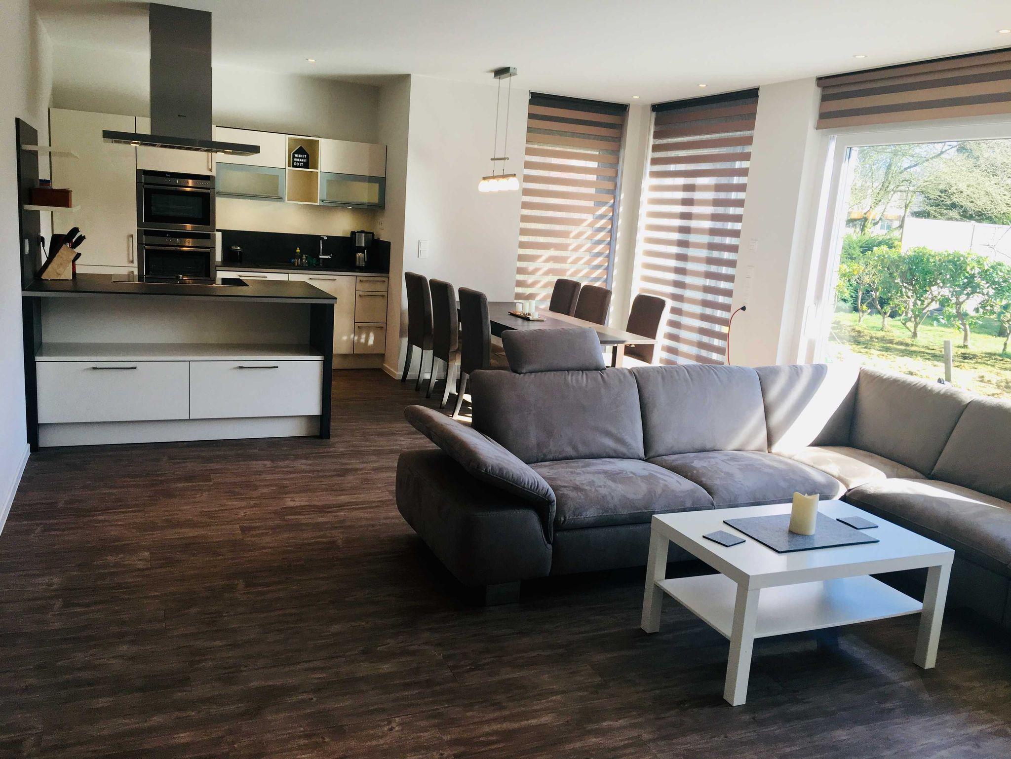Wir bieten Ihnen einen angenehmen Aufenthalt in einem modernen maritimen Ambiente. Der helle und moderne Wohn-/Essbereich ist großzügig und hochwertig ausgestattet. Die offene Komfort-Wohnküche mit Kochinsel ist mit Spülmaschine , großem Induktionsherd, Backofen, Mikrowelle sowie Geschirr, Besteck und diversen Kochutensilien komplett ausgestattet. Ein moderner Flachbildfernseher ist ebenfalls vorhanden.