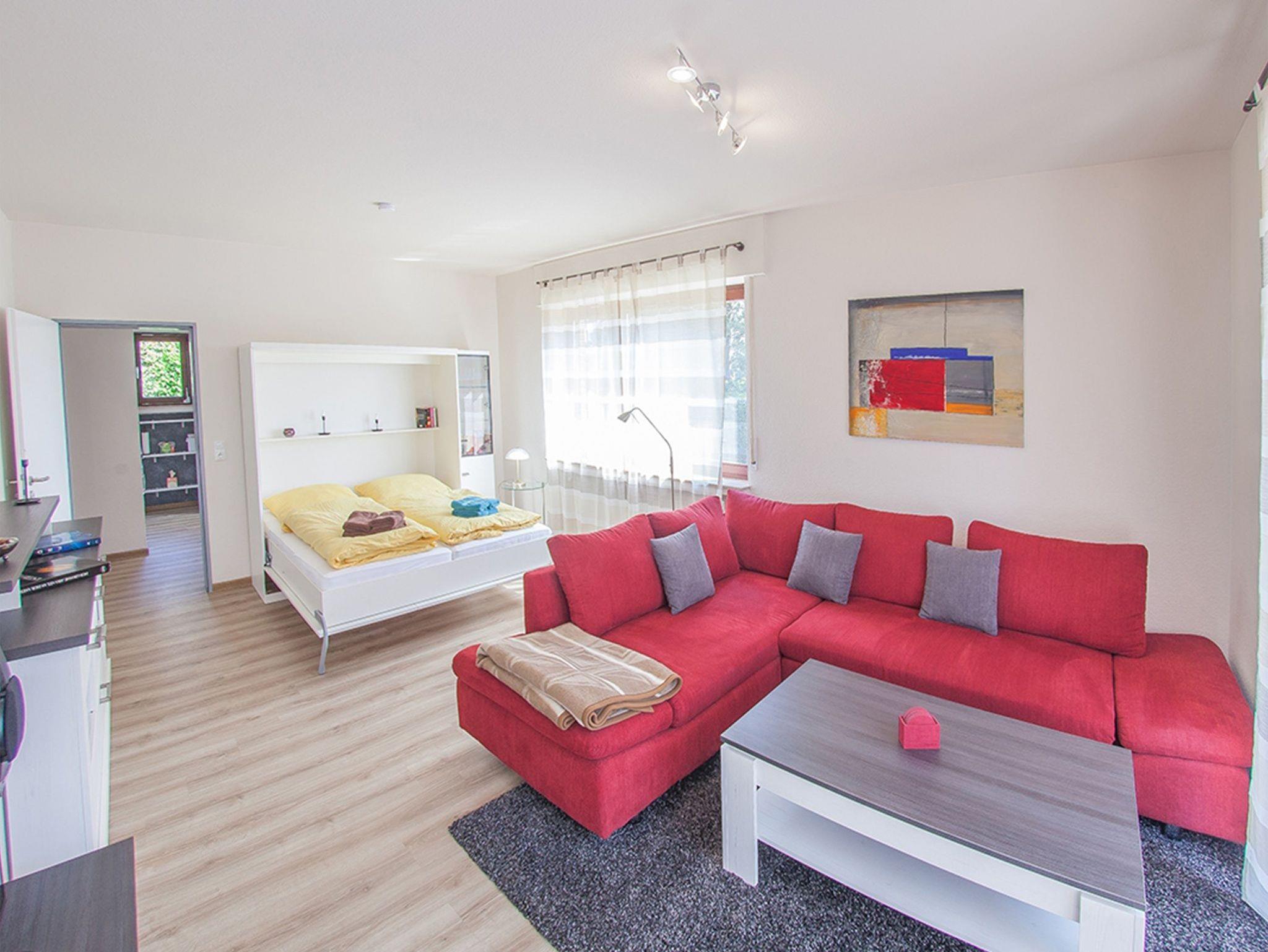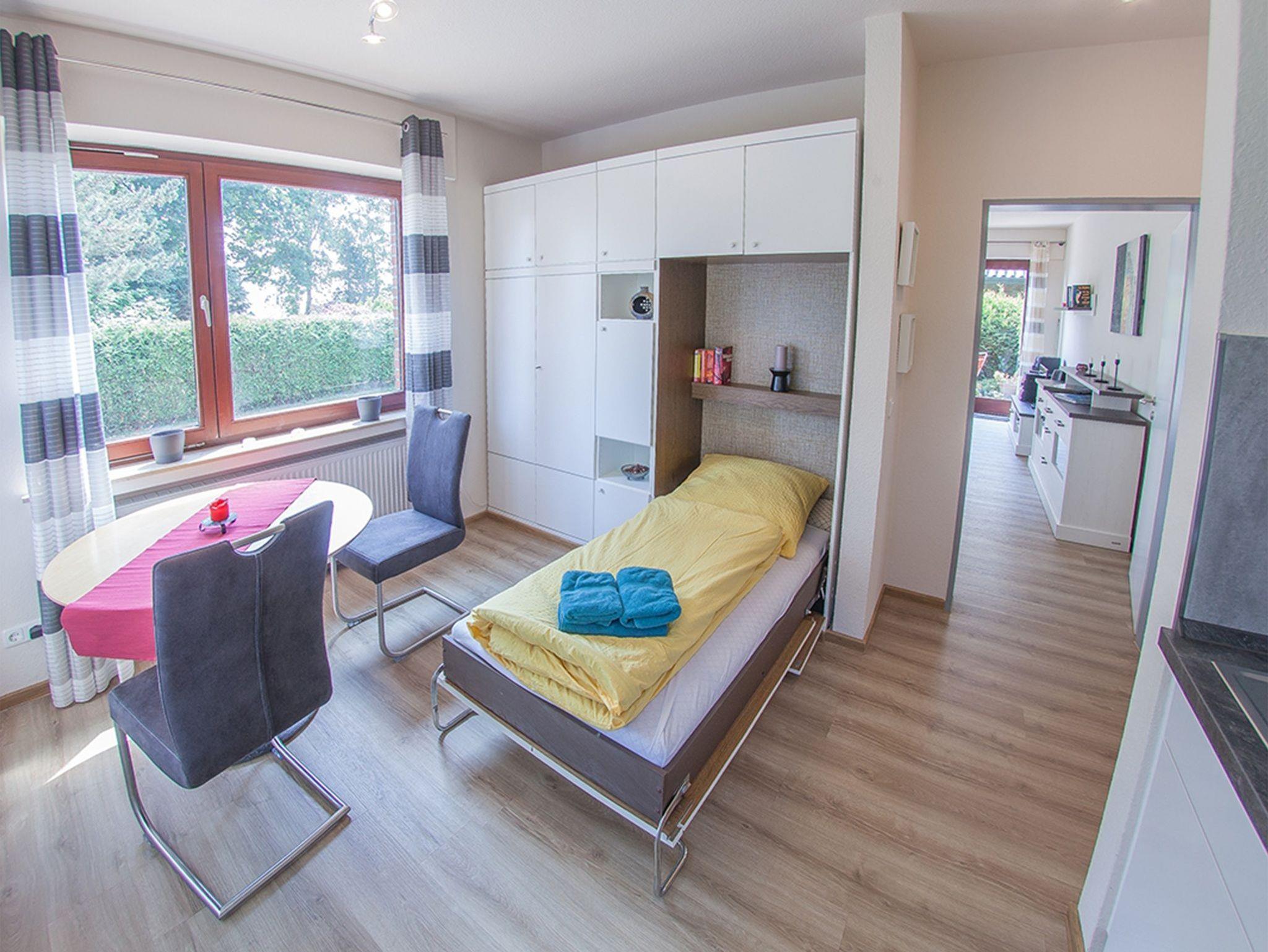 Herzlich Willkommen in unserer Ferienwohnung Albert . In Nähe des Strandes urlauben hier bis zu vier Personen in der modern möblierten Erdgeschosswohnung. Sie gelangen durch den Dielenbereich links zur hellen Küchenzeile mit vorgelagertem Essplatz und zwei geräumigen Wandschränken sowie geradeaus in das Wohn-/Schlafzimmer mit komfortablem Sitzbereich, einer Ausziehcouch und einem Schrankbett in 160x200 für zwei Personen. Wir halten ebenfalls ein weiteres Schrankbett für eine Person für Sie bereit. Entspannen können sie auf der eingegrünten, sichtgeschützten Terrasse mit Markise und Gartenmobiliar.