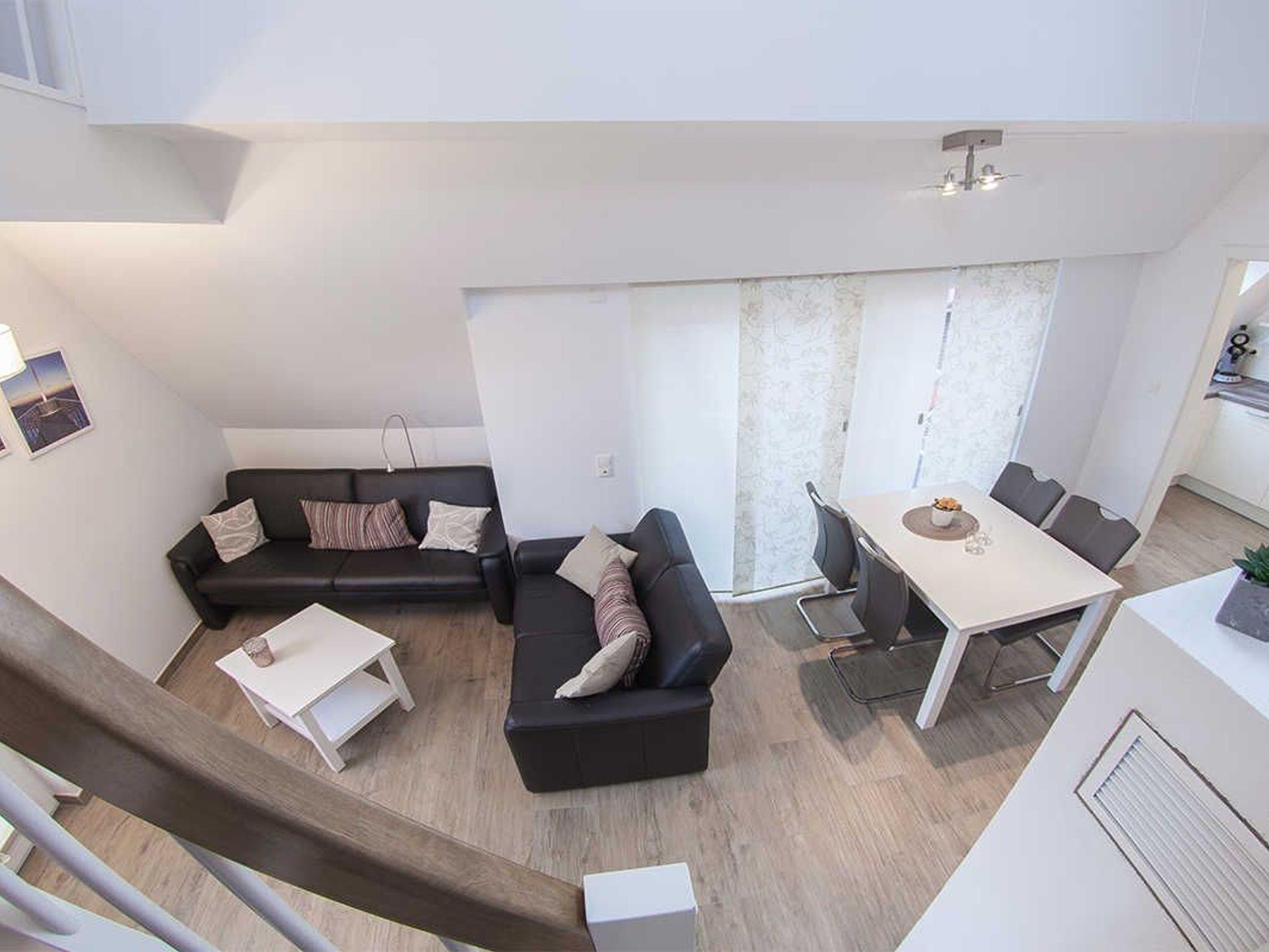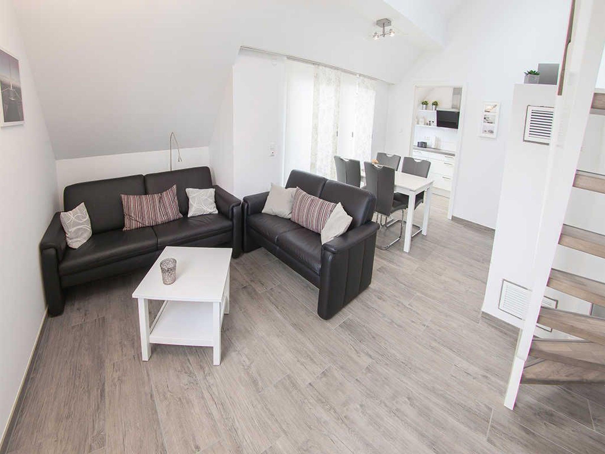 Eine Holztreppe führt Sie hinauf in die Maisonette-Ebene. Hier können Sie auf einer weiteren Sitzgelegenheit entspannen. Unsere zwei Schlafräume haben Doppelbetten und Kleiderschränke. Ein großes Fensterbad bietet reichlich Platz für Entspannung.