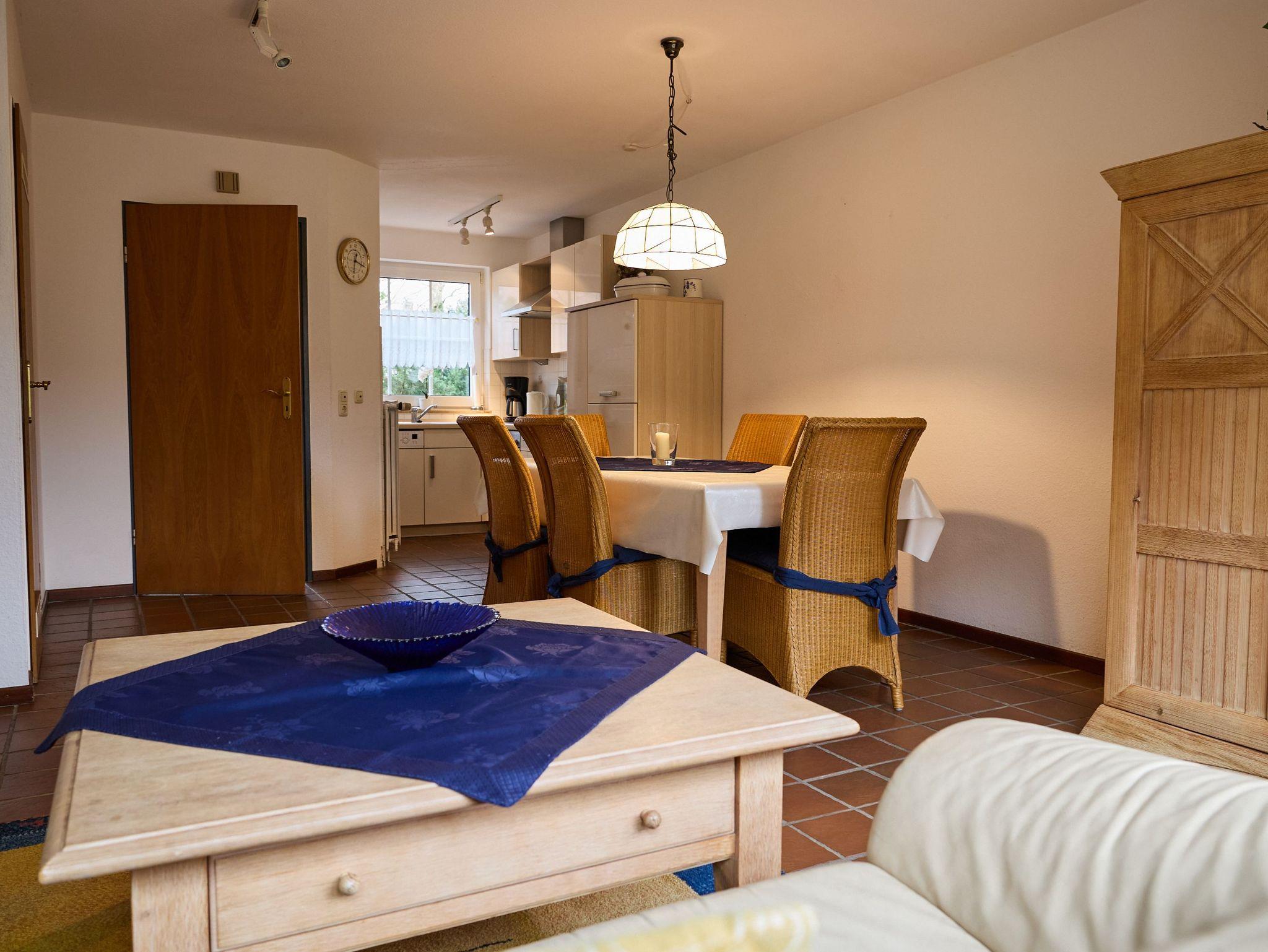 kombinierter Wohn- und Essbereich mit komplett ausgestatteter Einbauküche (u.a. Geschirrspülmaschine, Gefrierfach, Mikrowelle, Kaffeemaschine, Eierkocher, Toaster)