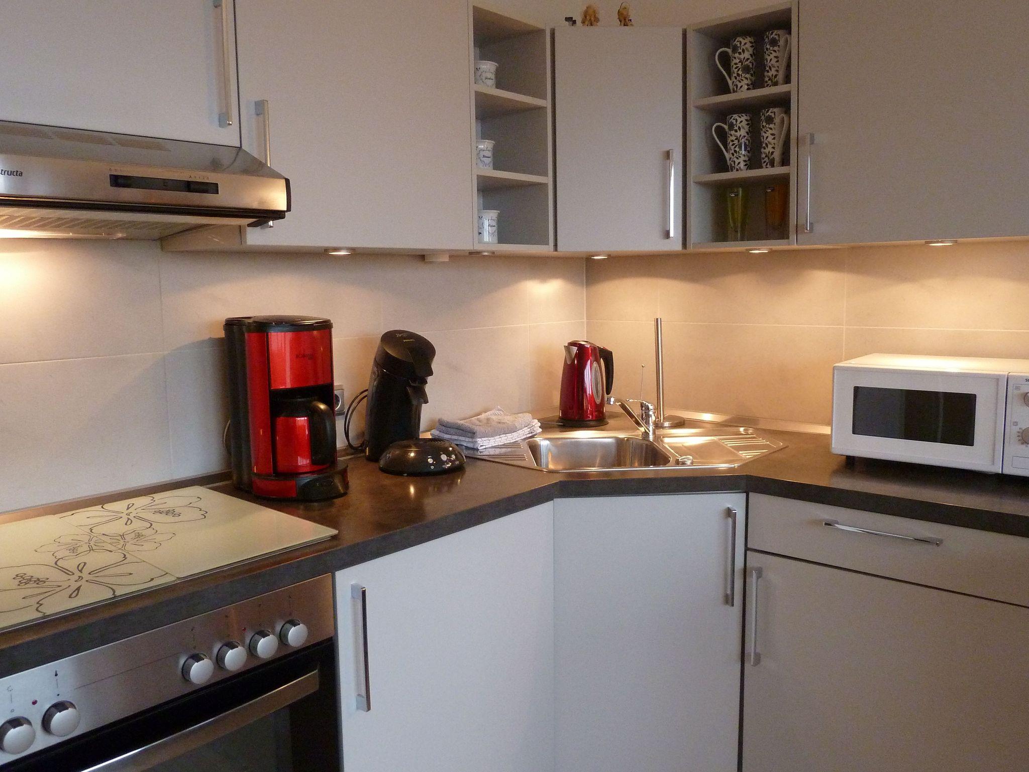 eine moderne Küchenzeile mit Kühlschrank, Wasserkocher, Pad-Maschine,