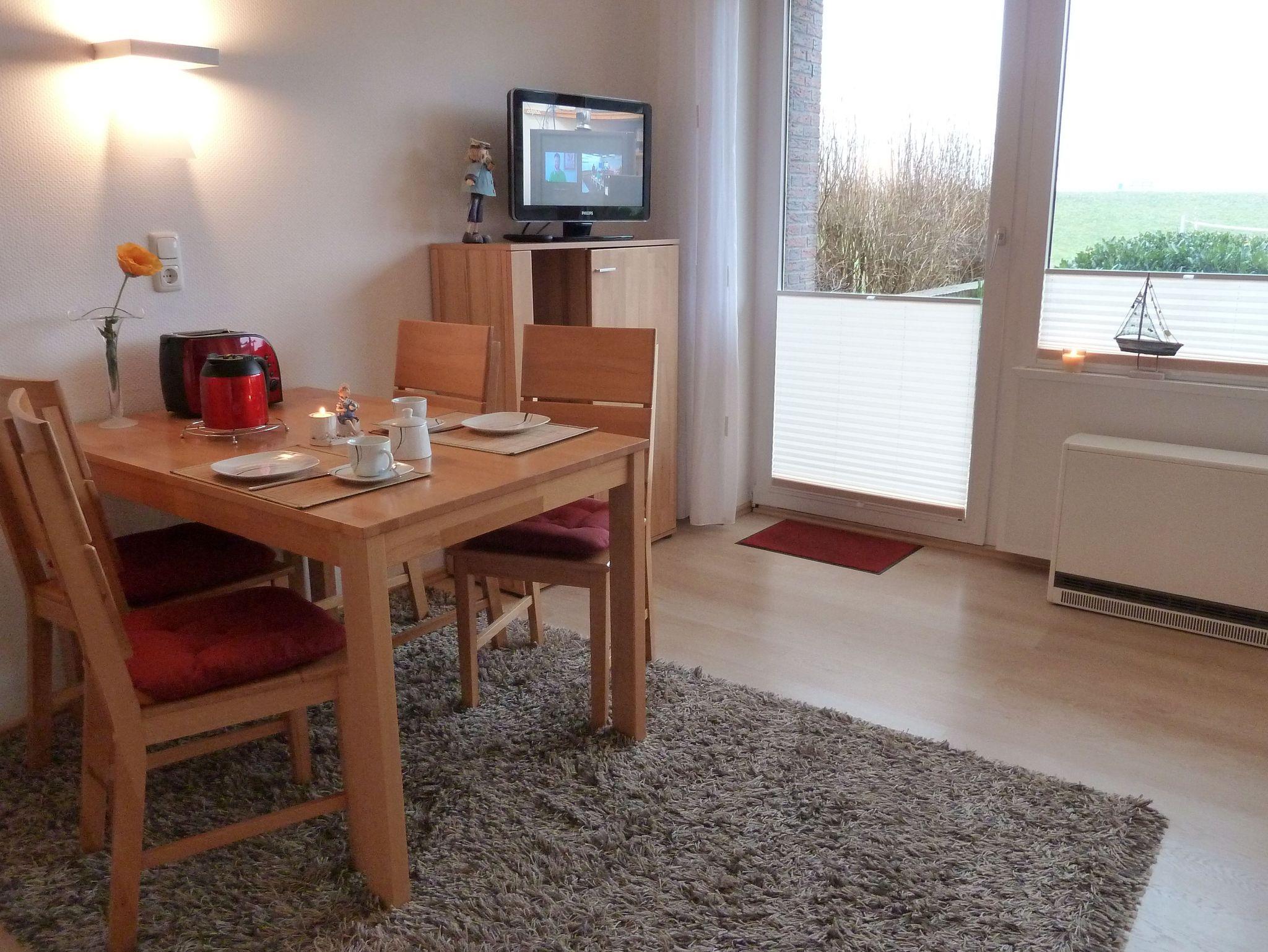 Komfortable 55 m² Ferienwohnung in Dangast mit Terrasse, moderner Küche und unverbautem Blick auf Deich und Seekurpark.