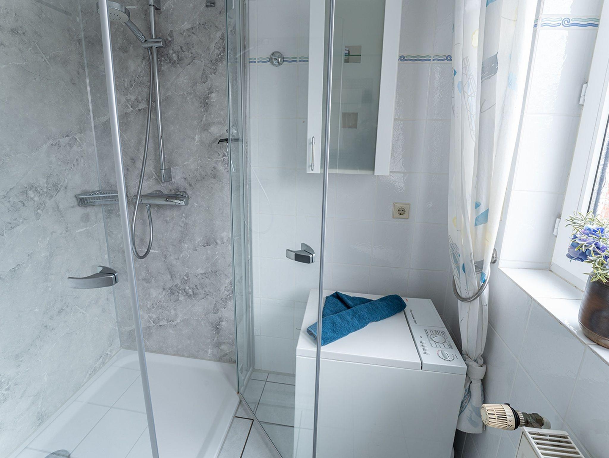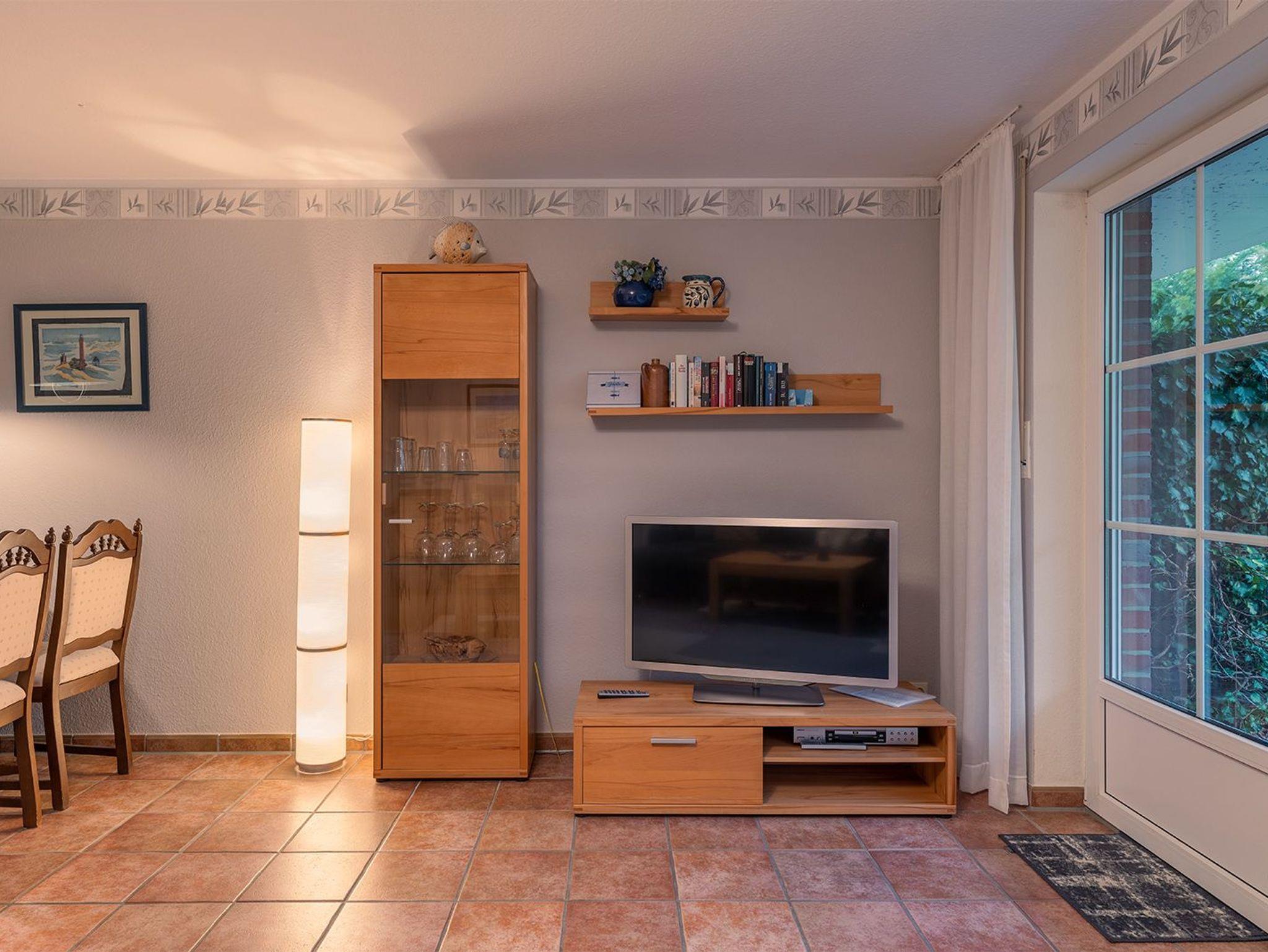 Sie betreten diese freundliche Ferienwohnung im Erdgeschoss durch eine geräumige Diele. Rechts gelegen das helle Fenster-Duschbad mit Waschmaschine. Eine separate Küche bietet Ihnen eine komplette Grundausstattung. Geradeaus geht es in den mediterran sonnig gestalteten Wohn-/Essbereich mit Flachbild-TV, DVD-Recorder und einer Auswahl an DVDs, Büchern und Spielen. Der Schlafraum hat Teppichboden und bietet ein bequemes Doppelbett in den Maßen 160x200 mit Kleiderschrank zusätzlichem Fernseher. Eine weitere Schlafgelegenheit für zwei Personen haben Sie auf dem ausziehbaren Sofa im Wohnzimmer. Entspannen Sie in der Ferienwohnung auf der Südterrasse mit Grillmöglichkeit. Die Terrasse und das Grundstück sind eingegrünt und nicht einsehbar.