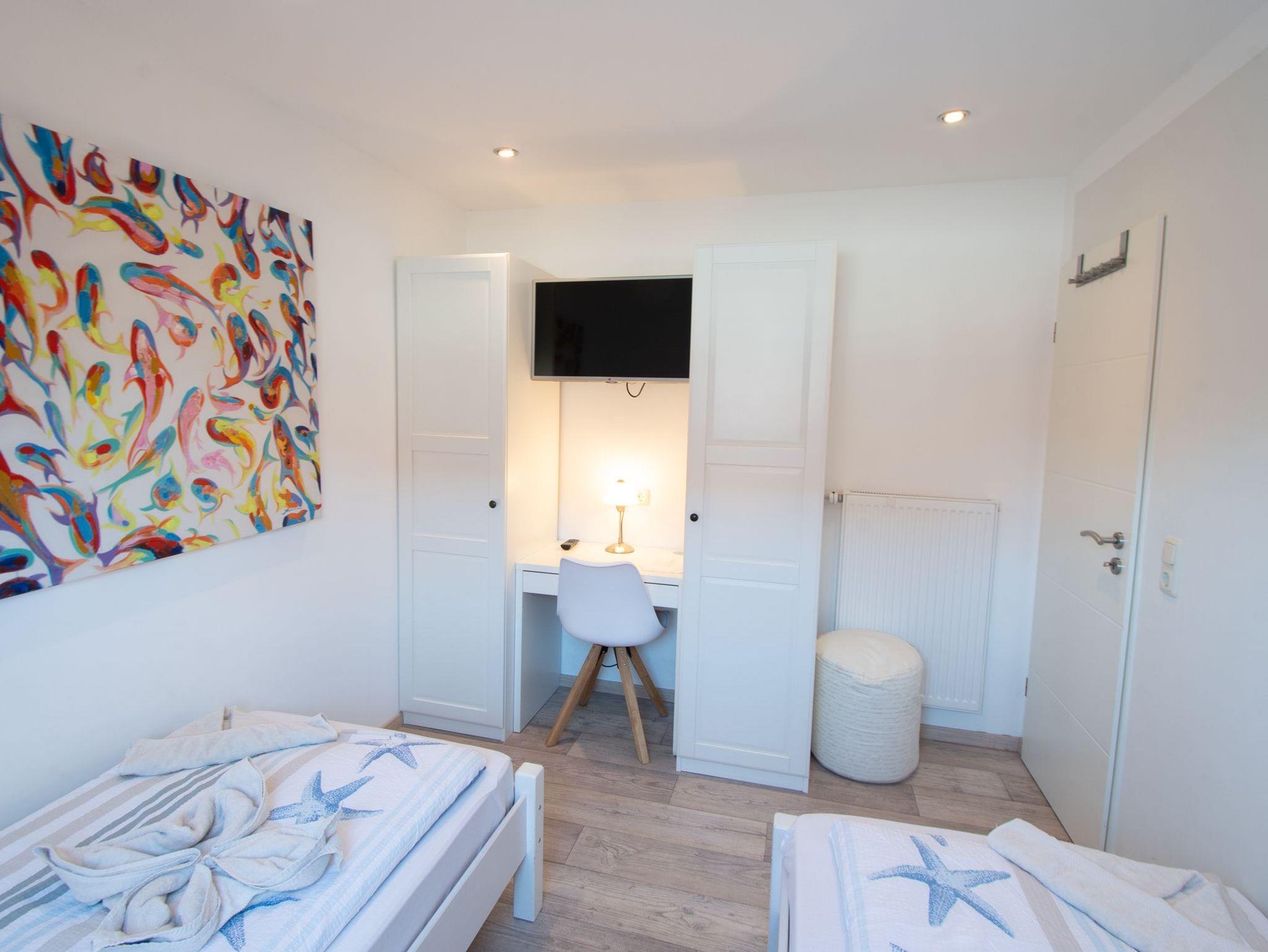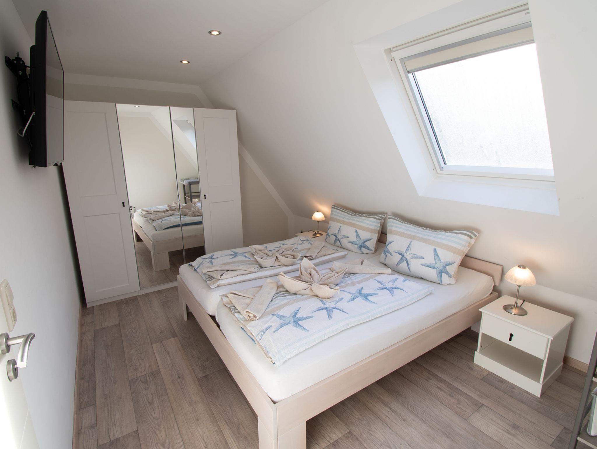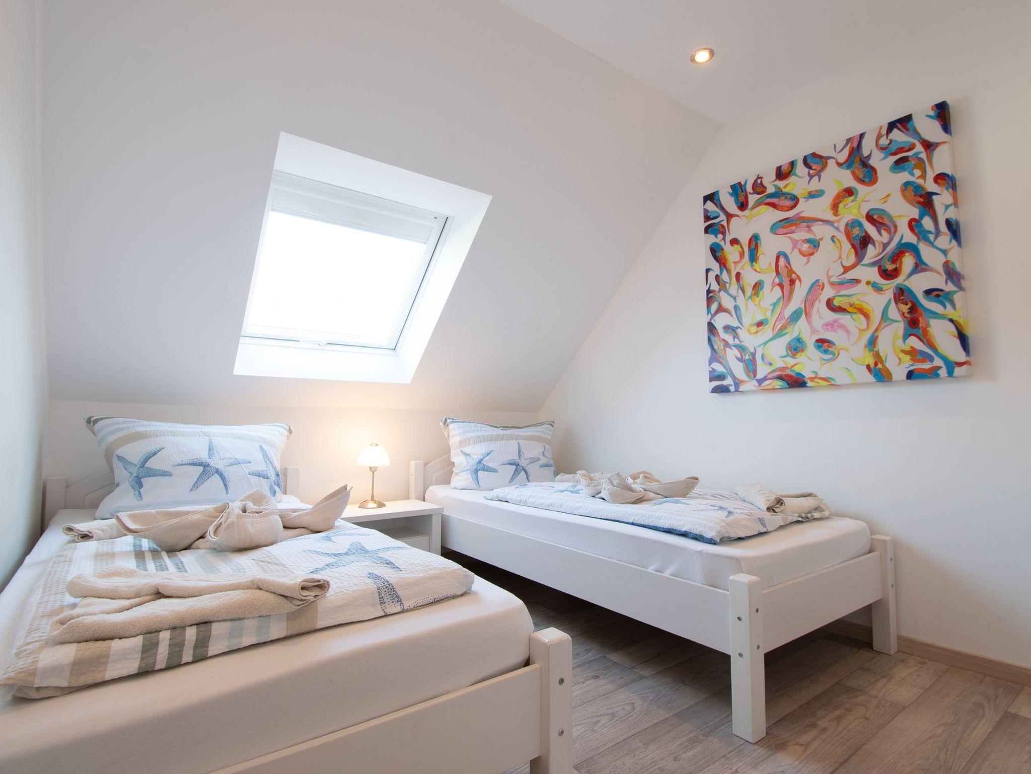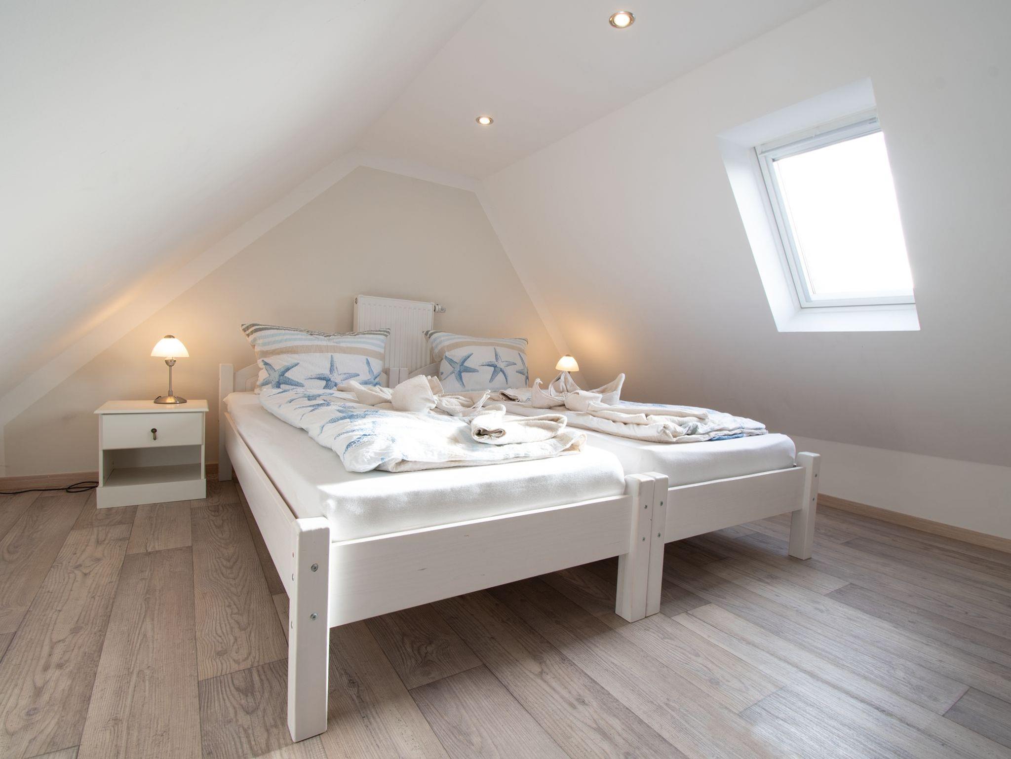 Ein weiteres geräumiges Schlafzimmer mit zwei Einzelbetten liegt im Dachgeschoss. Jedes Schlafzimmer hat ein eigenes TV-Gerät.
